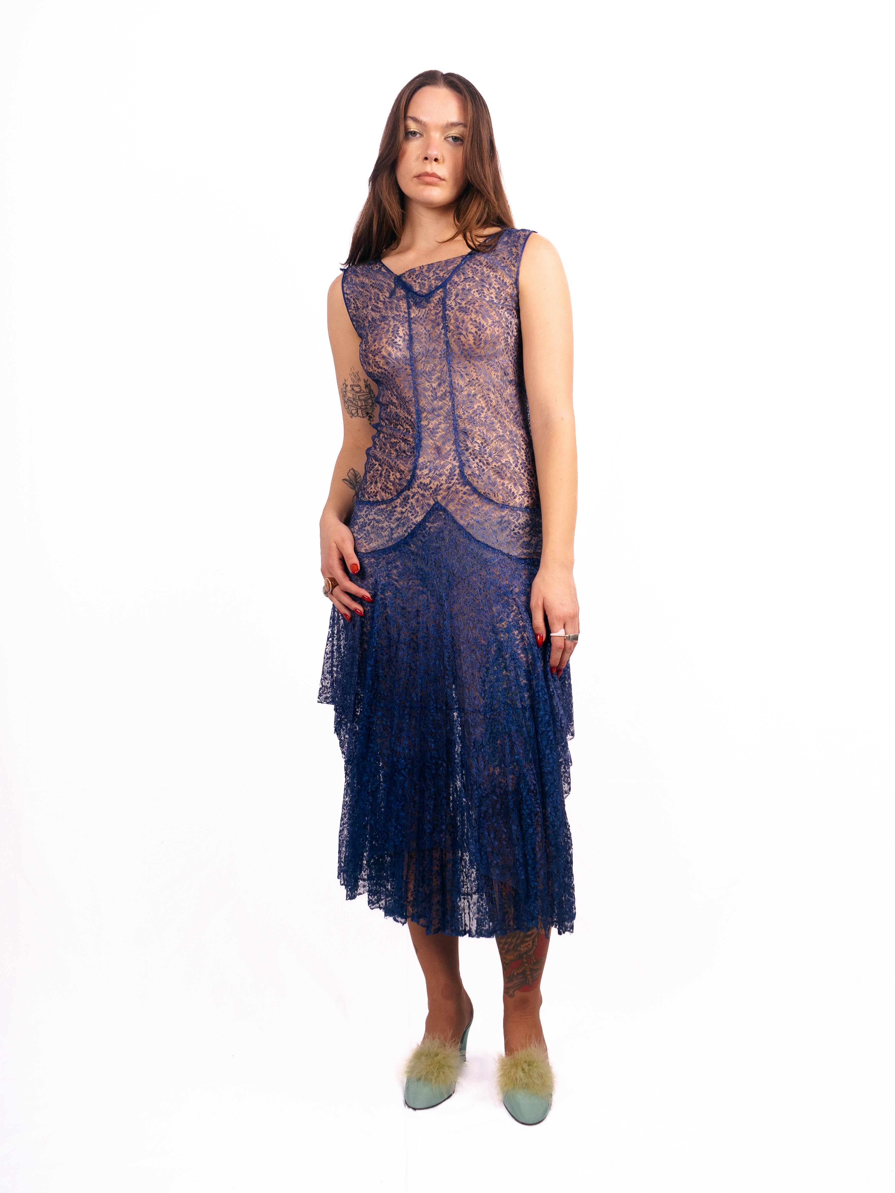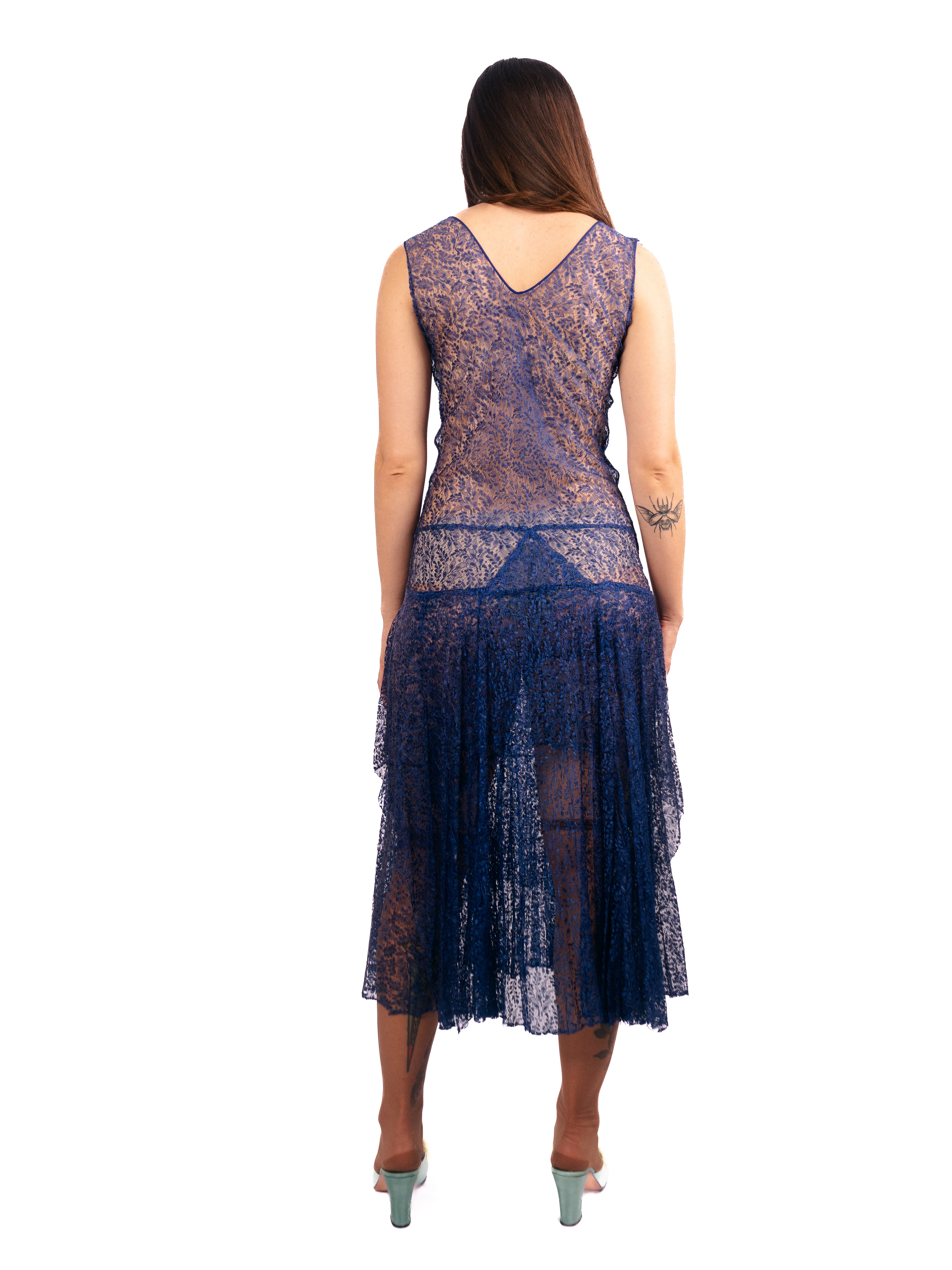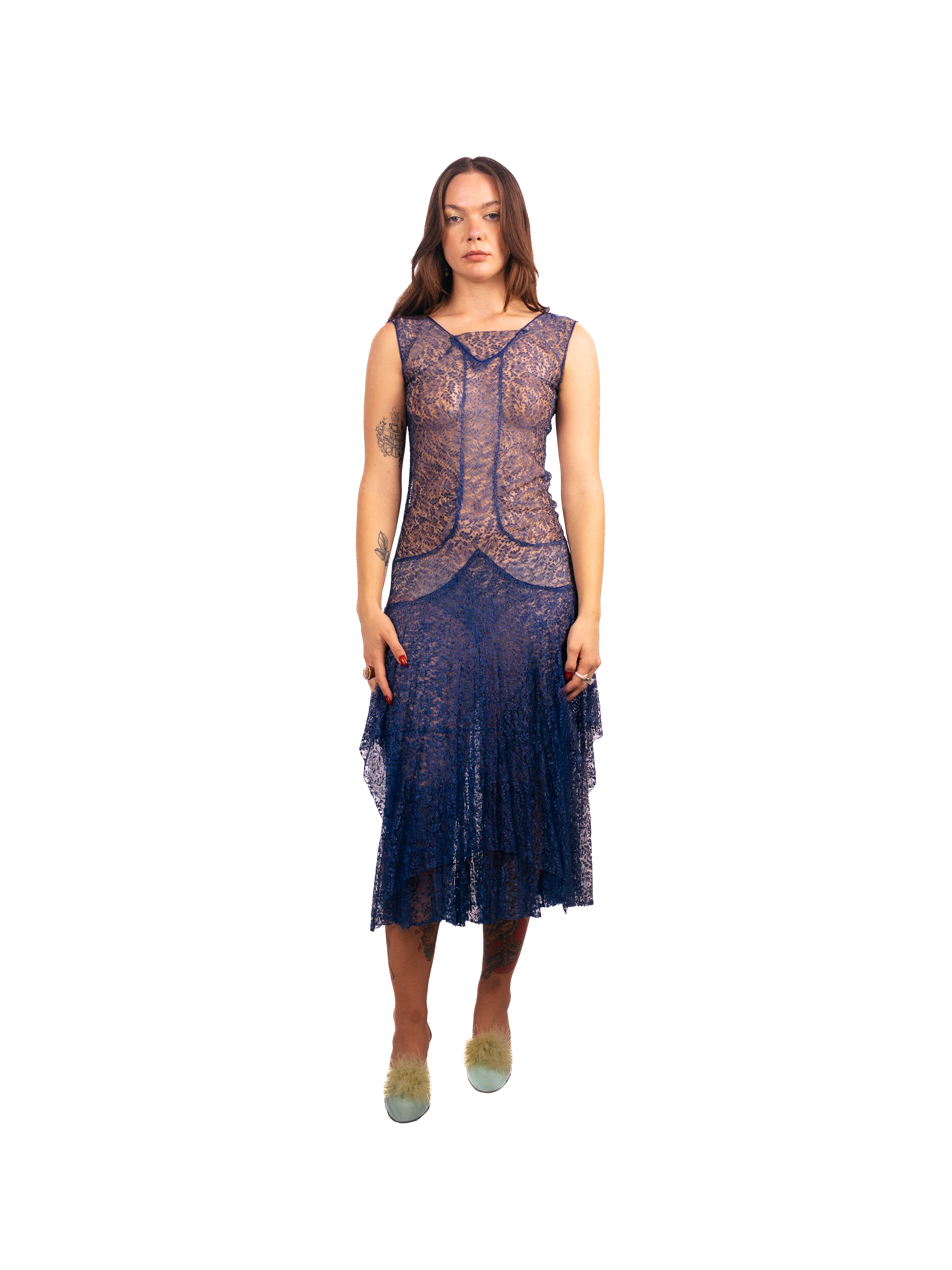 Absolutely stunning midnight blue sheer 1920's lace dress, unlined, with deco lines and hip panels. The lace is in good condition but it is very delicate. There are some areas where the lace is pulling, and there is a repair on one shoulder seam, but it is in good antique condition.