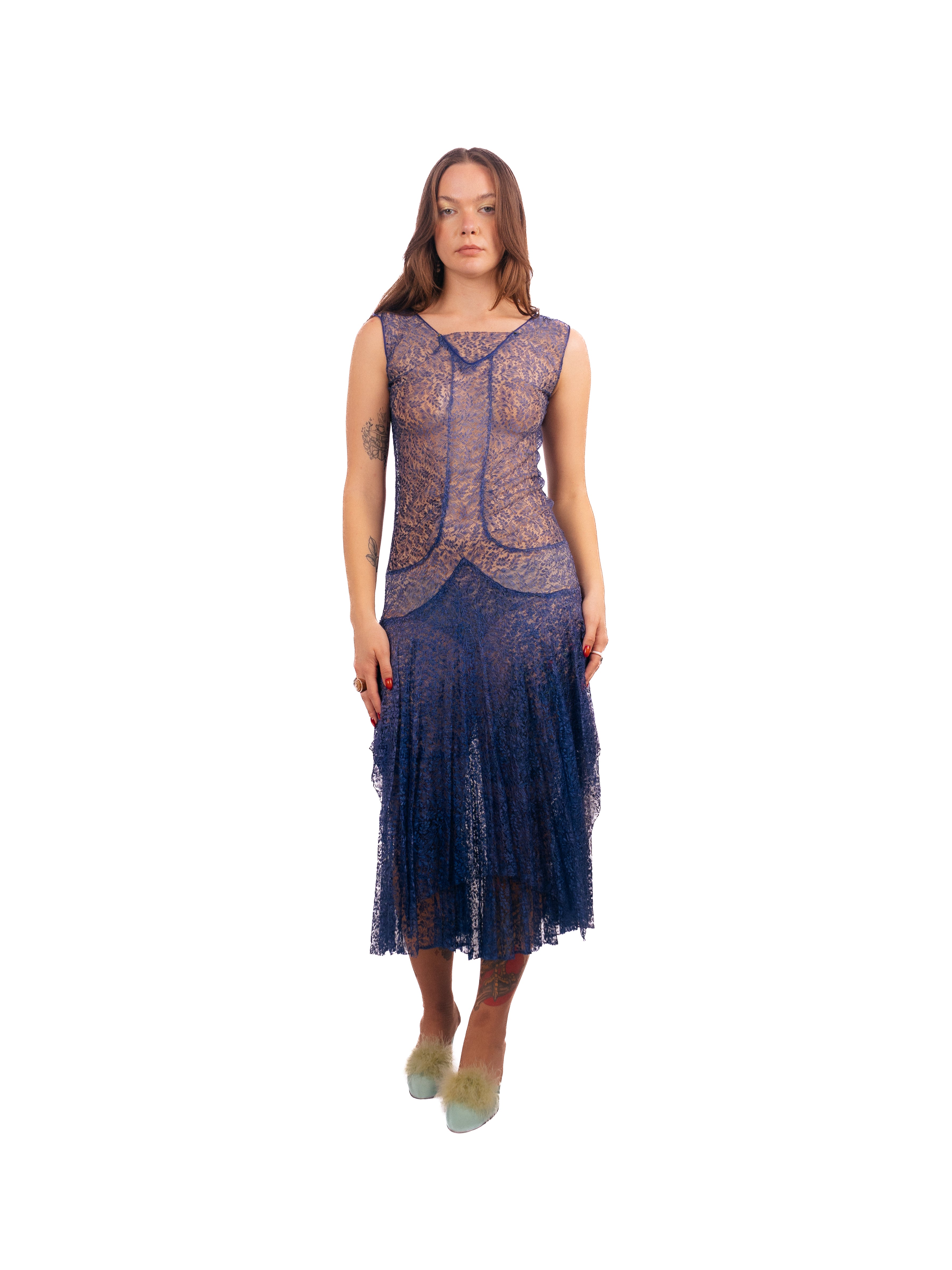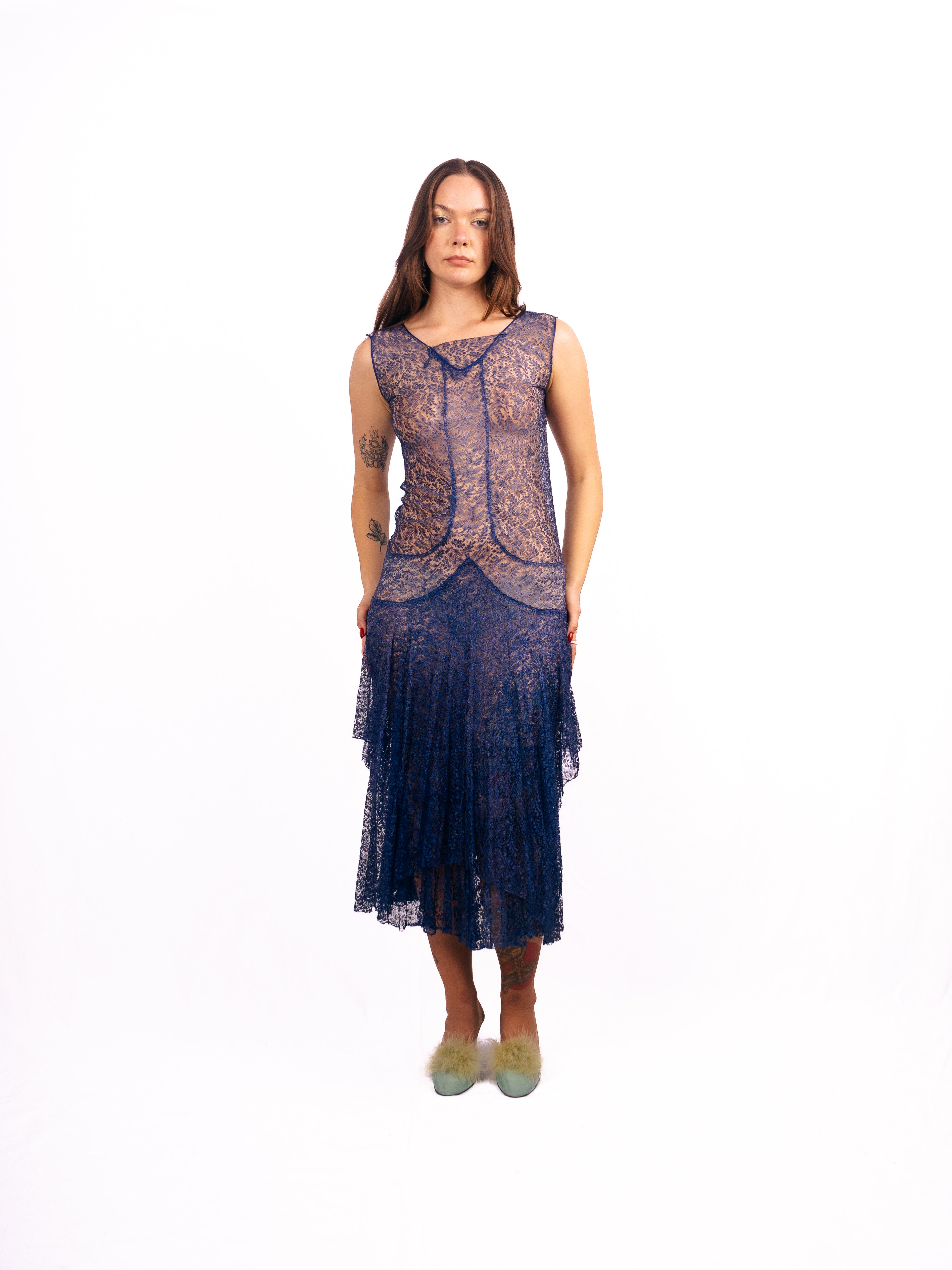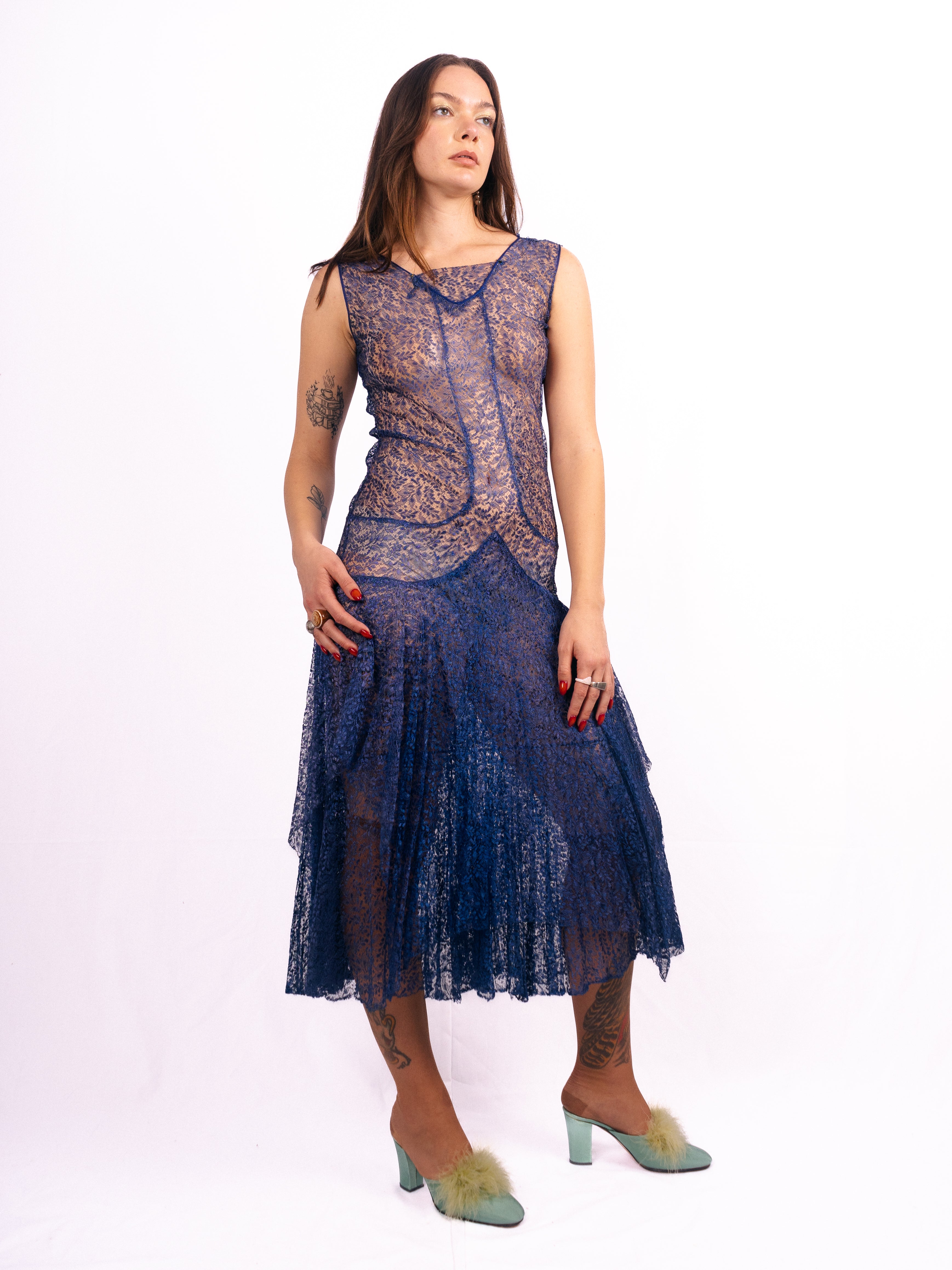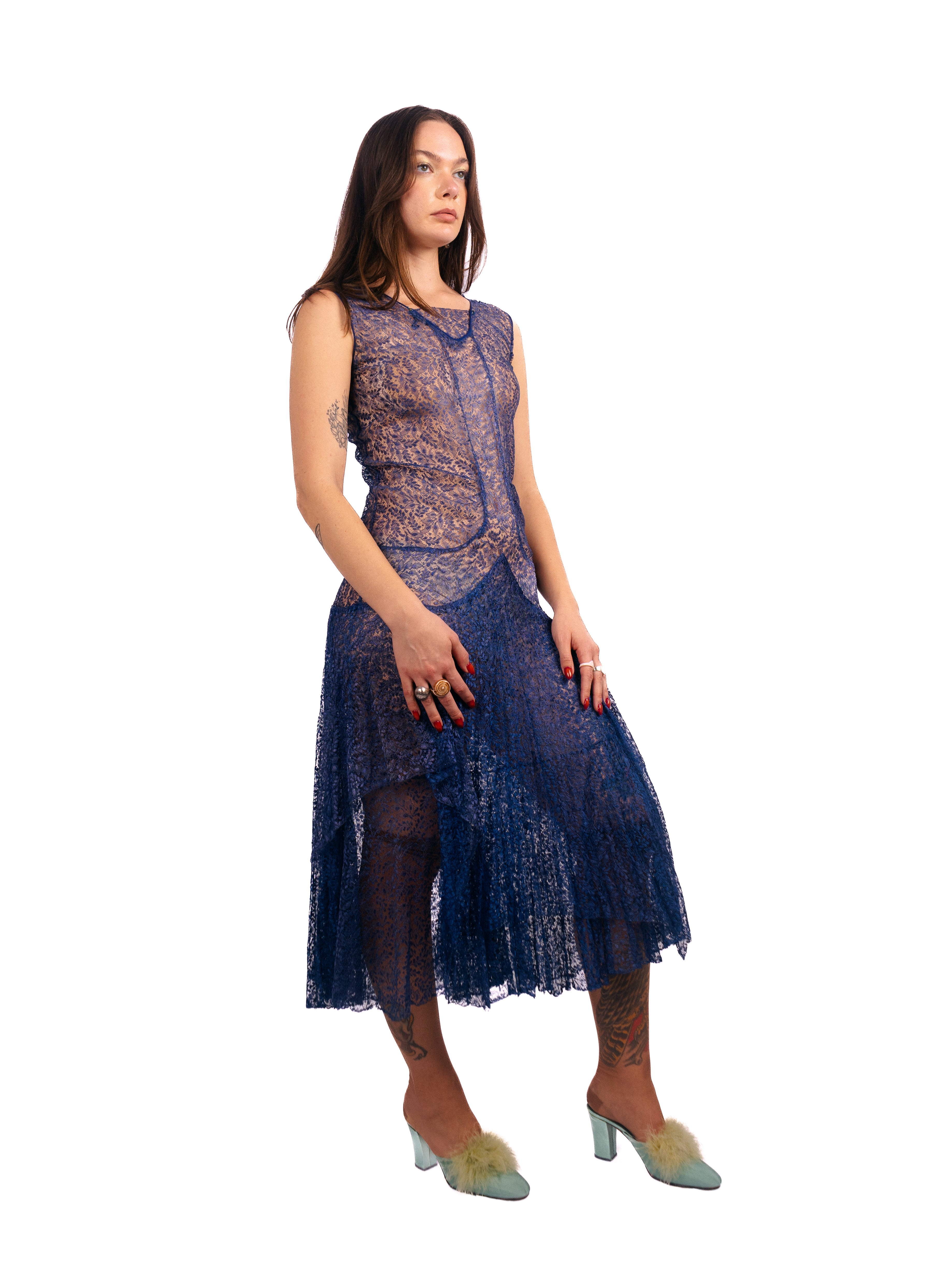 Absolutely stunning midnight blue sheer 1920's lace dress, unlined, with deco lines and hip panels. The lace is in good condition but it is very delicate. There are some areas where the lace is pulling, and there is a repair on one shoulder seam, but it is in good antique condition.