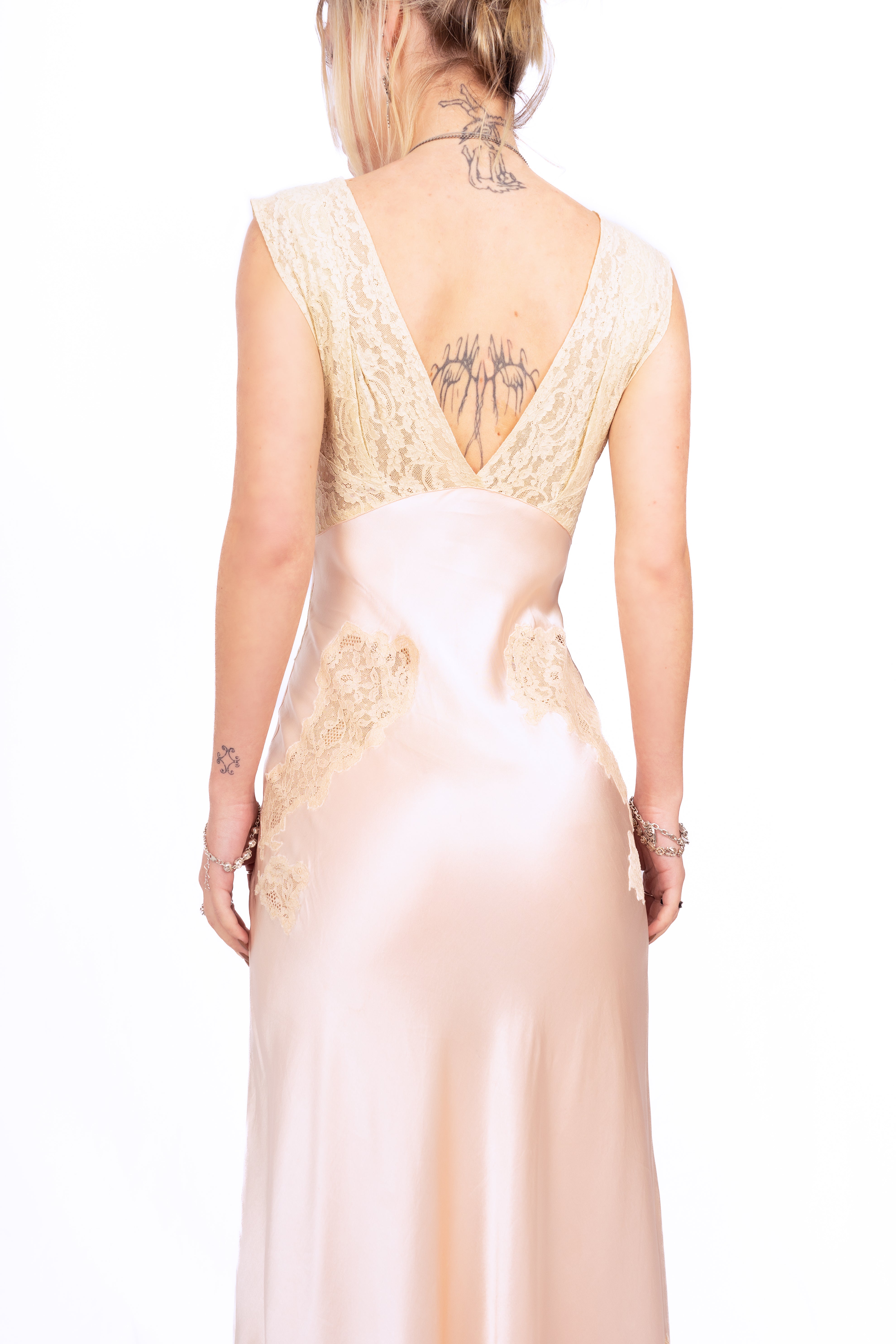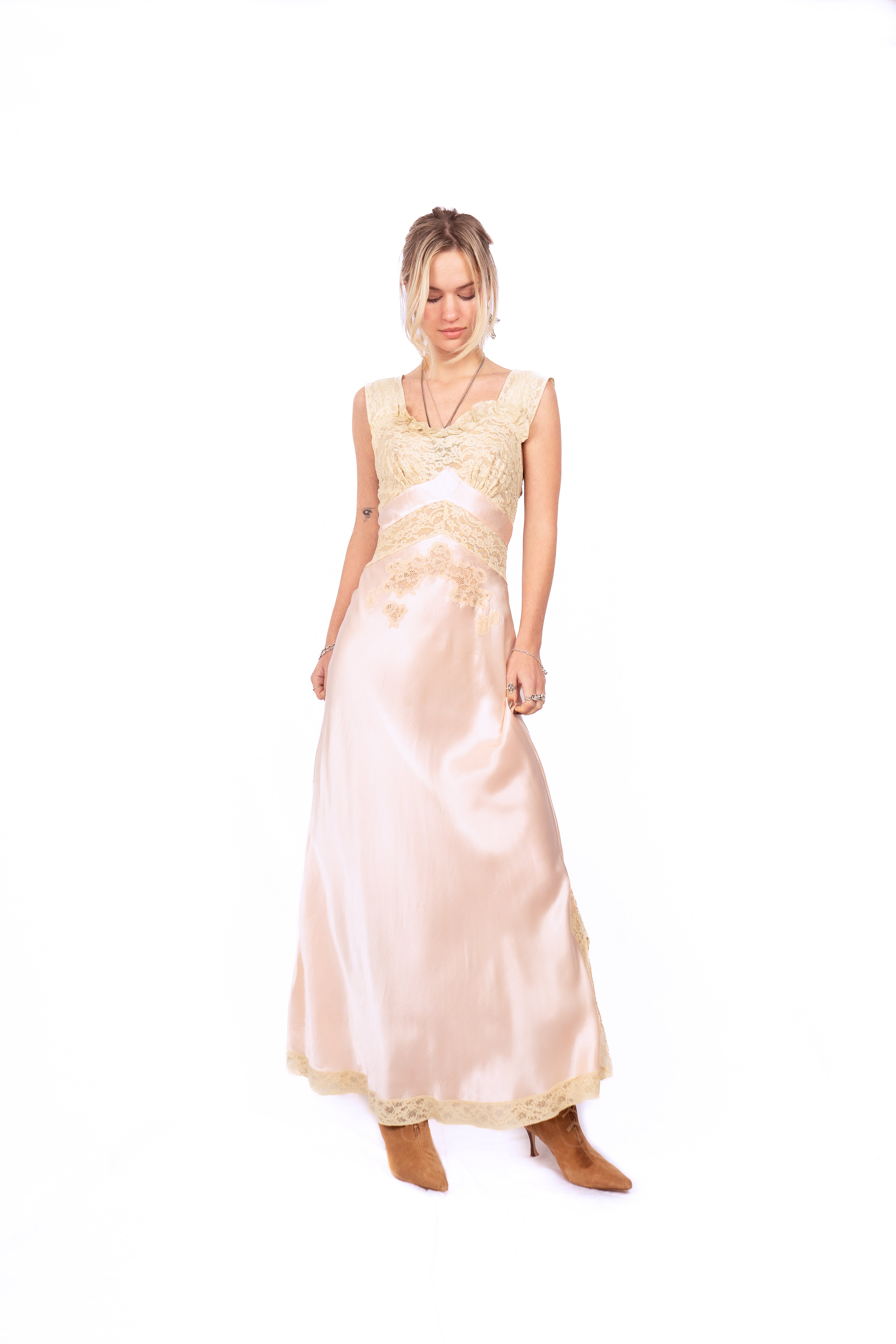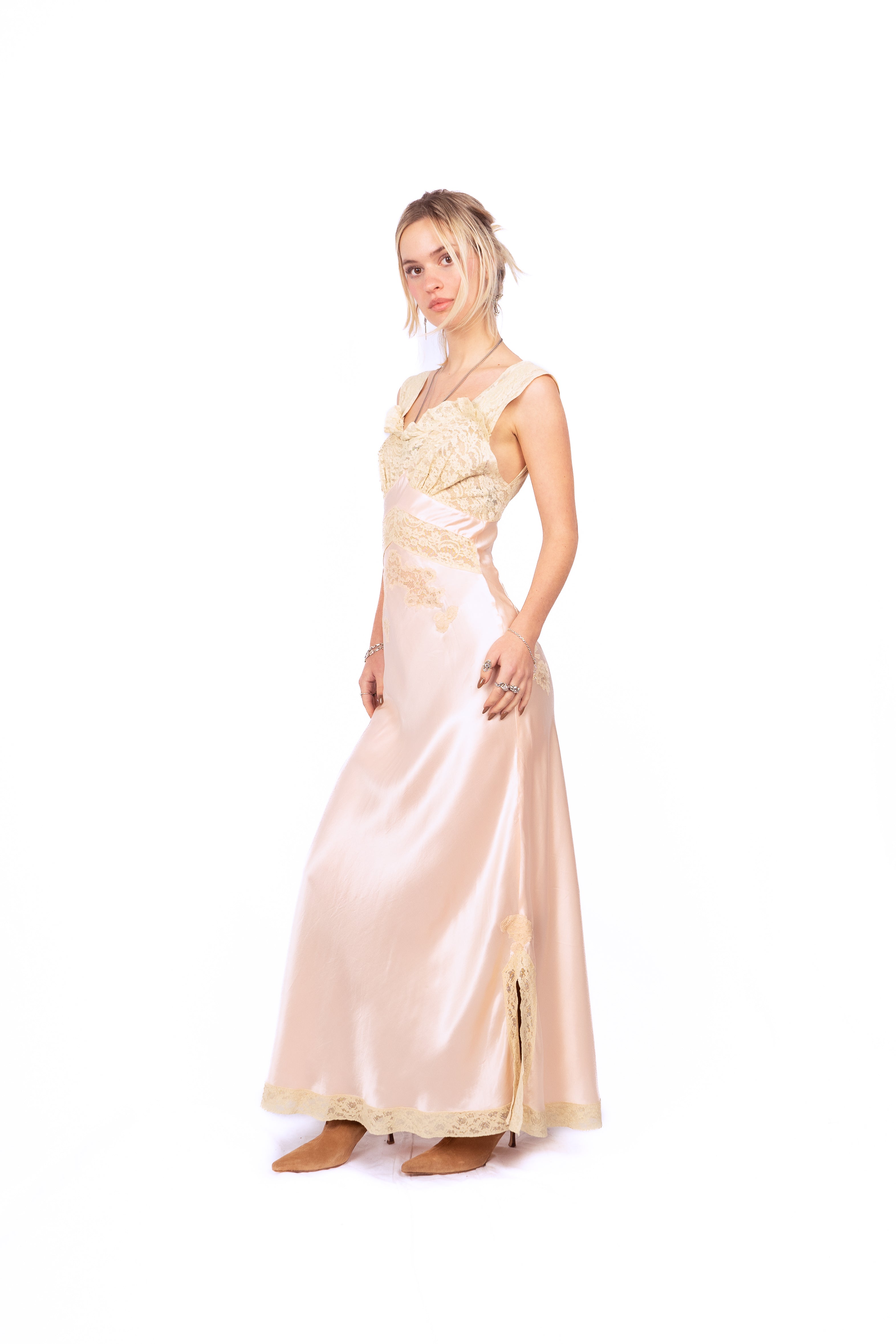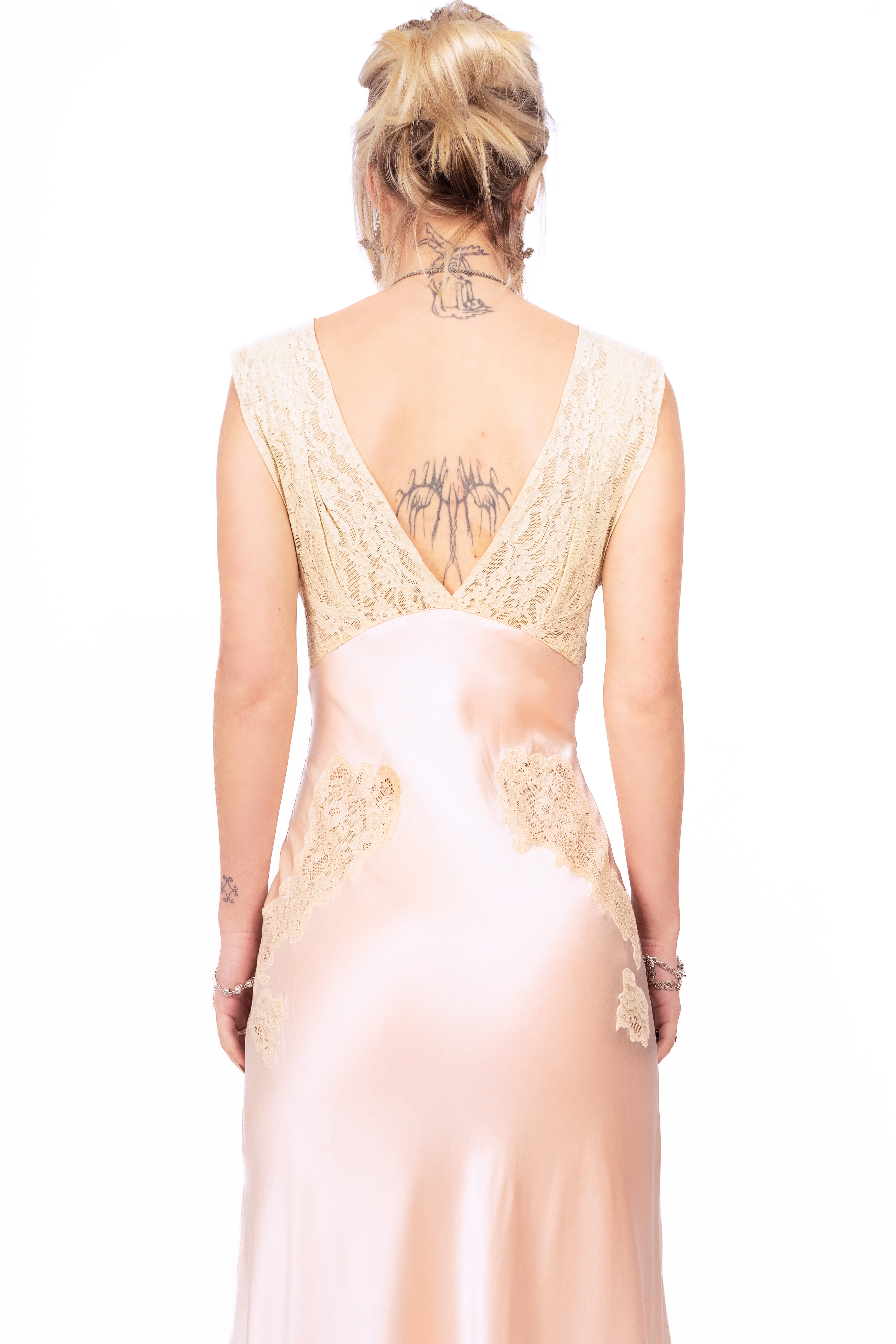 1930's bias-cut rayon satin gown with lace appliqué, restored by Reject Archive. This Fischer gown is a stunning example of 1930's glamour and what can be done to restore these pieces. We sourced 1930's Alençon ecru corded lace to appliqué over any damage. When this piece came to us it had heart-shaped patches covering some small holes. The heart patches were cute but we wanted the gown to present true to its era. We try to leave things better than we found them and hopefully you think so. We cut patched of the corded lace to create a balanced motif in the front, covering holes and bright pink stains. The same was done in the back, the lace appliqué is shaped almost like angel wings and they follow the natural curves of the back beautifully. The backing fabric was cut out which pairs nicely with the entirely lace, ruffled bust. This piece also features lace straps and lace trim at the hemline. The skirt splits up the sides, and there are more lace appliqué patches where there were more heart patches before. There are no signs of damage now, this piece presents beautifully. We hope you love the work we put into this piece!