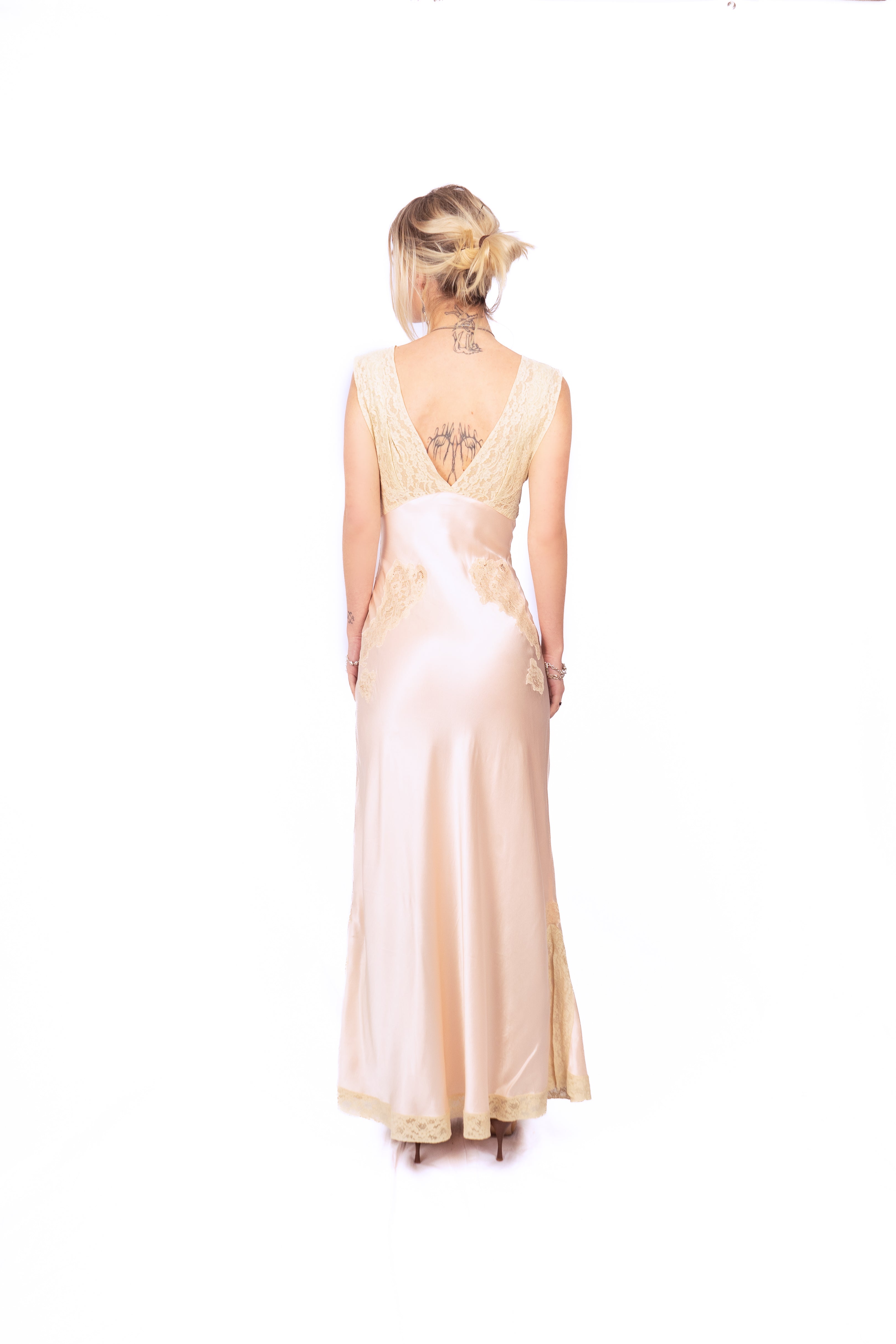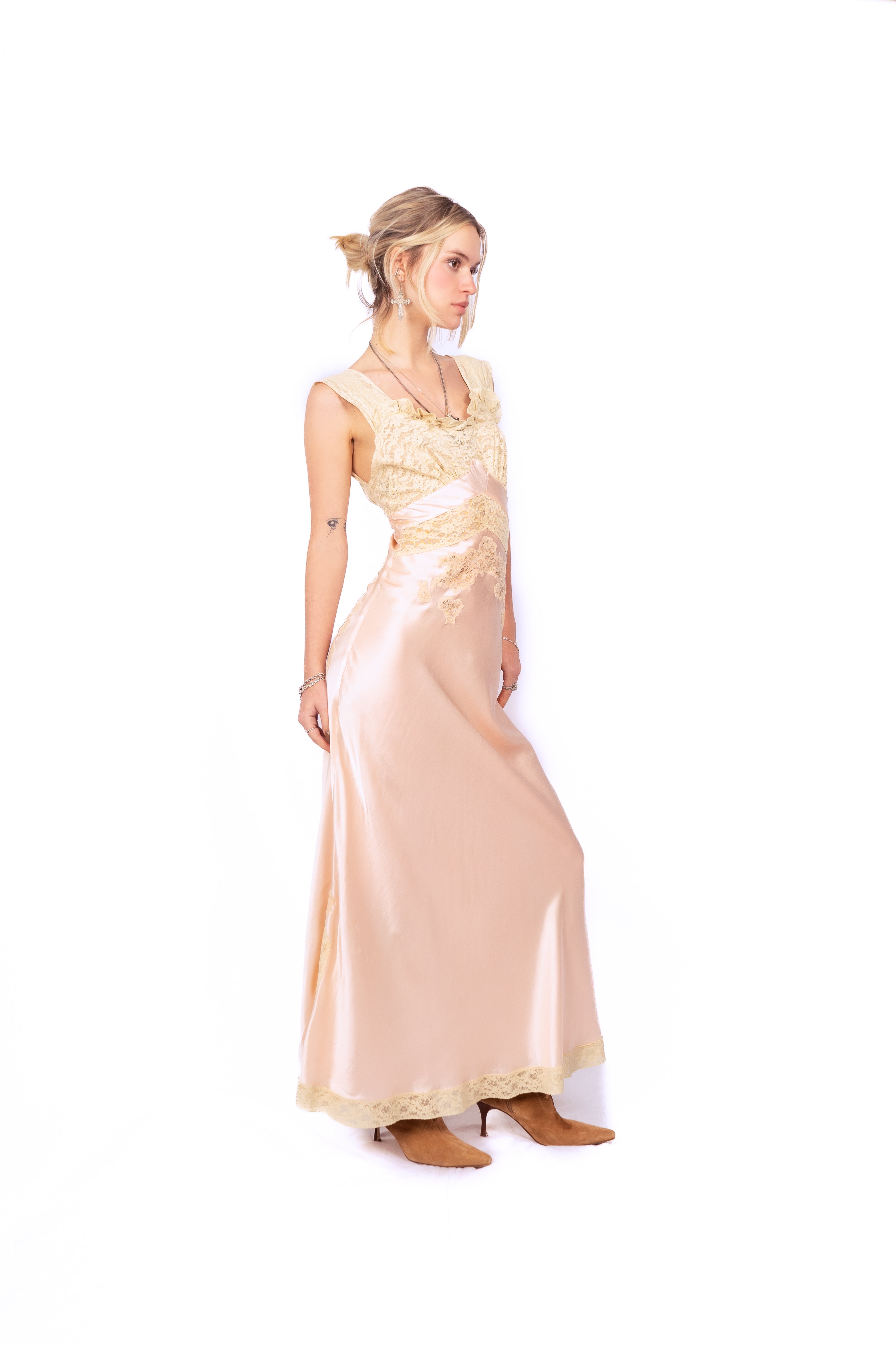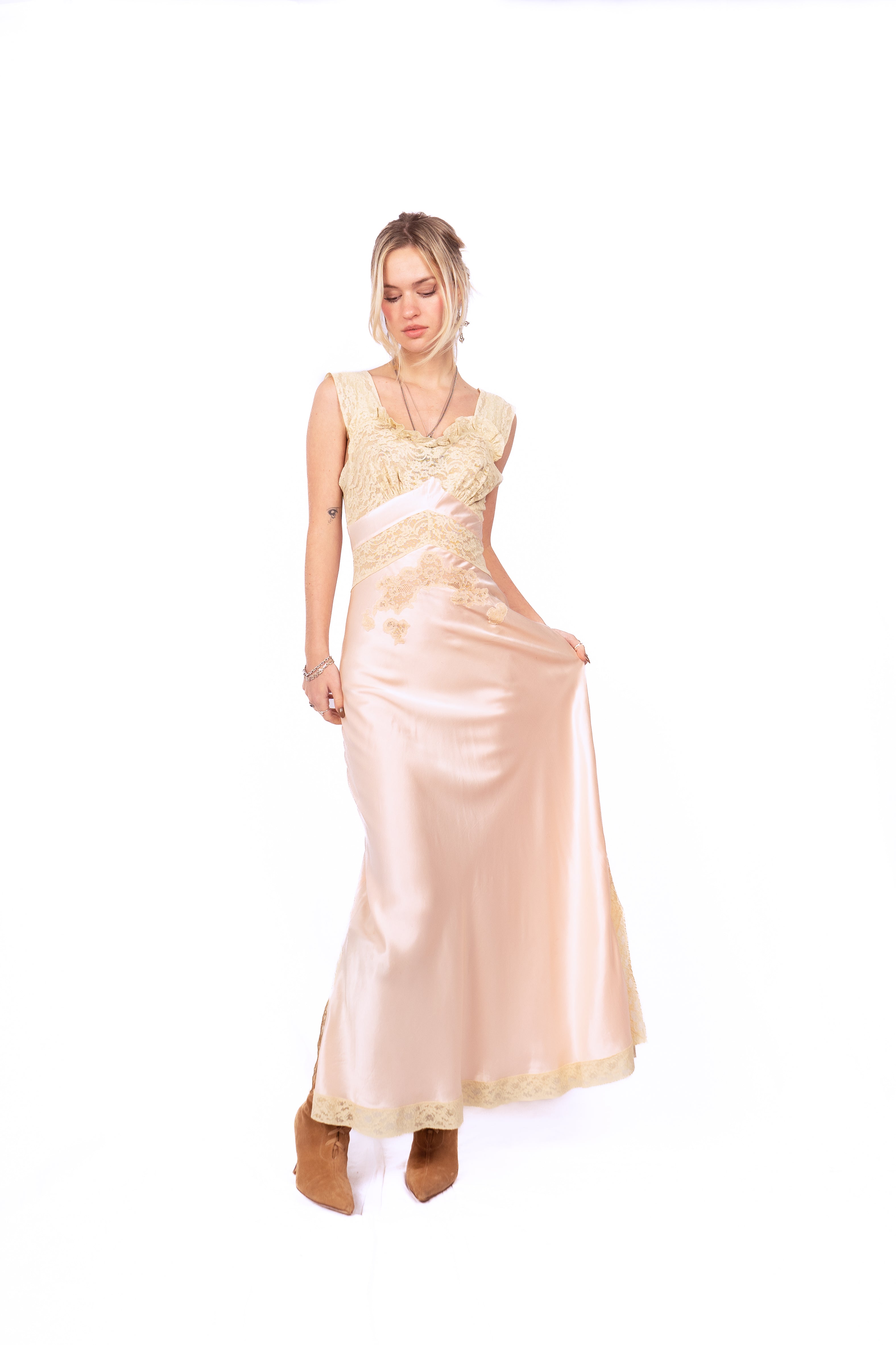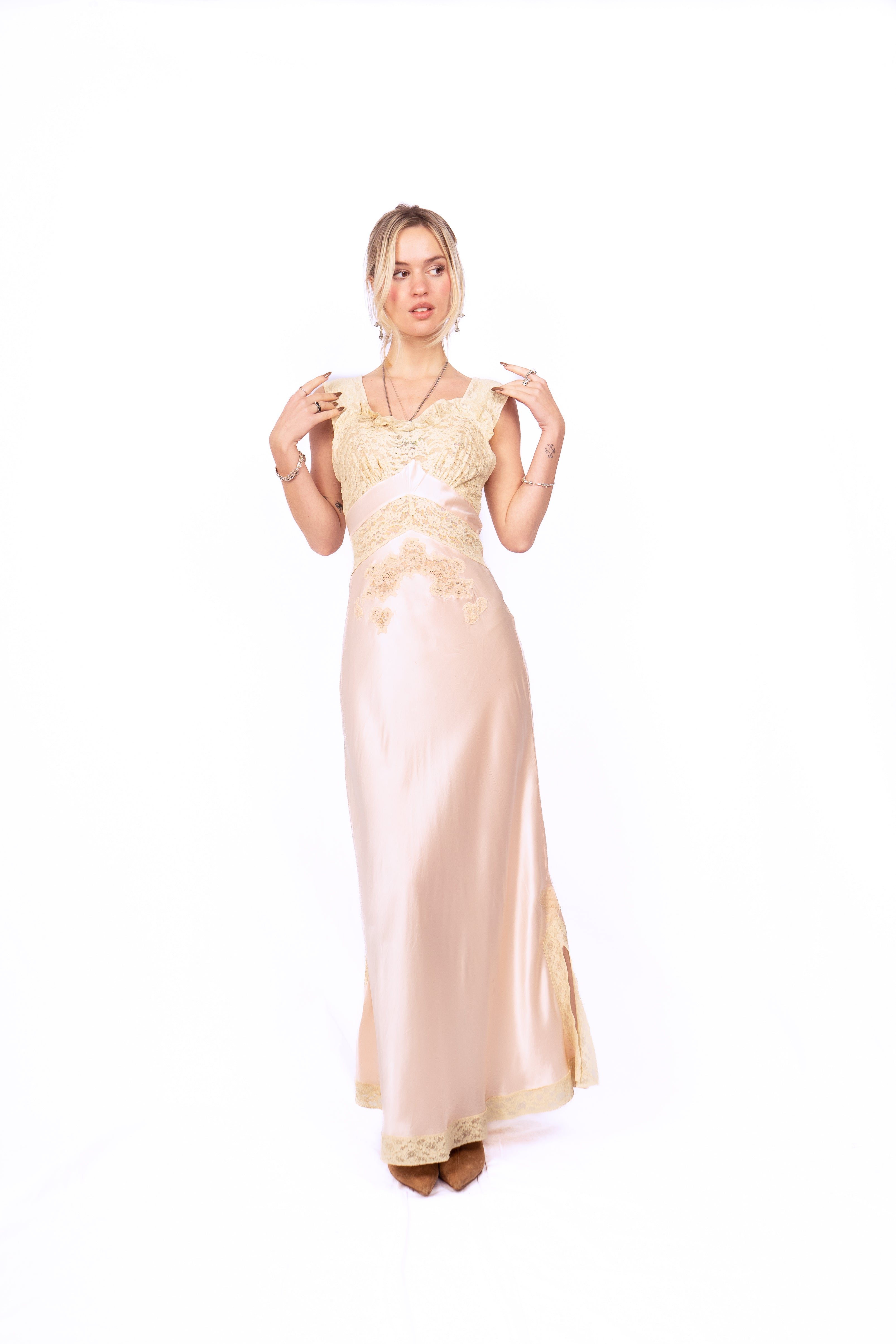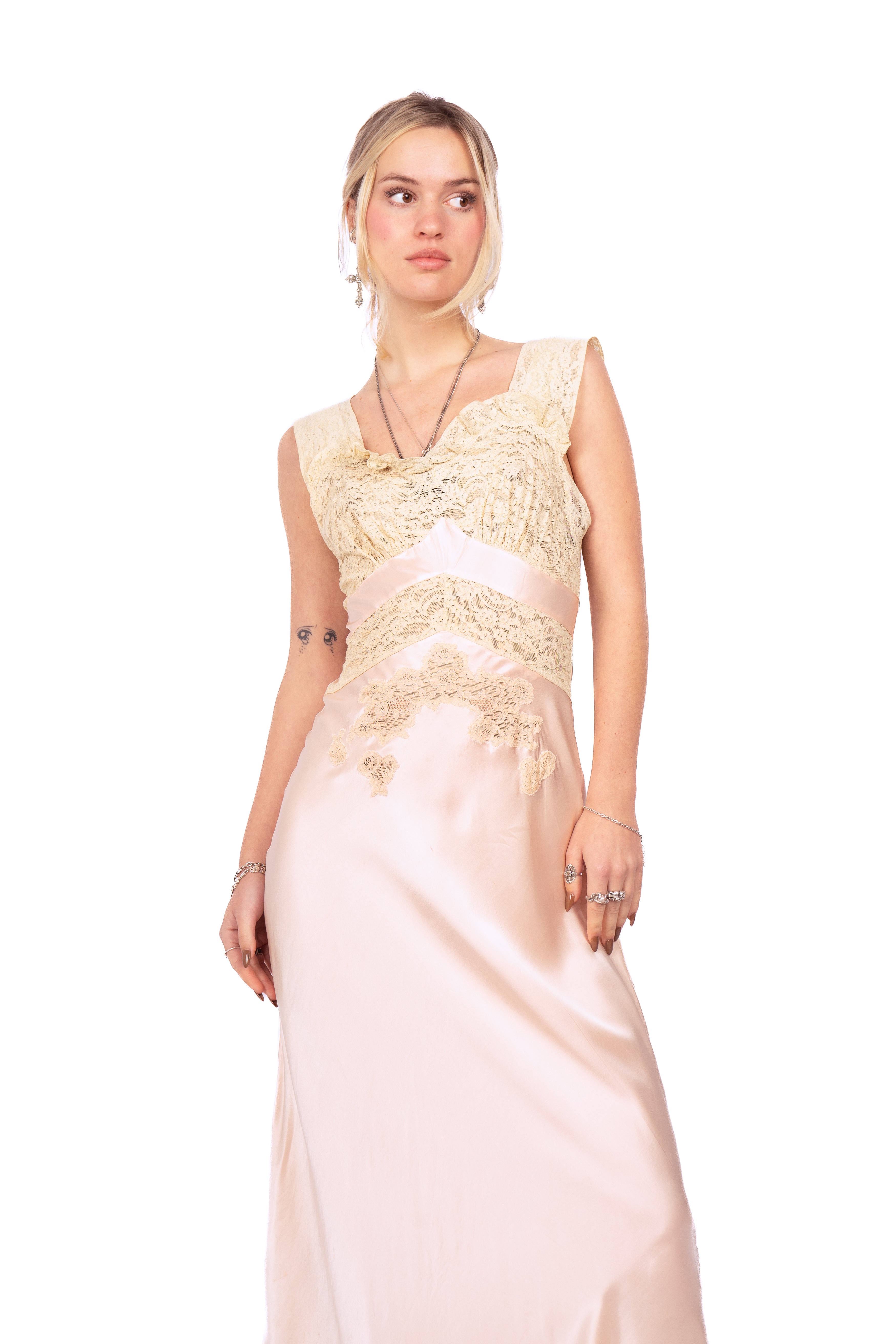 1930's bias-cut rayon satin gown with lace appliqué, restored by Reject Archive. This Fischer gown is a stunning example of 1930's glamour and what can be done to restore these pieces. We sourced 1930's Alençon ecru corded lace to appliqué over any damage. When this piece came to us it had heart-shaped patches covering some small holes. The heart patches were cute but we wanted the gown to present true to its era. We try to leave things better than we found them and hopefully you think so. We cut patched of the corded lace to create a balanced motif in the front, covering holes and bright pink stains. The same was done in the back, the lace appliqué is shaped almost like angel wings and they follow the natural curves of the back beautifully. The backing fabric was cut out which pairs nicely with the entirely lace, ruffled bust. This piece also features lace straps and lace trim at the hemline. The skirt splits up the sides, and there are more lace appliqué patches where there were more heart patches before. There are no signs of damage now, this piece presents beautifully. We hope you love the work we put into this piece!