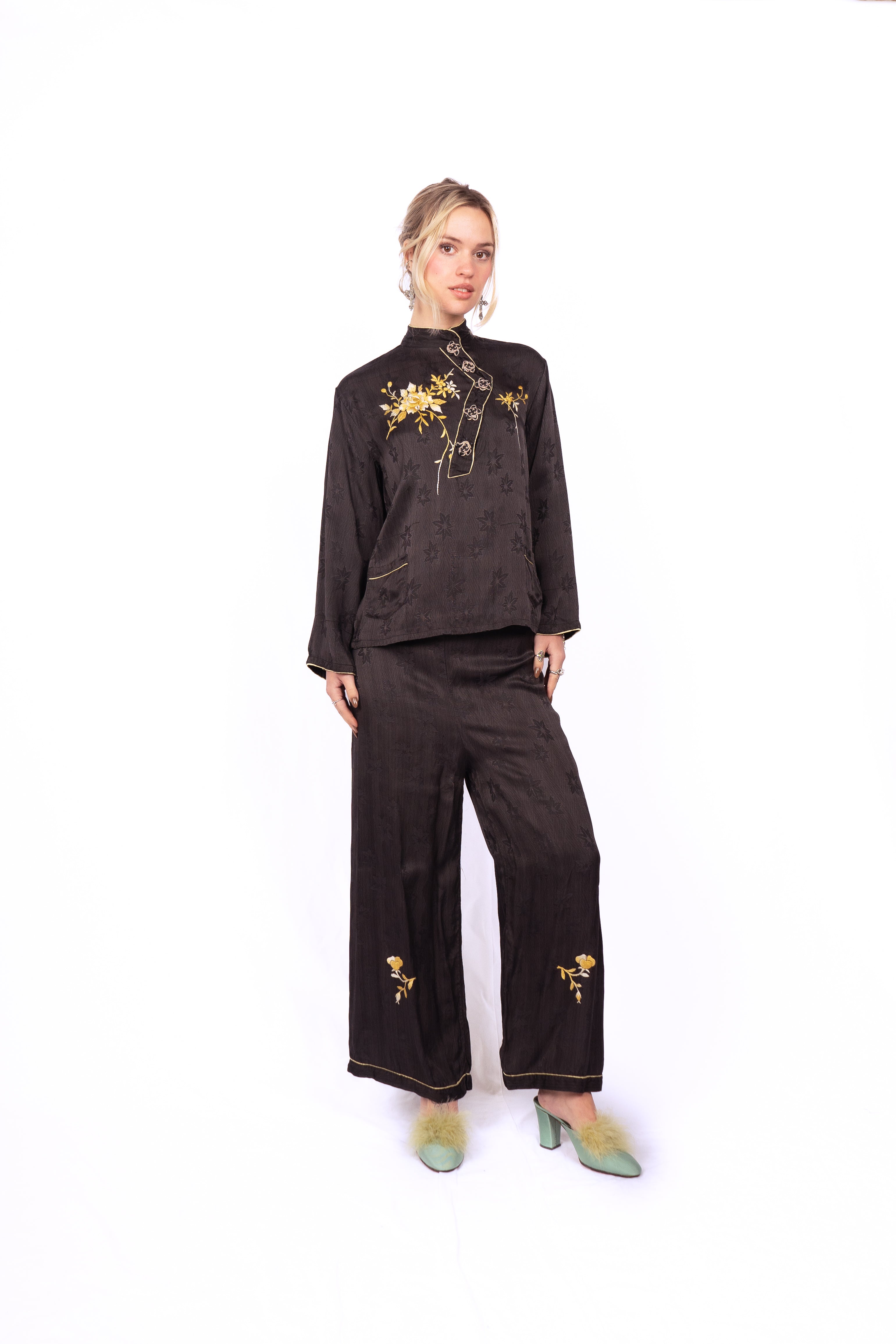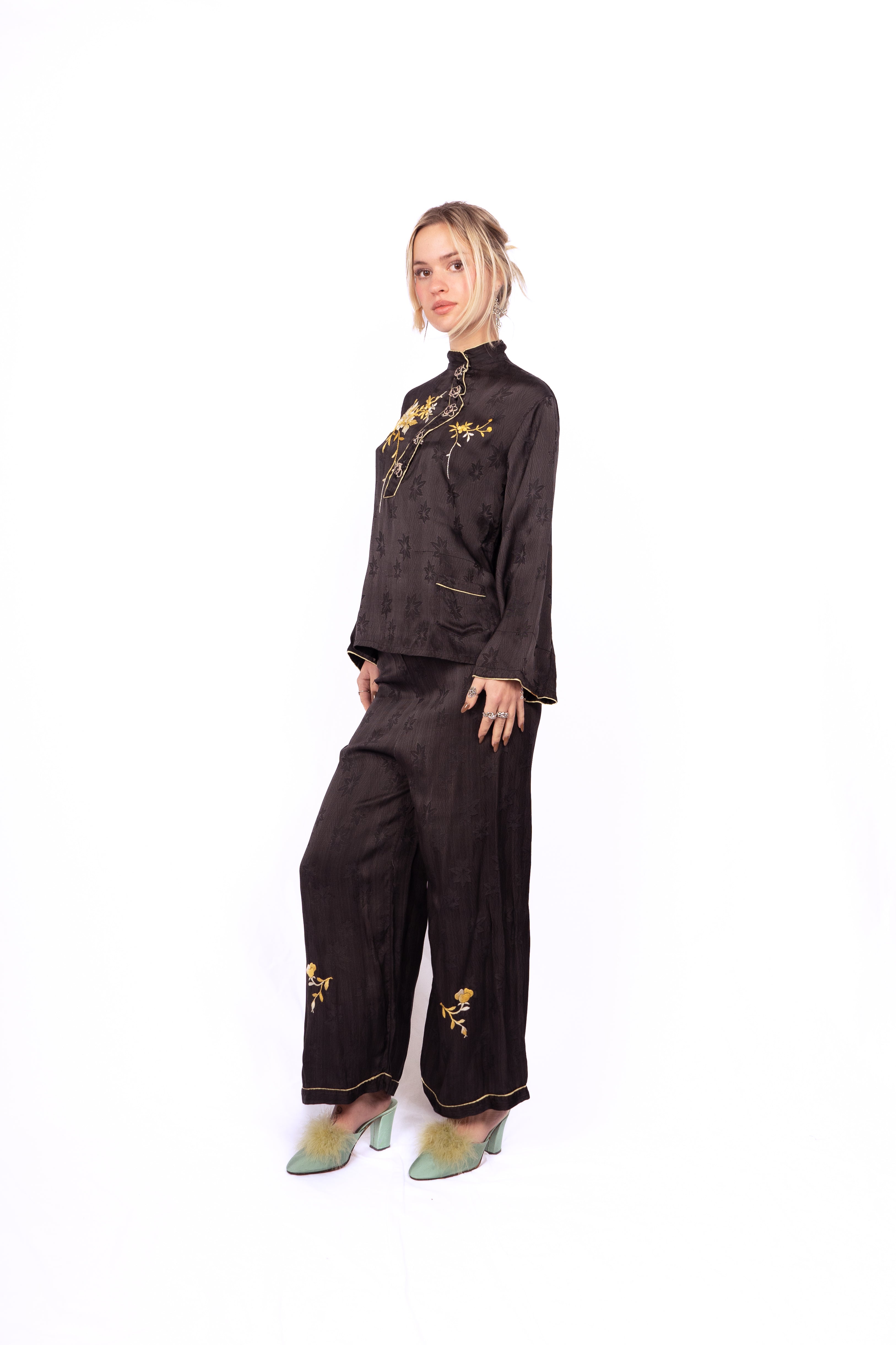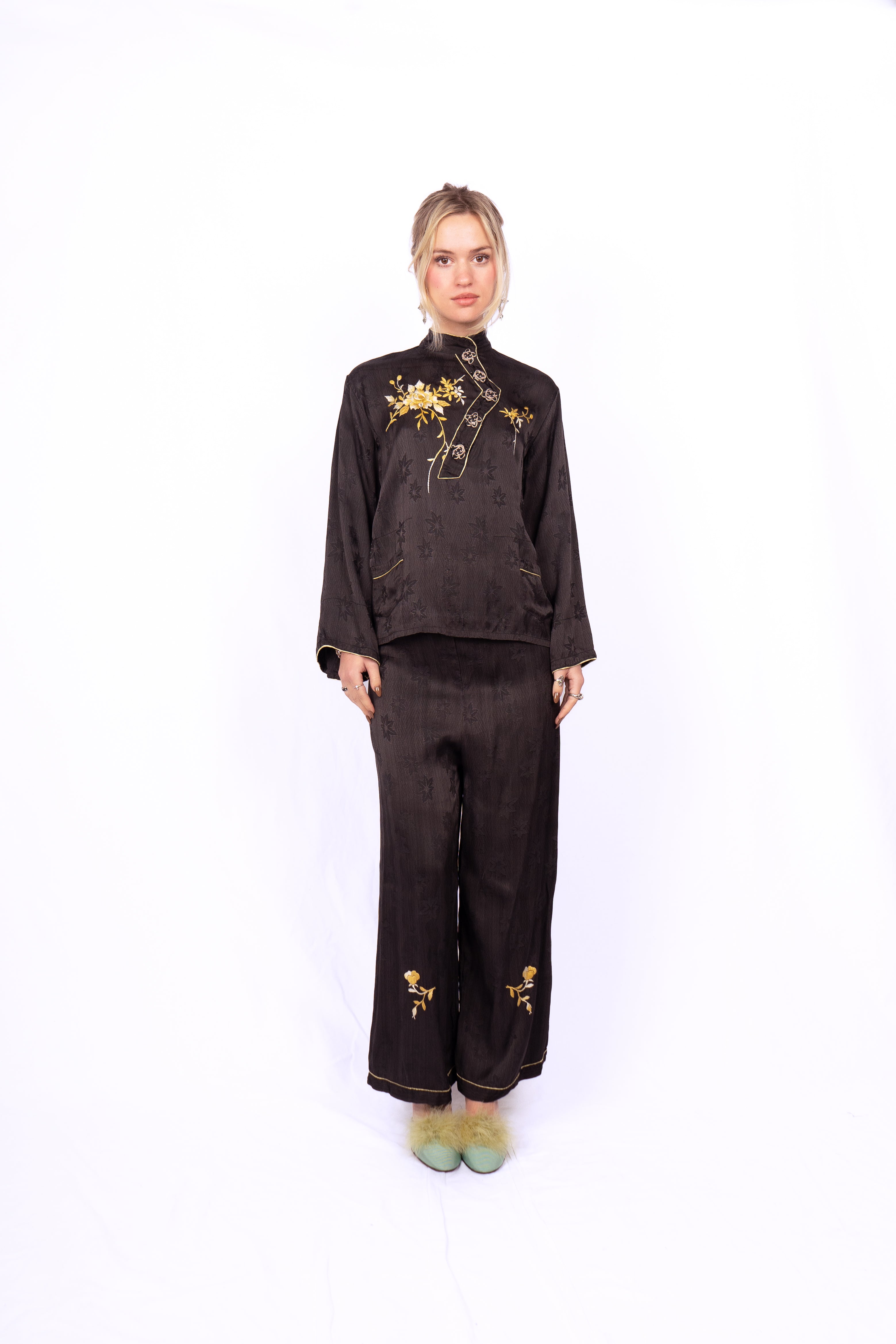 Gorgeous black jacquard silk pajama top and trouser set. The jacquard motif features herringbone background with maple leaf motif. Wide leg pant paired with a mandarin collar top, both featuring rayon floral embroidery and white satin piped trim. The top features two small pockets and cord flowers covering snap closures up the bust. The trousers feature a rose & rosebud motif on the front of each leg. The pants will most likely need to be tailored to your measurements unless the waist measurement matches you very closely. Darts can be easily added in the back, or you could have a tailor install elastic if you want more flex. These are so soft and special, they would be well worth a slight adjustment to have a special luxurious set like this in your wardrobe! Of course you could split the set and style them separately; the trousers are super versatile and would be gorgeous styled with all sorts of pieces.