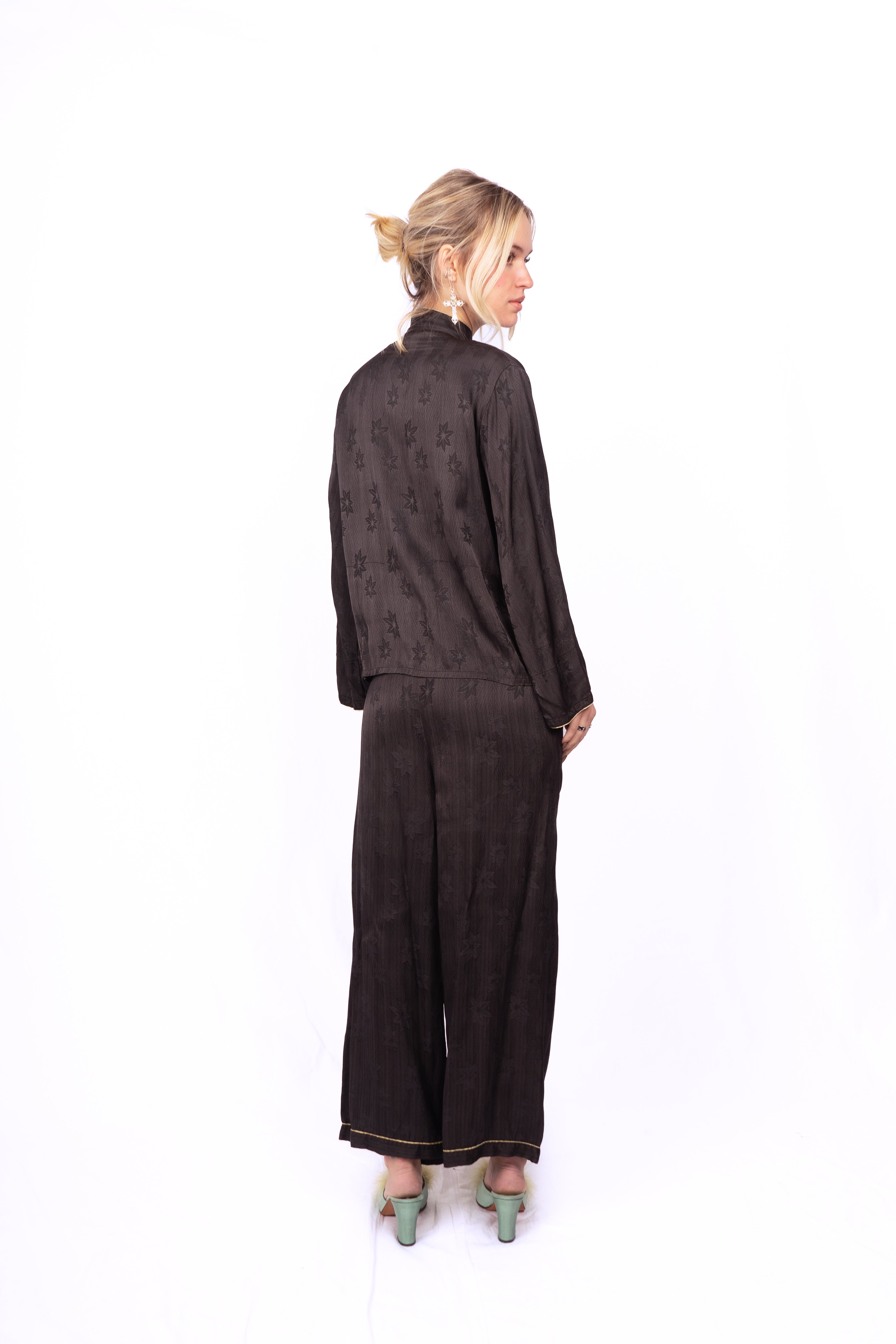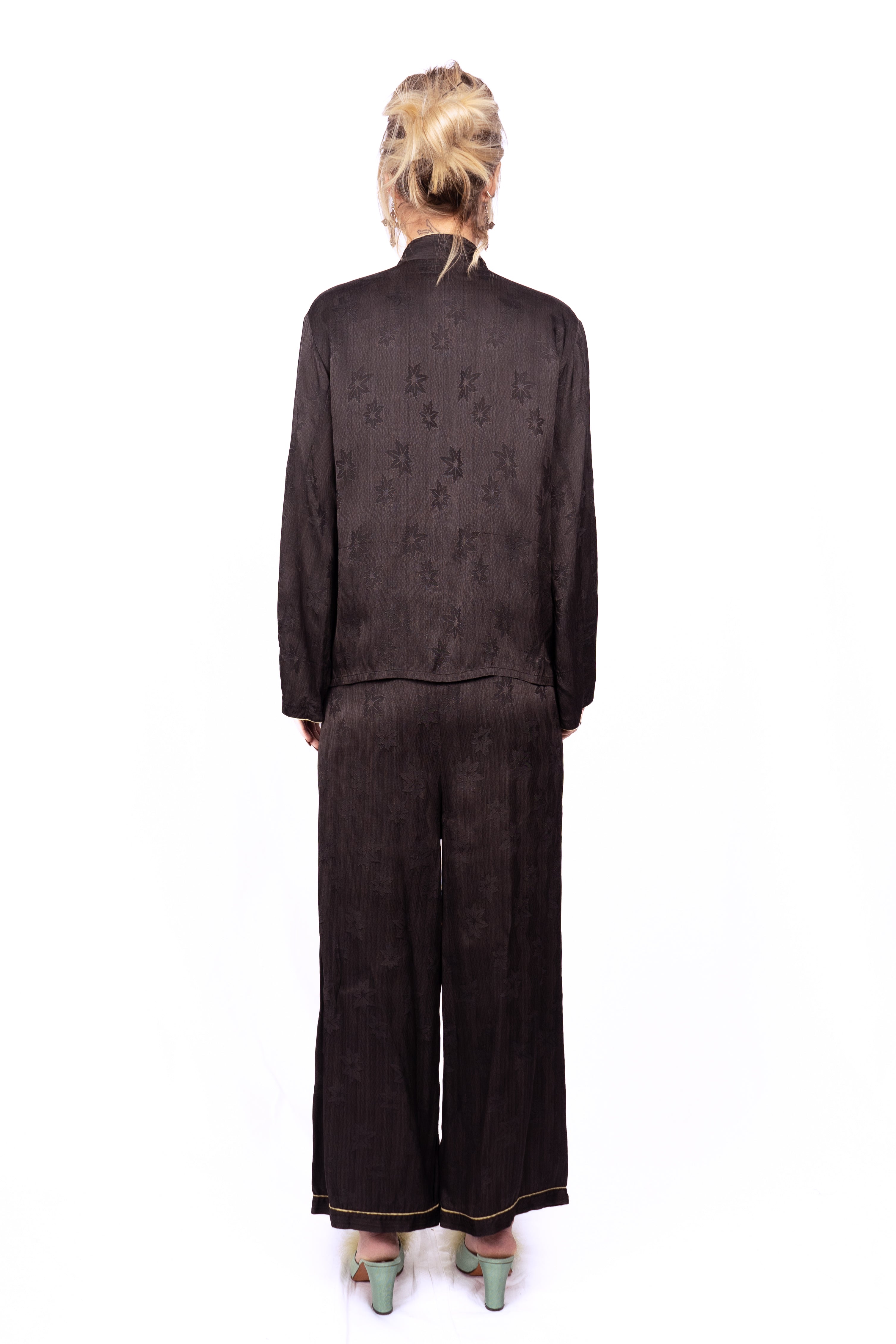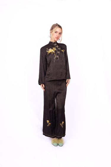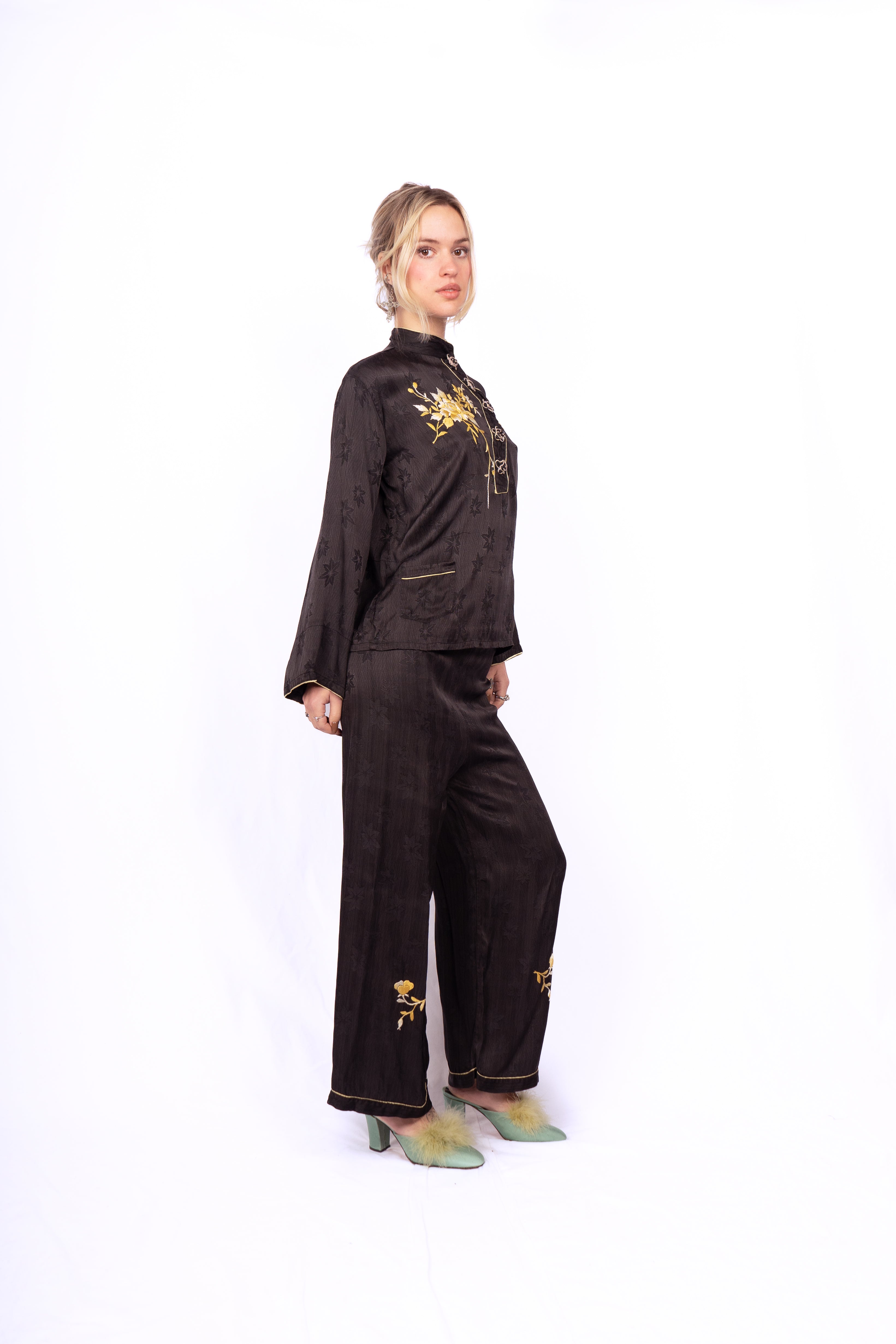 Gorgeous black jacquard silk pajama top and trouser set. The jacquard motif features herringbone background with maple leaf motif. Wide leg pant paired with a mandarin collar top, both featuring rayon floral embroidery and white satin piped trim. The top features two small pockets and cord flowers covering snap closures up the bust. The trousers feature a rose & rosebud motif on the front of each leg. The pants will most likely need to be tailored to your measurements unless the waist measurement matches you very closely. Darts can be easily added in the back, or you could have a tailor install elastic if you want more flex. These are so soft and special, they would be well worth a slight adjustment to have a special luxurious set like this in your wardrobe! Of course you could split the set and style them separately; the trousers are super versatile and would be gorgeous styled with all sorts of pieces.