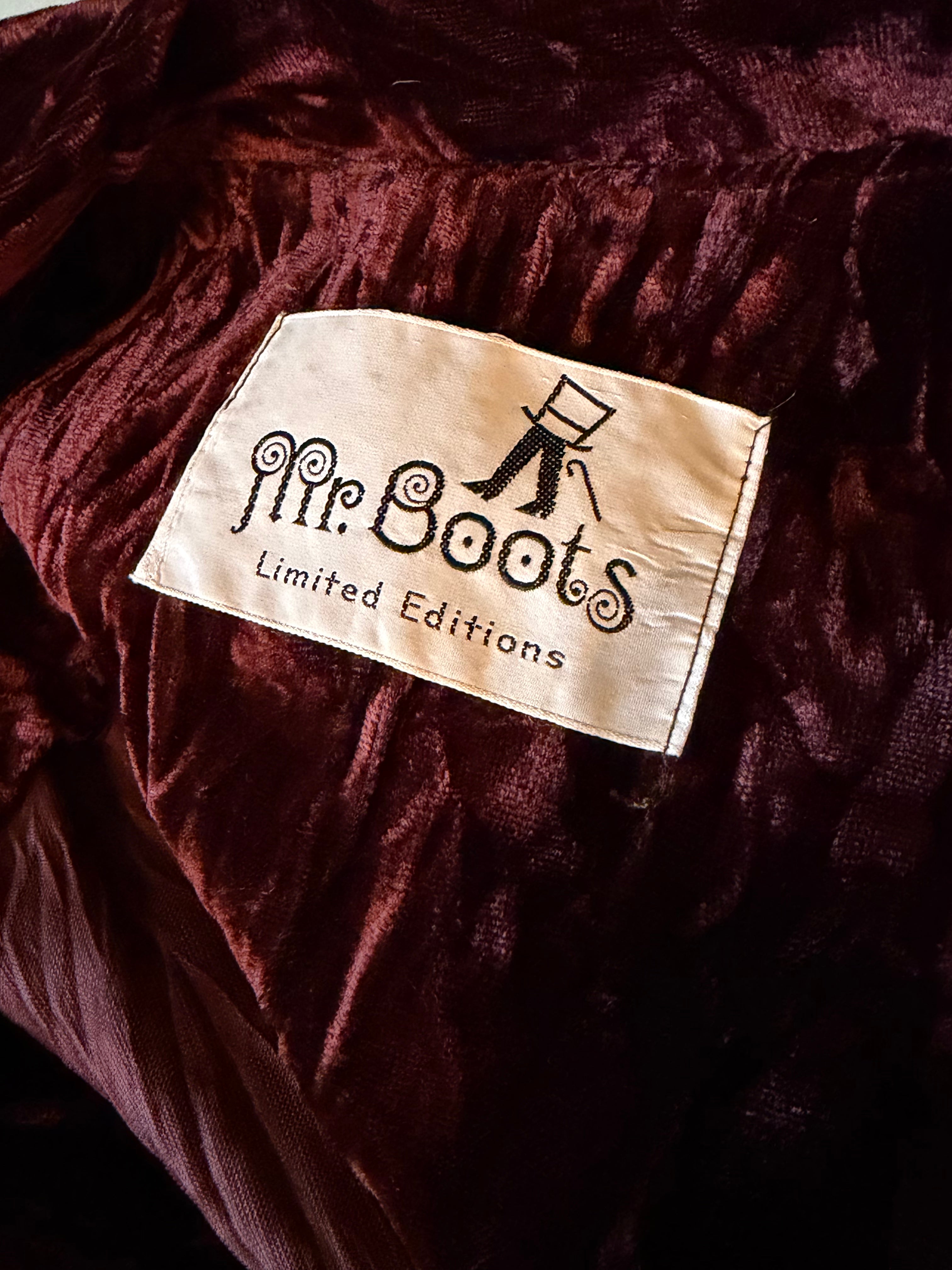 The cutest chocolate brown crushed velvet blazer from the 1970's. Gorgeous tailored shape, nipped at the waist. Classic 70's oversized lapel with wingtip collar. Features brass colored filigree buttons. This piece has the cutest tag reading "Mr. Boots."