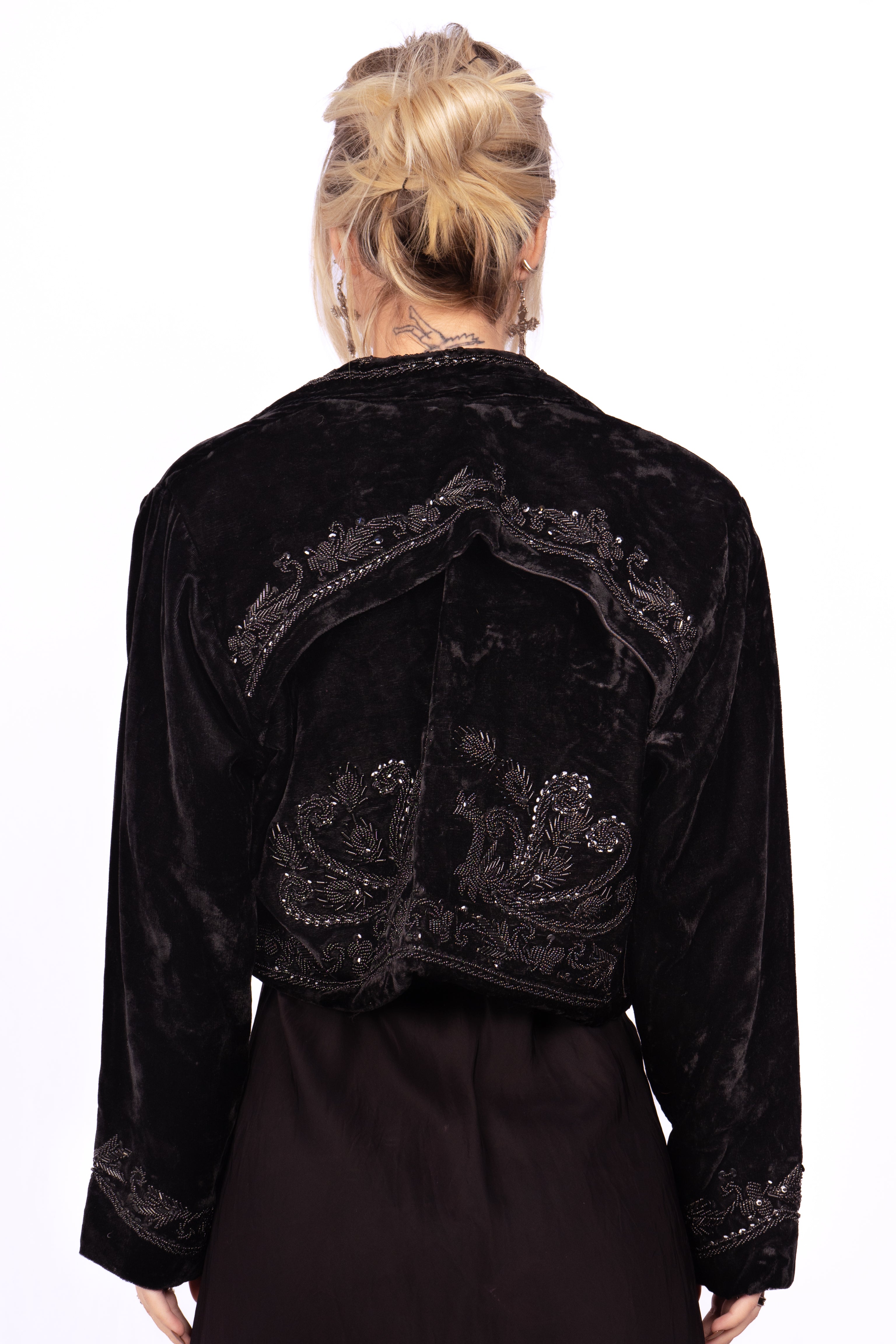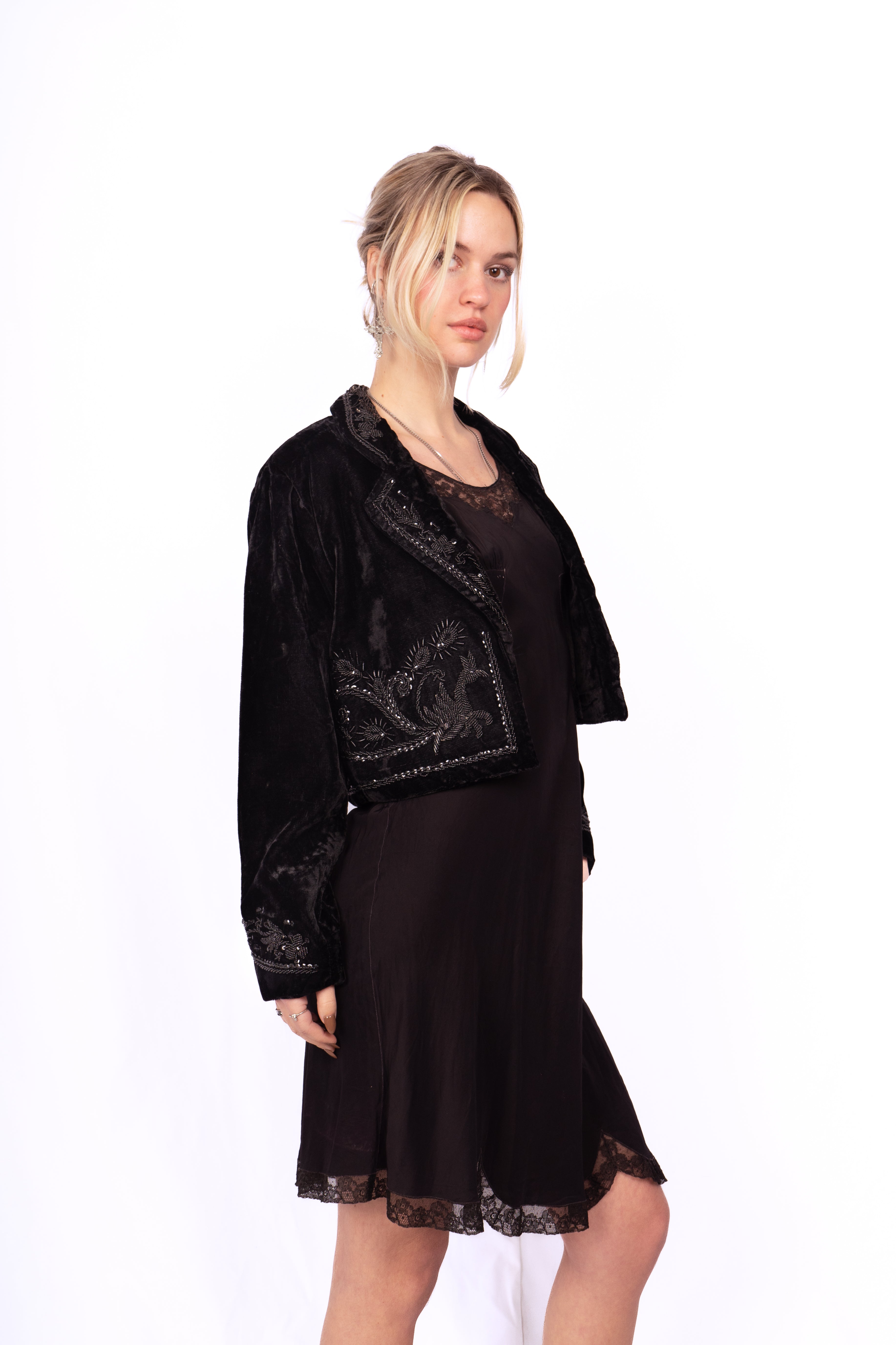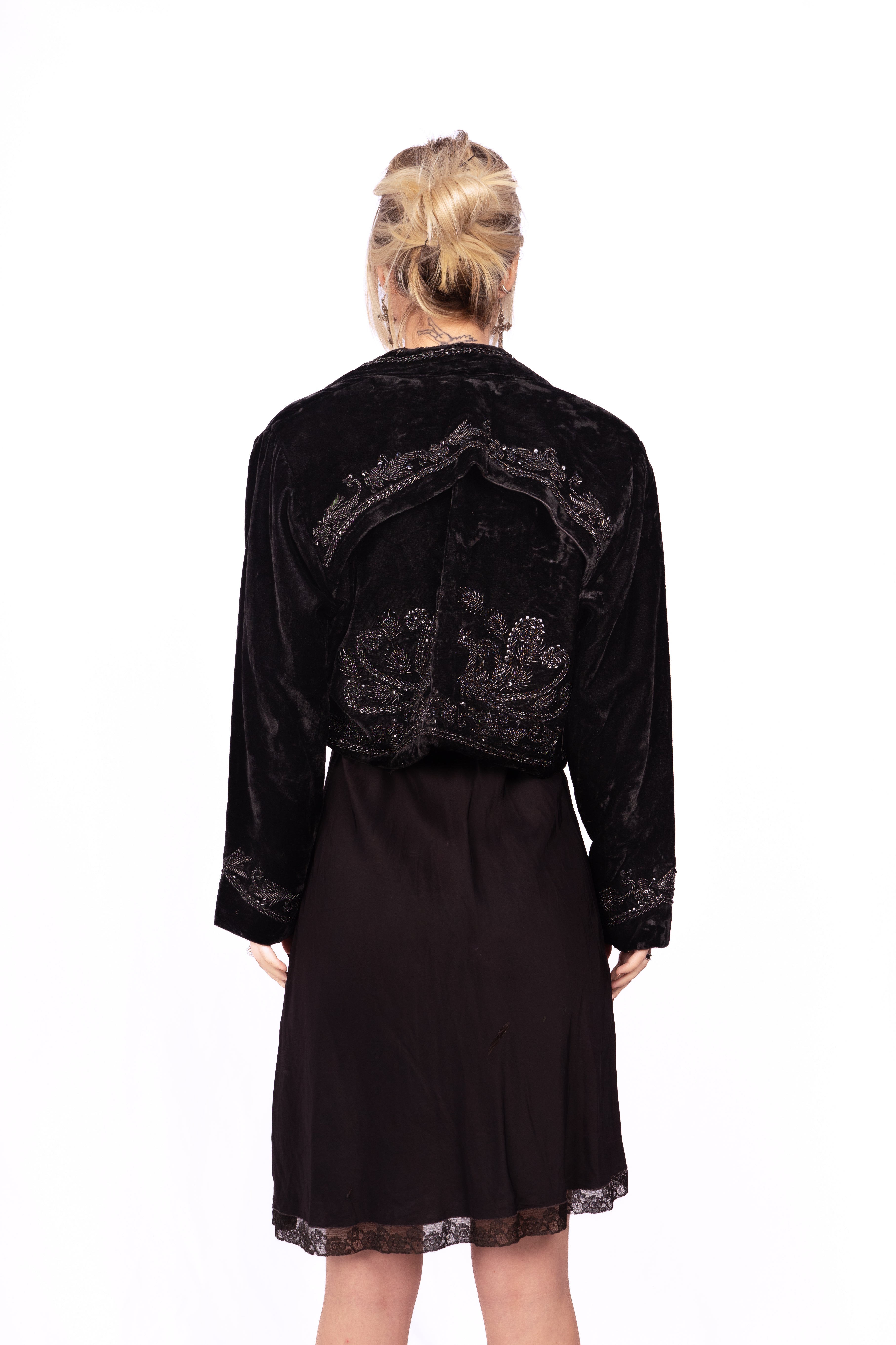 Beautiful Victorian-style embellished velvet cropped jacket. Likely inspired by Victorian mourning garb. The jacket is fully decorated front, back, collar and cuffs in beads and sequins. Perfect little black jacket to make any outfit more glamorous. Throw it over a silk and/or lace slip dress for a timeless look. No major damage, some loose threads and minor bead loss.