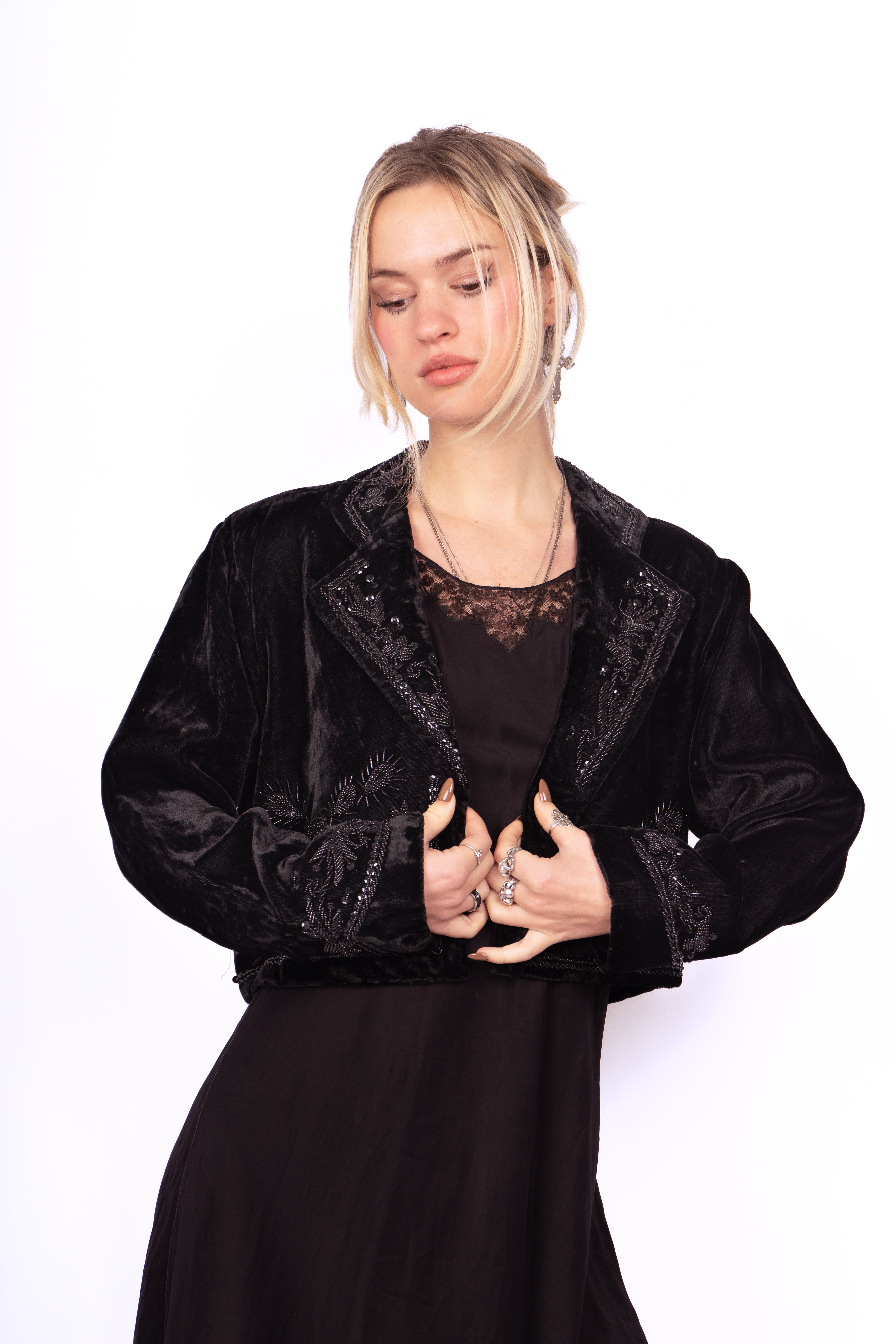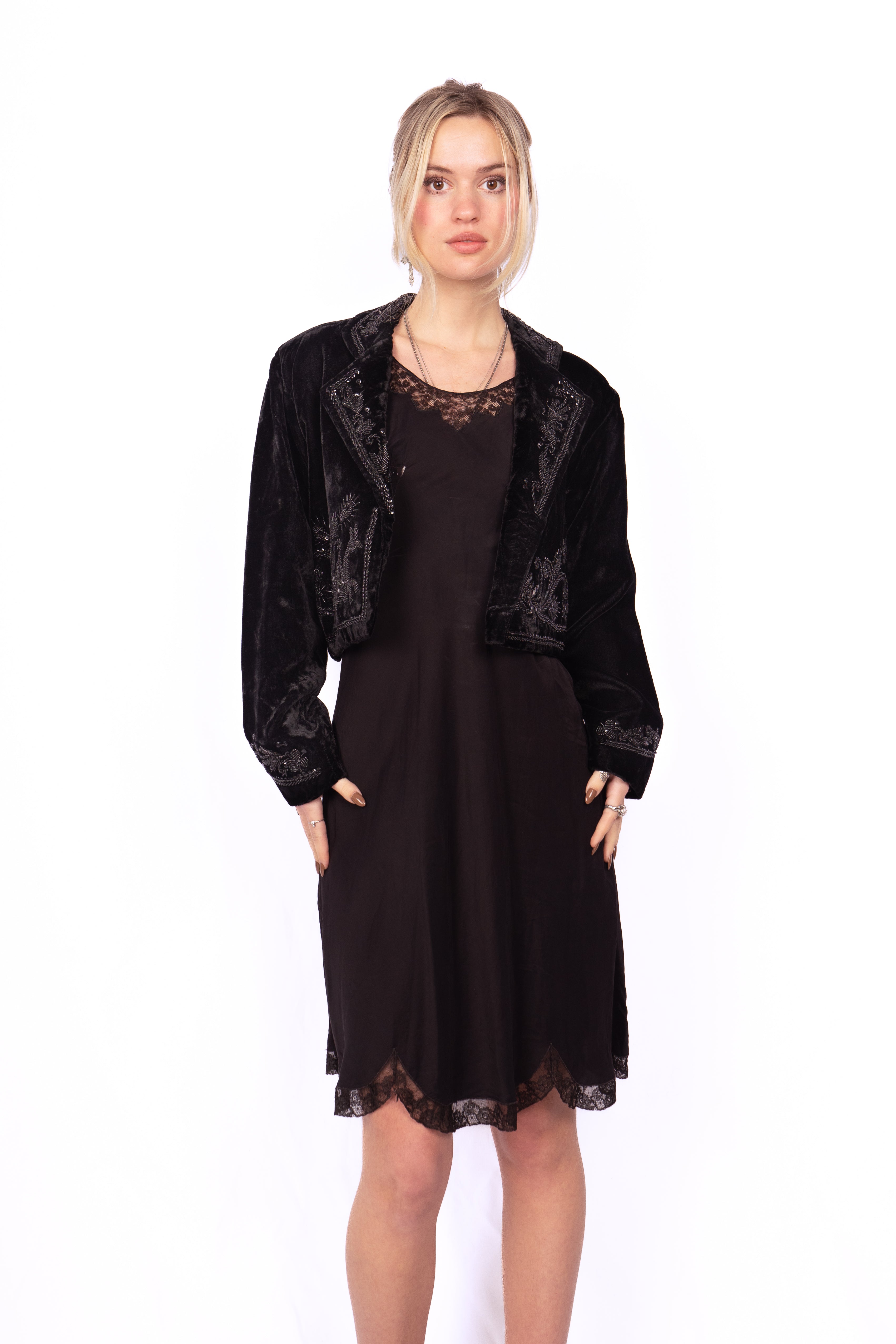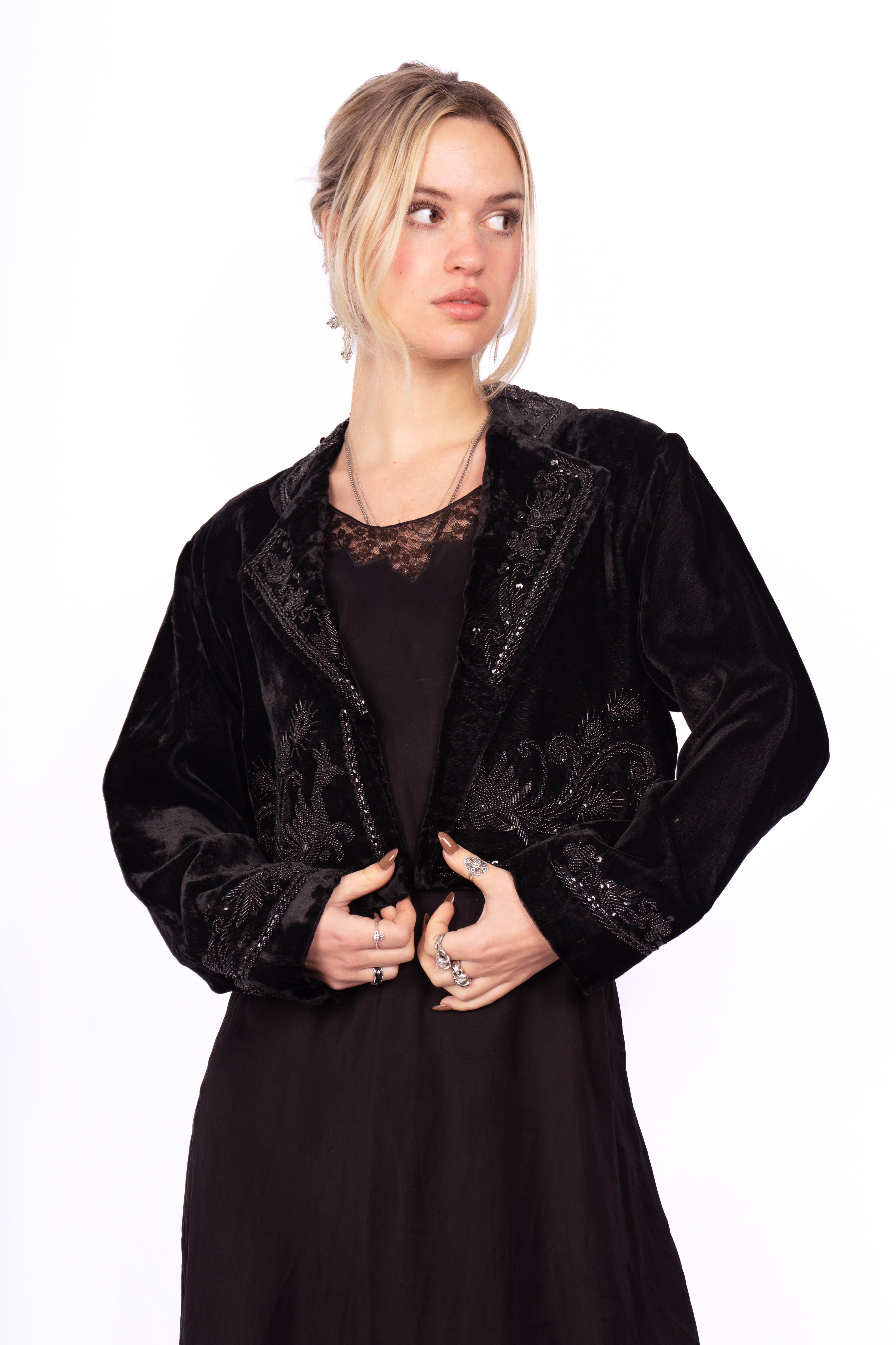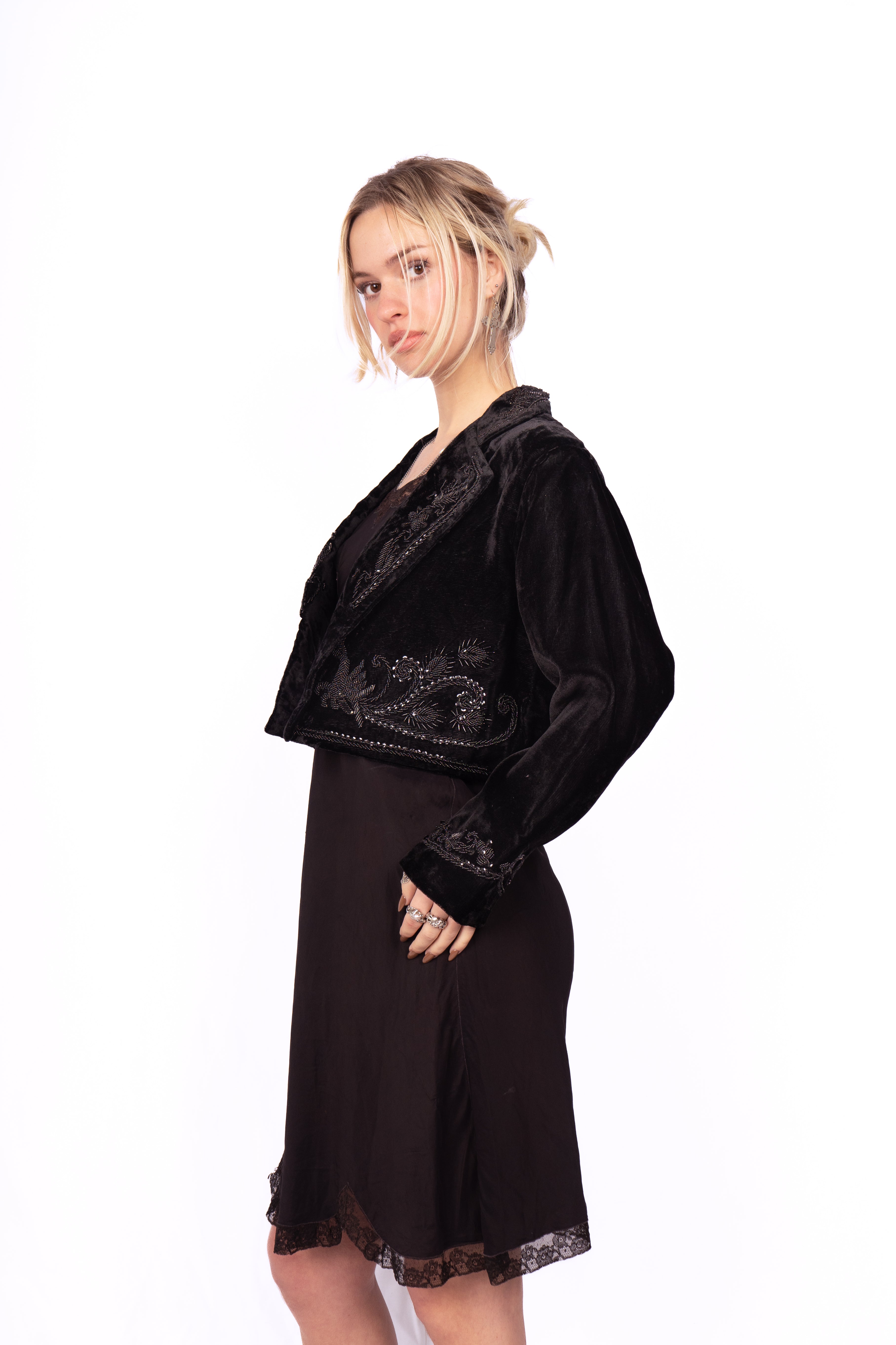 Beautiful Victorian-style embellished velvet cropped jacket. Likely inspired by Victorian mourning garb. The jacket is fully decorated front, back, collar and cuffs in beads and sequins. Perfect little black jacket to make any outfit more glamorous. Throw it over a silk and/or lace slip dress for a timeless look. No major damage, some loose threads and minor bead loss.