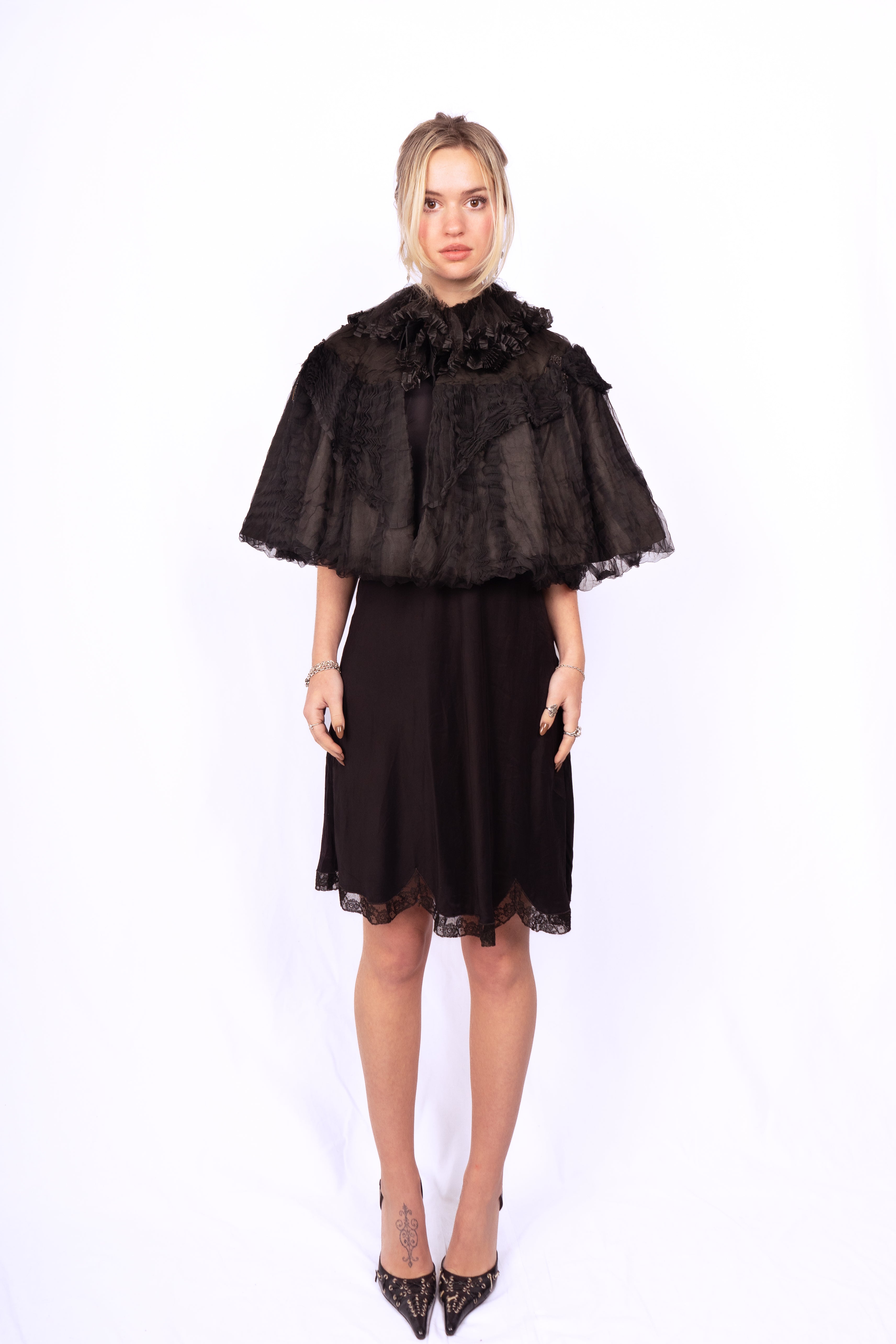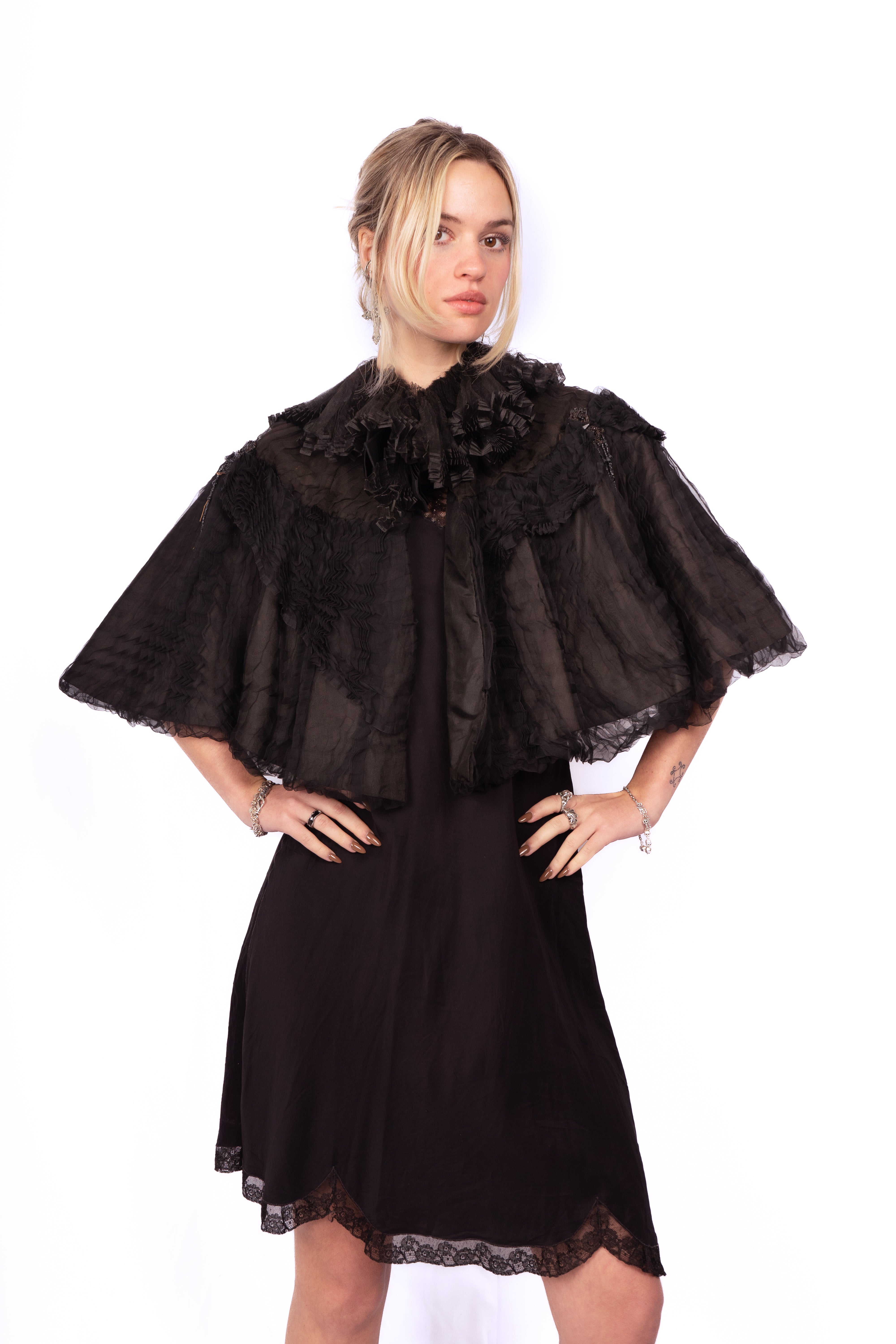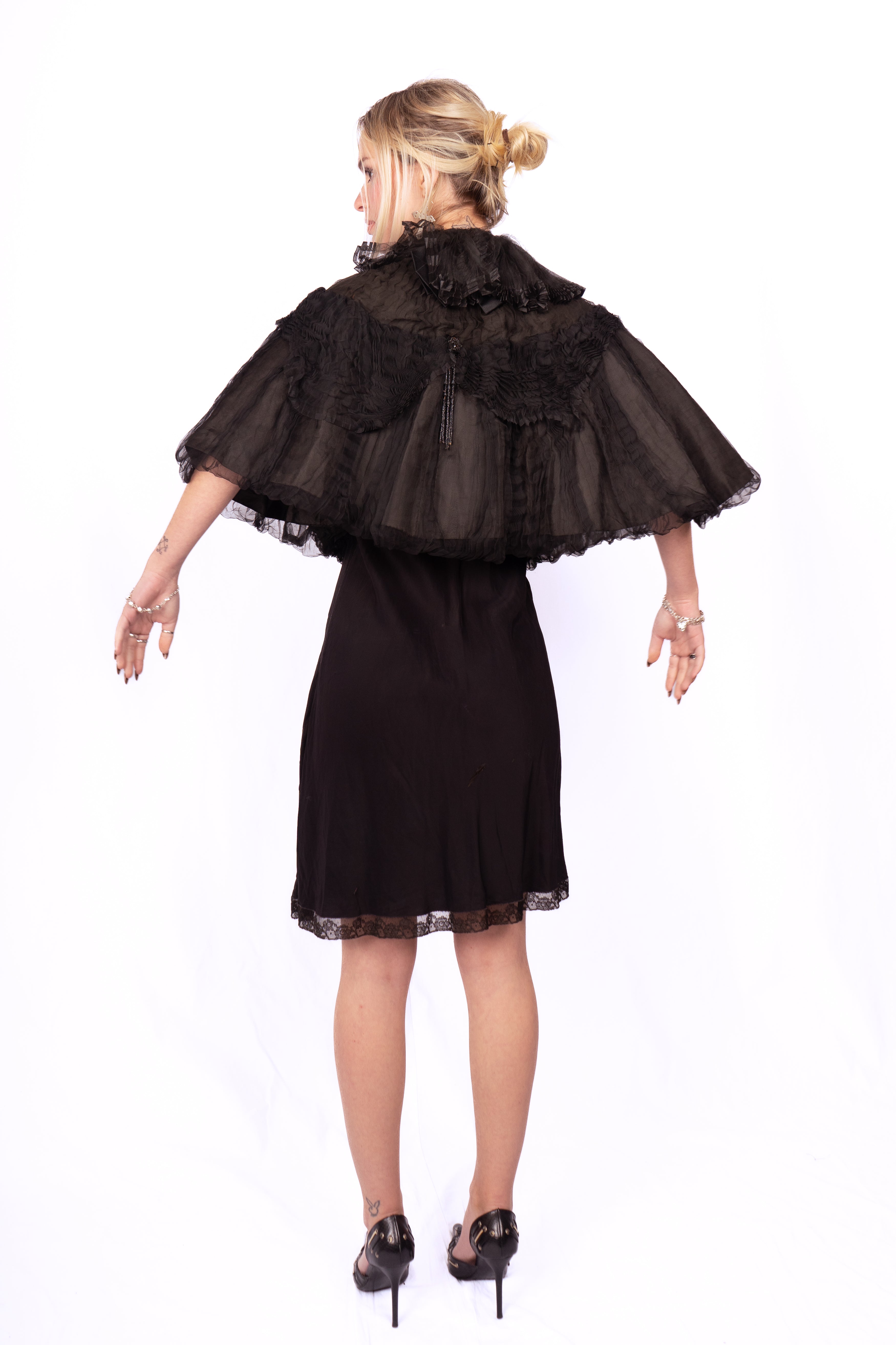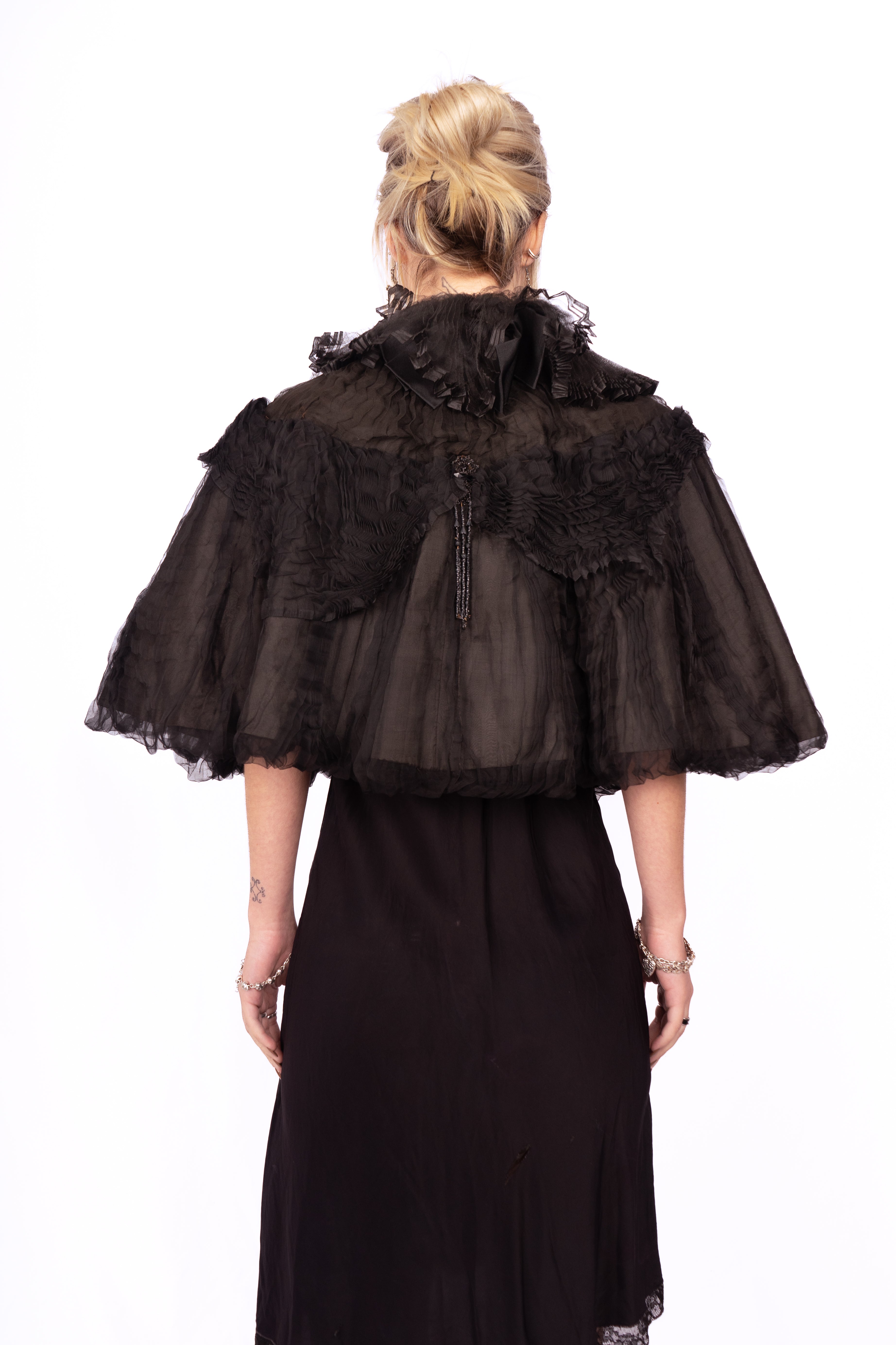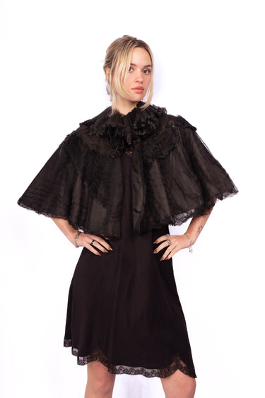 Stunning inky black sheer micro-pleated silk mourning cape from the late 1800's-early 1900's. Stunning ruffled silk net collar and beaded appliqués with dangling strands of black beads. The cape is lined with silk and there is a stiffer material inside to maintain its structure. There are 5 hook-and-eye closures from the top of the neck down about 5-6." It is in great condition, there is some minor bead loss and some tearing in the net on the collar. This is a great layering piece and it would be incredible over a black silk or lace gown.