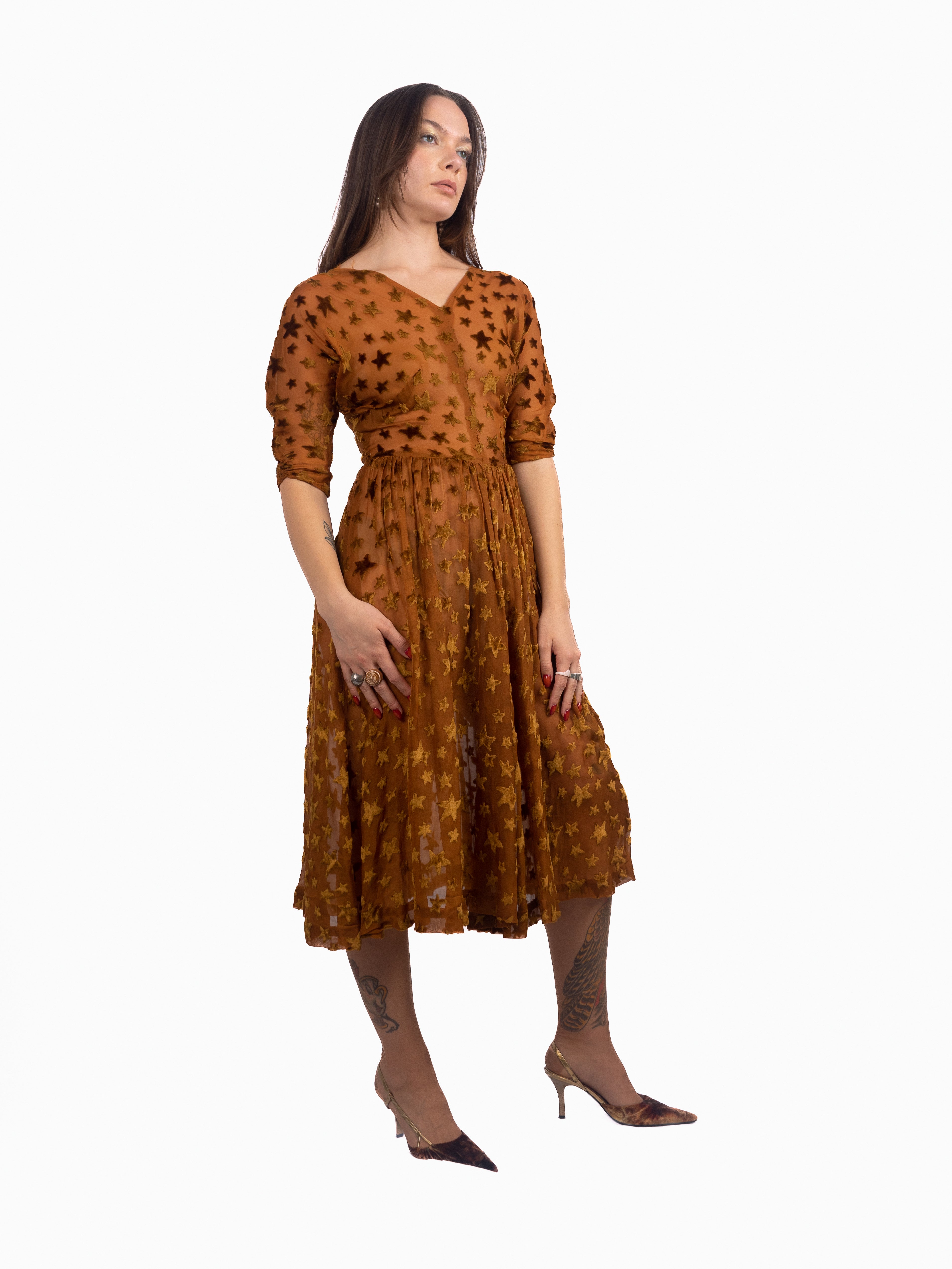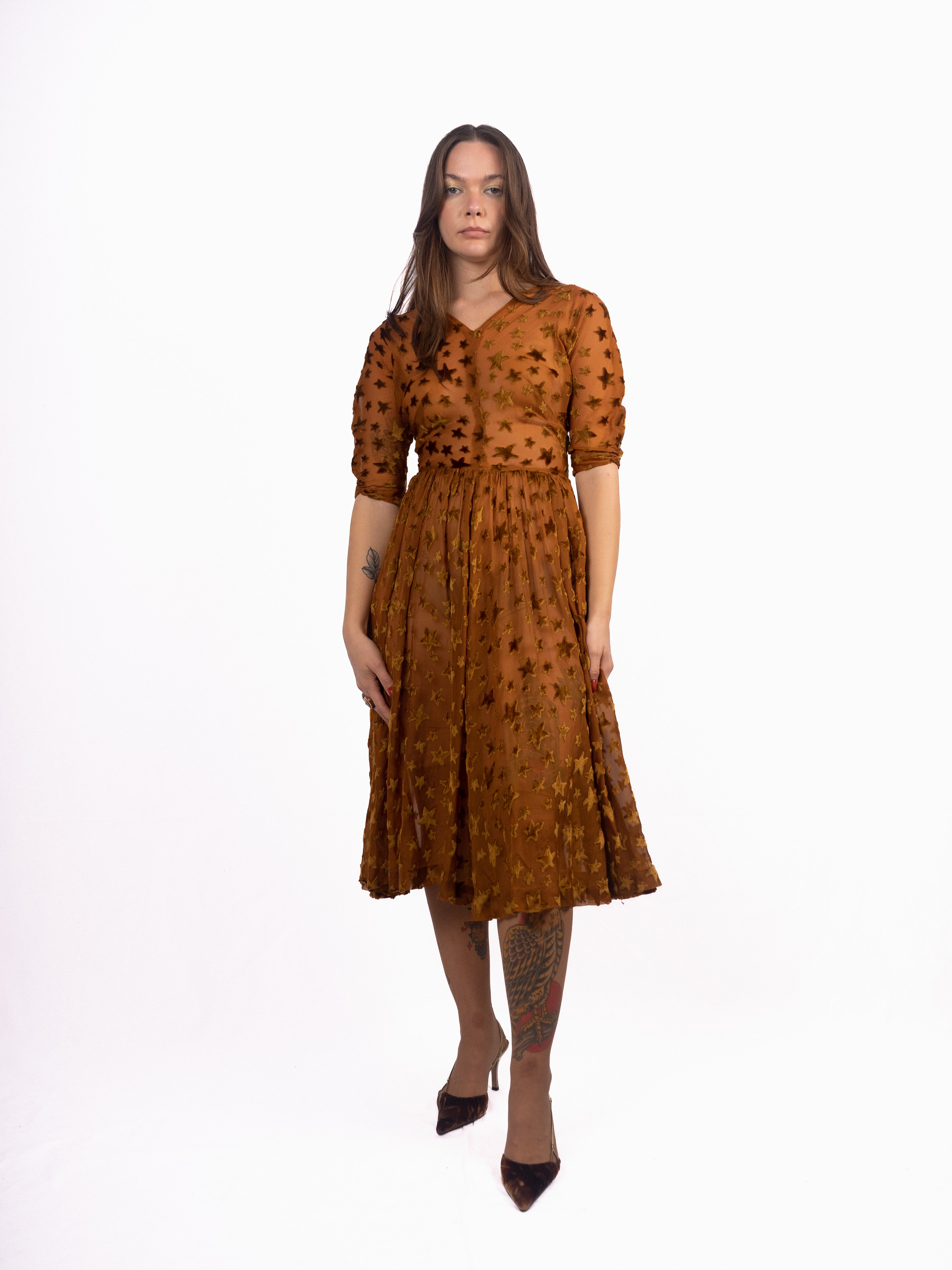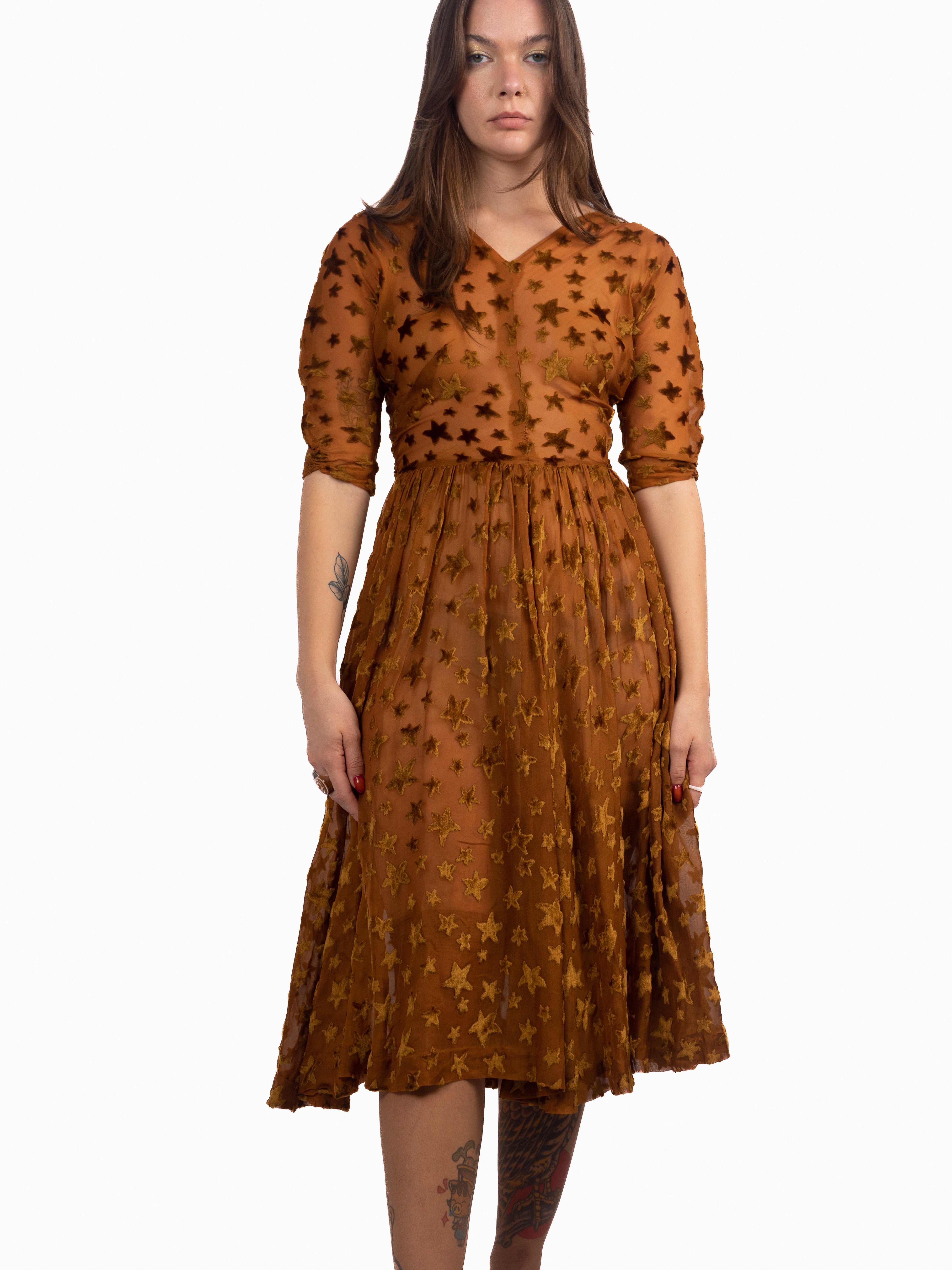 1940's dress made of 1920's star print voided, deep pile, velvet fabric. Gorgeous gathering in the skirt creates great movement. The stars are very fluffy, super soft velvet; all done in this rich caramel color. Minor fraying at seams and splitting at shoulder seam. Small holes at each side of the waist/side seams where the bodice meets the skirt. Otherwise in good vintage condition. The skirt and bodice have some give, but the waist seam and armholes have little to no stretch.
