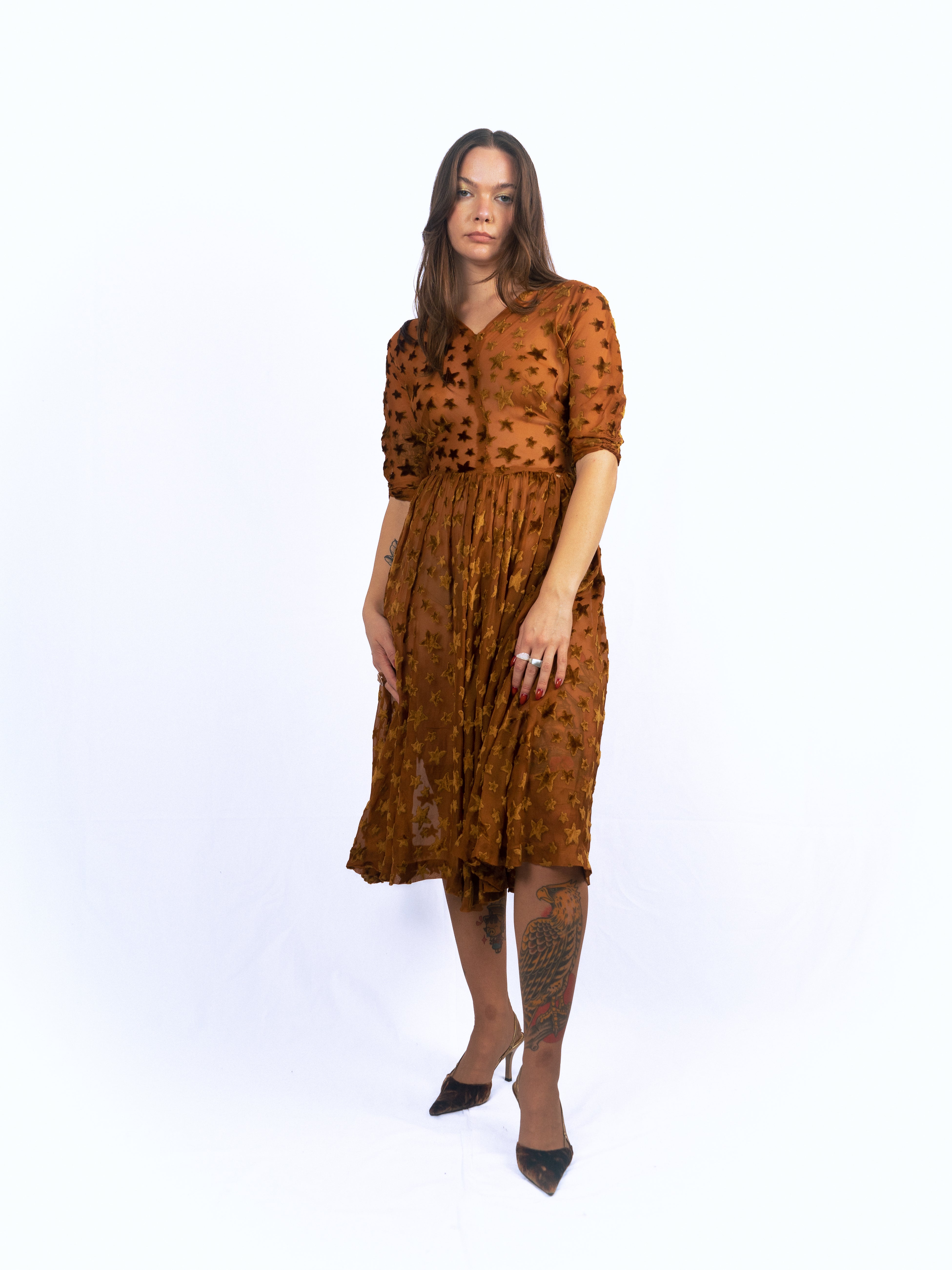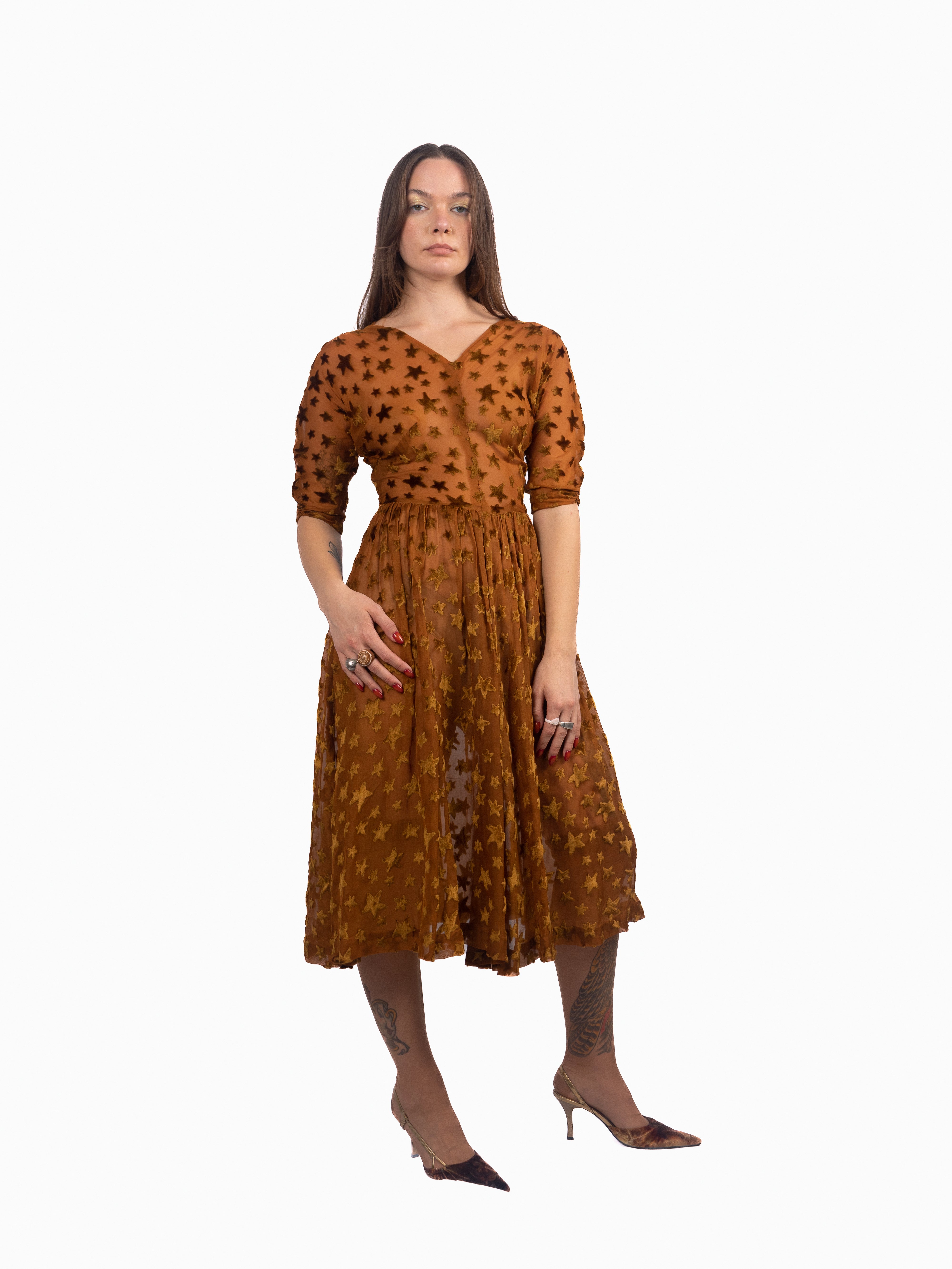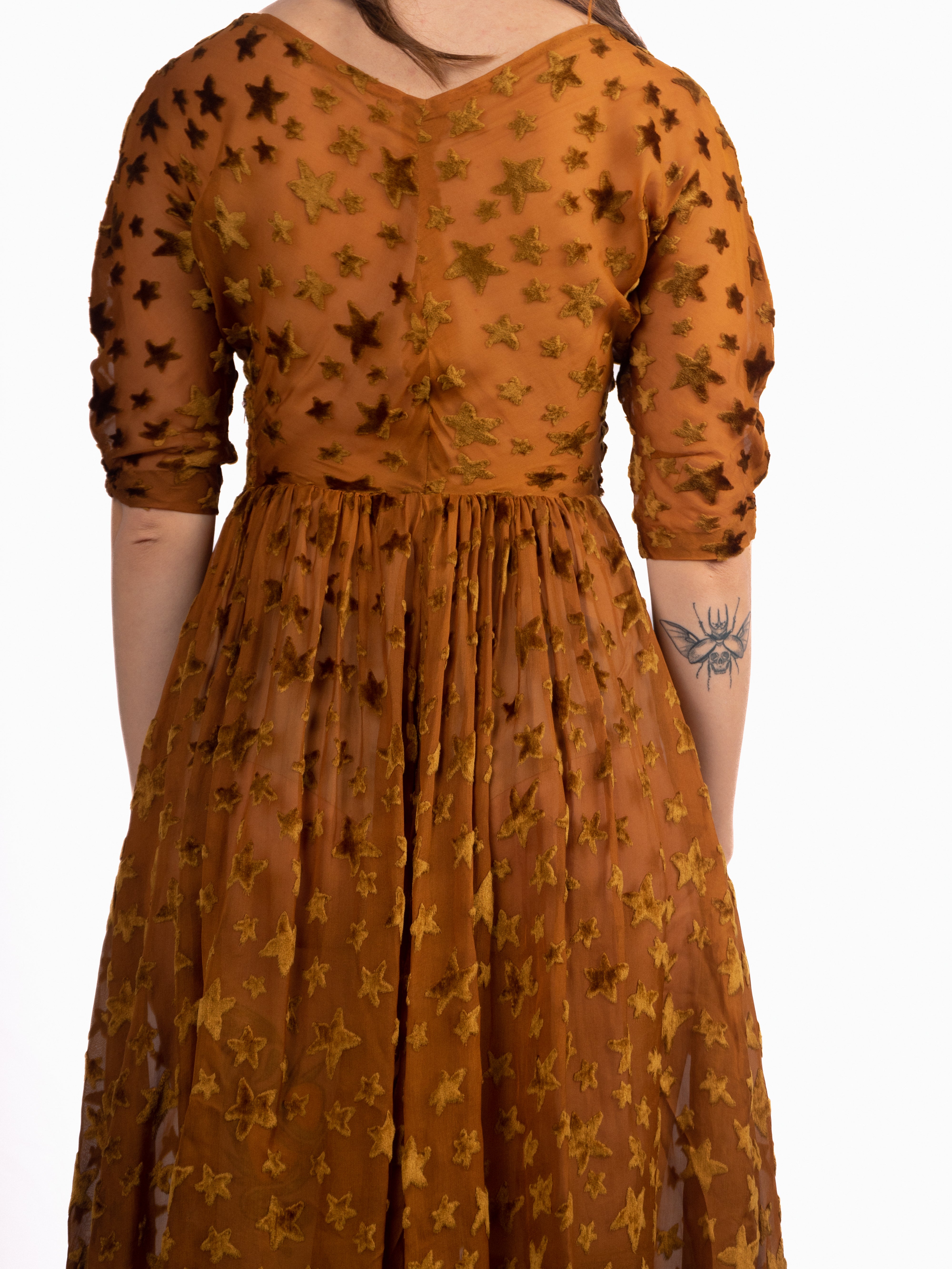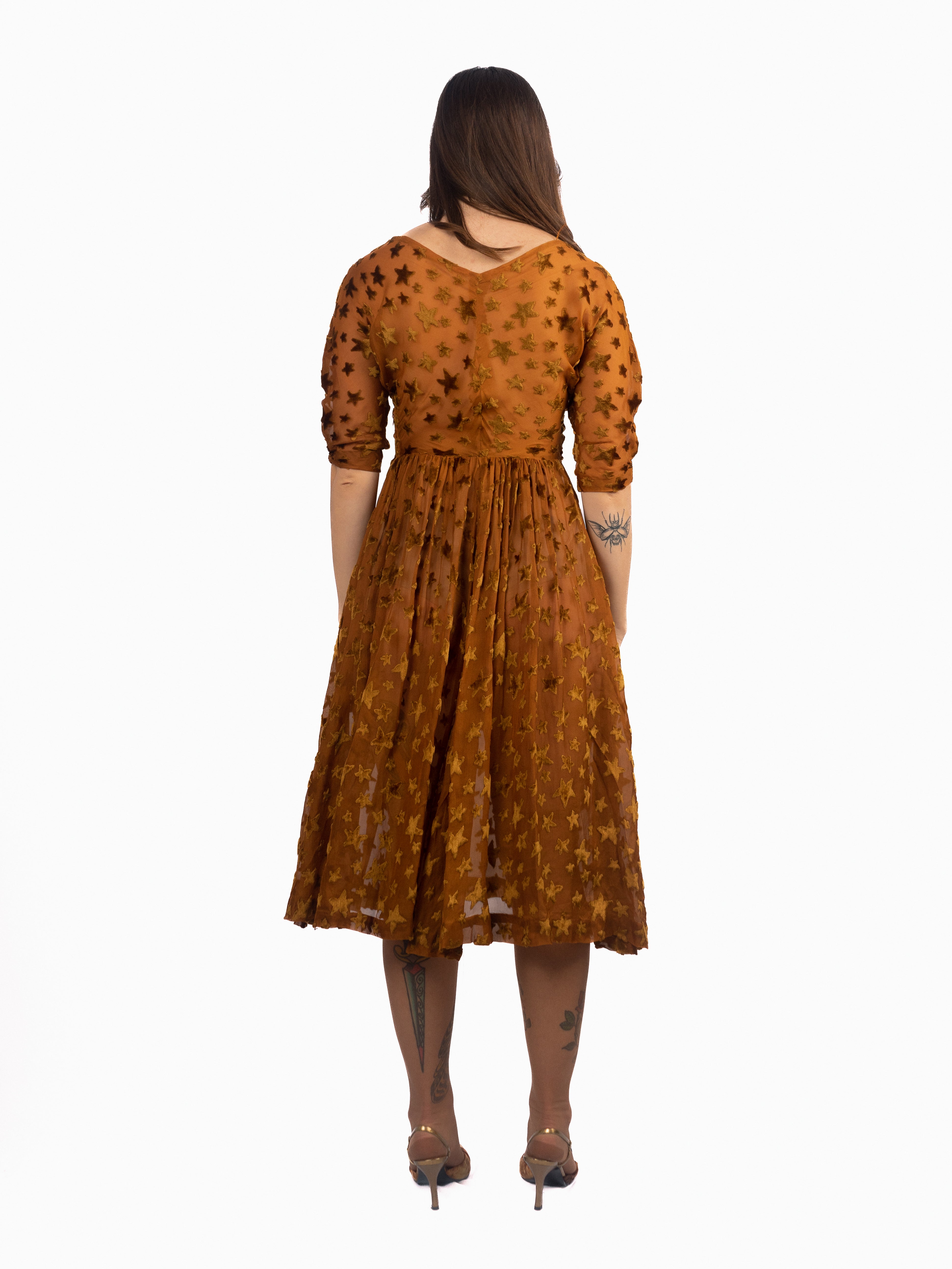 1940's dress made of 1920's star print voided, deep pile, velvet fabric. Gorgeous gathering in the skirt creates great movement. The stars are very fluffy, super soft velvet; all done in this rich caramel color. Minor fraying at seams and splitting at shoulder seam. Small holes at each side of the waist/side seams where the bodice meets the skirt. Otherwise in good vintage condition. The skirt and bodice have some give, but the waist seam and armholes have little to no stretch.