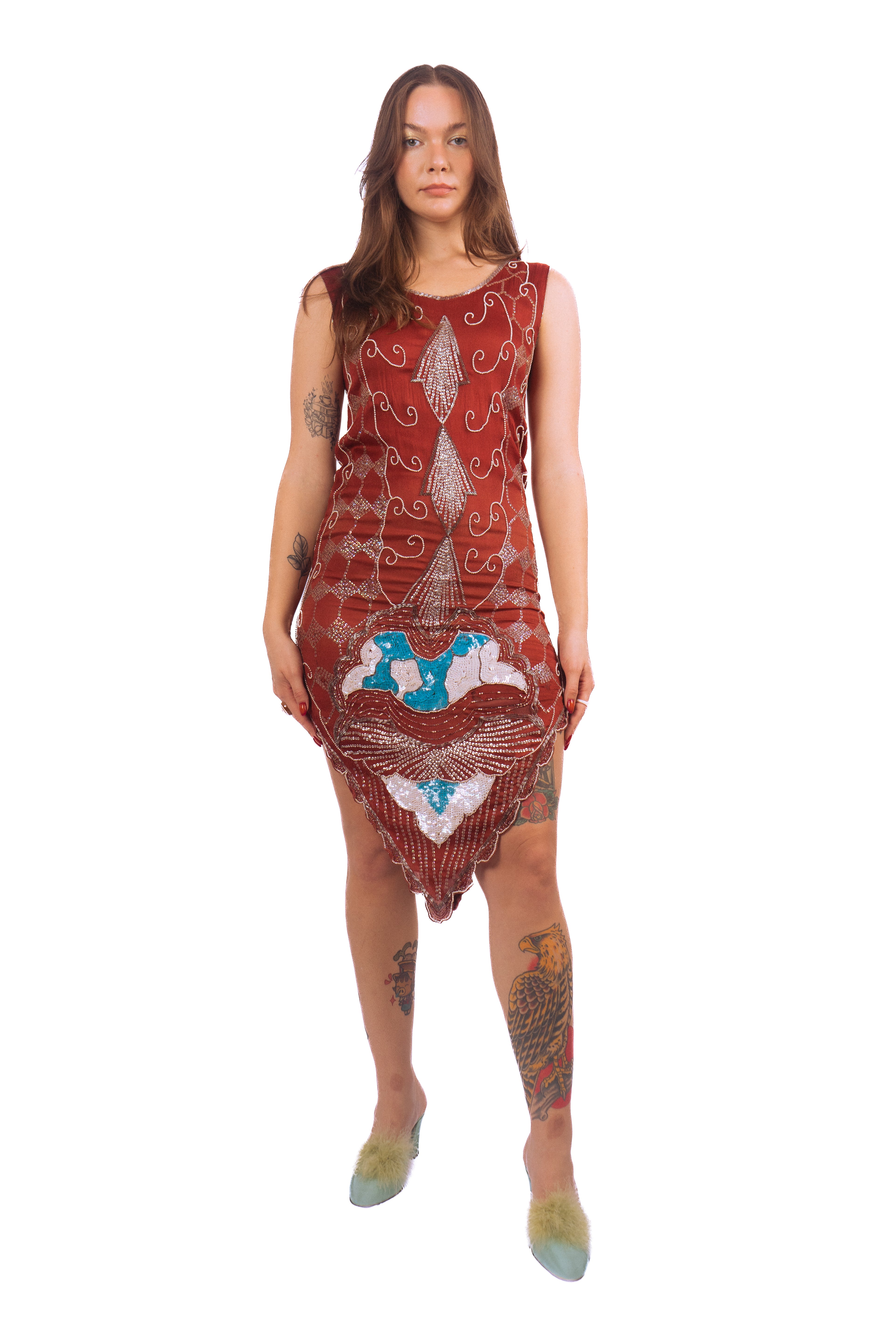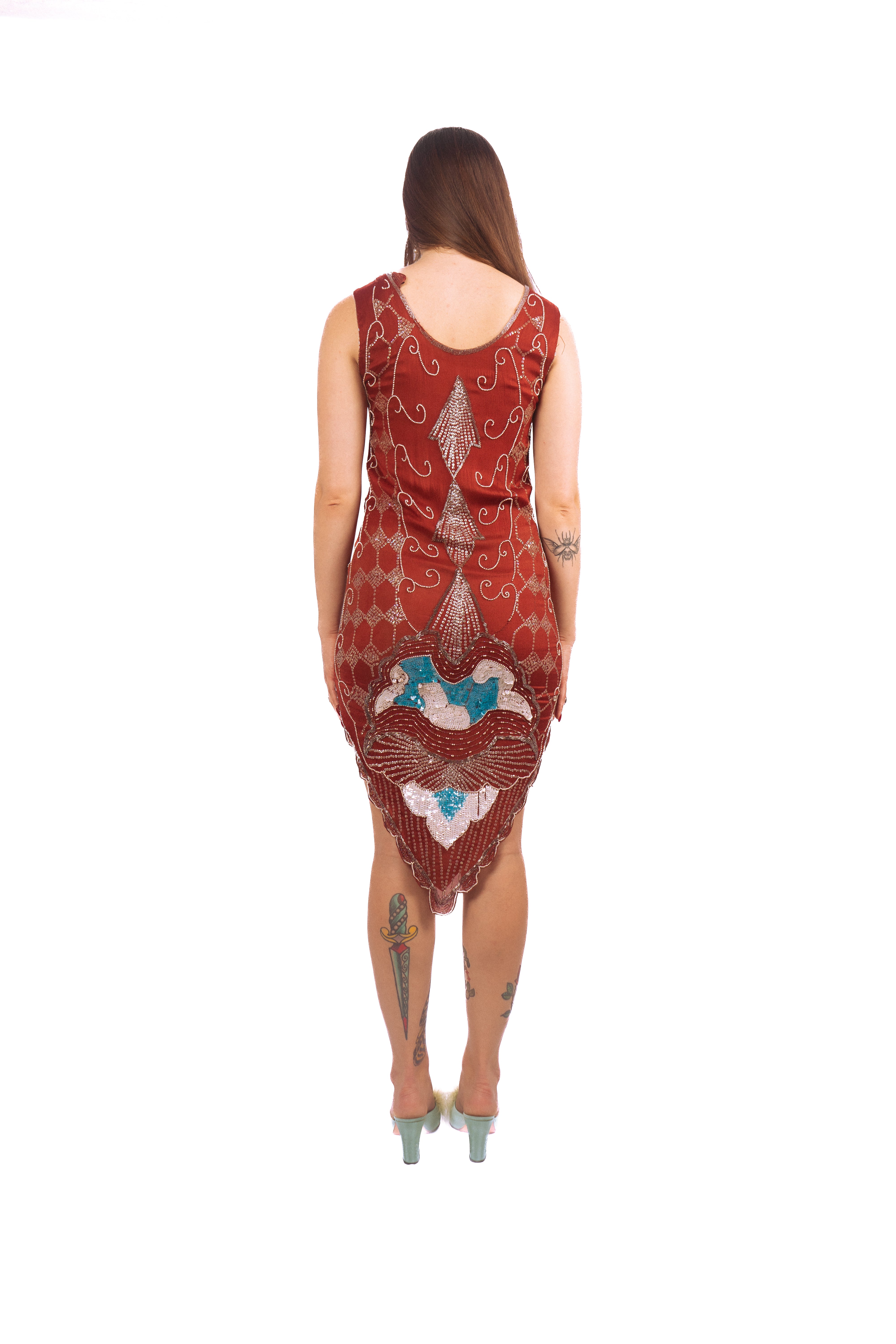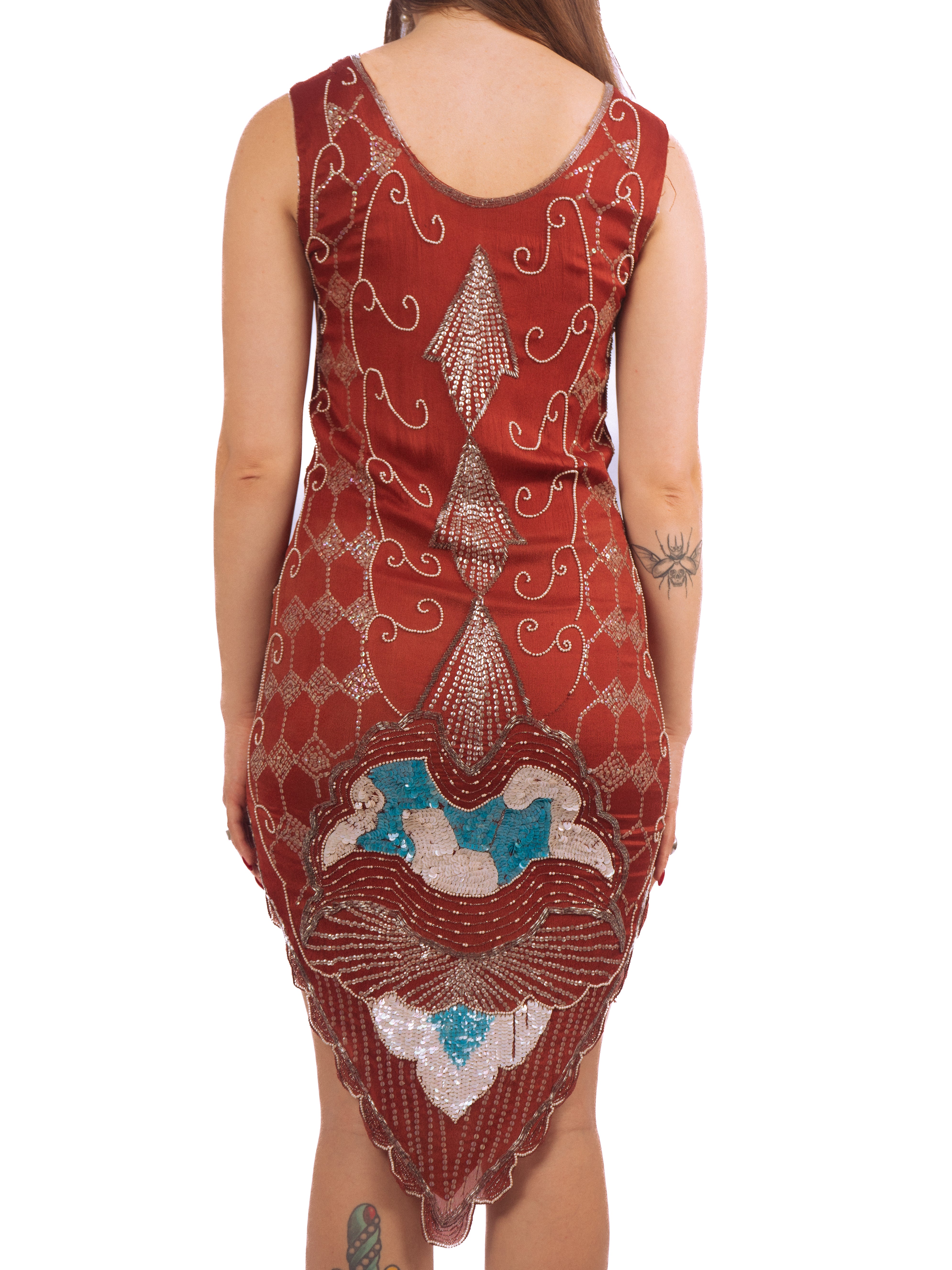 Gorgeous 1980's does 1920's over-dyed rust color silk flapper/sheath dress with glass & pearl beads, and sequins in a stunning deco design. Made in India tag featuring a scalloped V-shaped bottom hem. Some moderate bead loss and loose threads throughout, holes in the back where the beading is separated. In fair vintage condition.