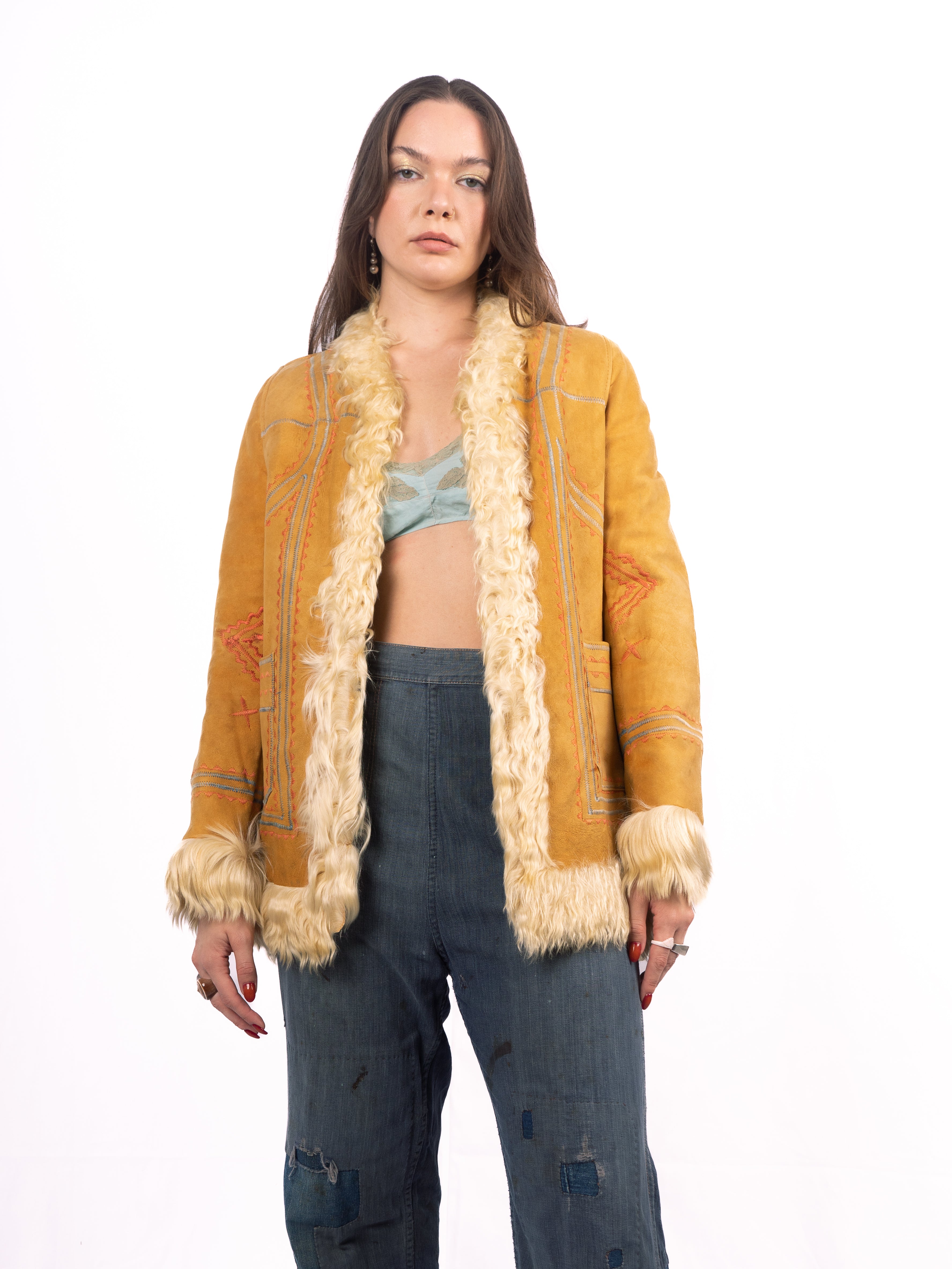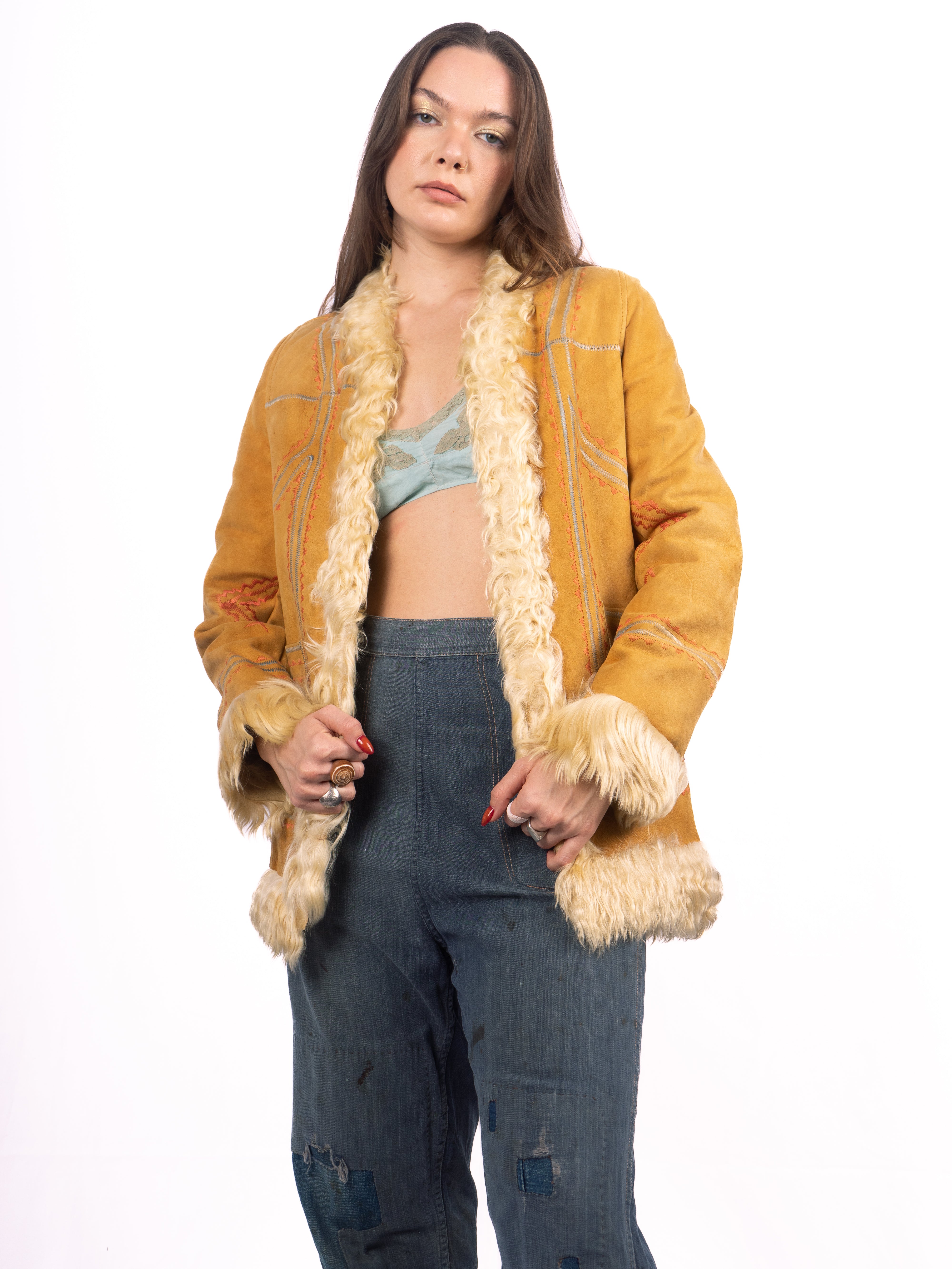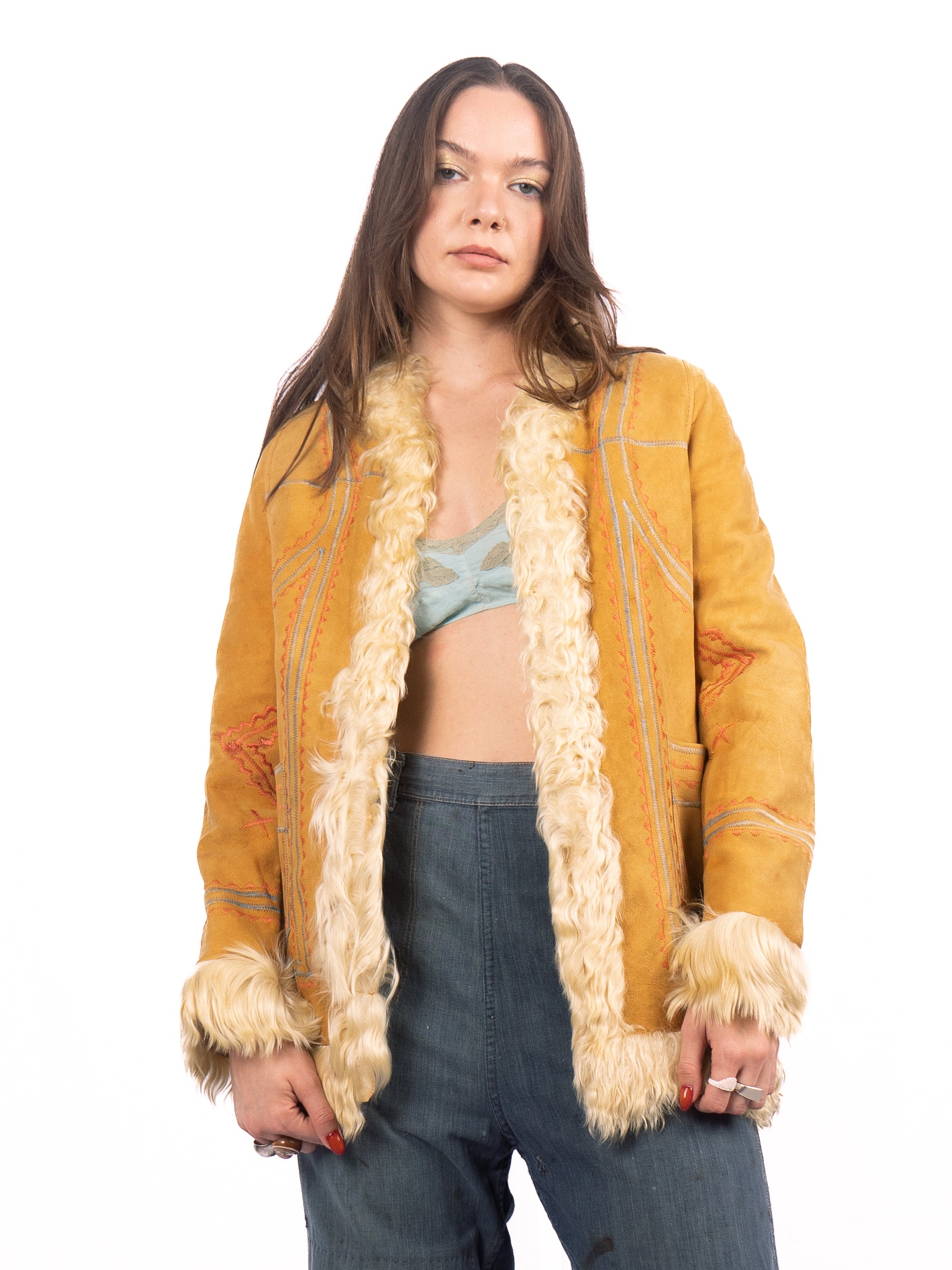 Gorgeous & classic 1960's suede, embroidered penny lane. Sheerling-lined and mongolian lamb-trimmed, featuring large hook-and-eye closure. This is the perfect fall/winter piece. These are coveted, and this one is in great shape. Some wear present throughout, in good vintage condition.