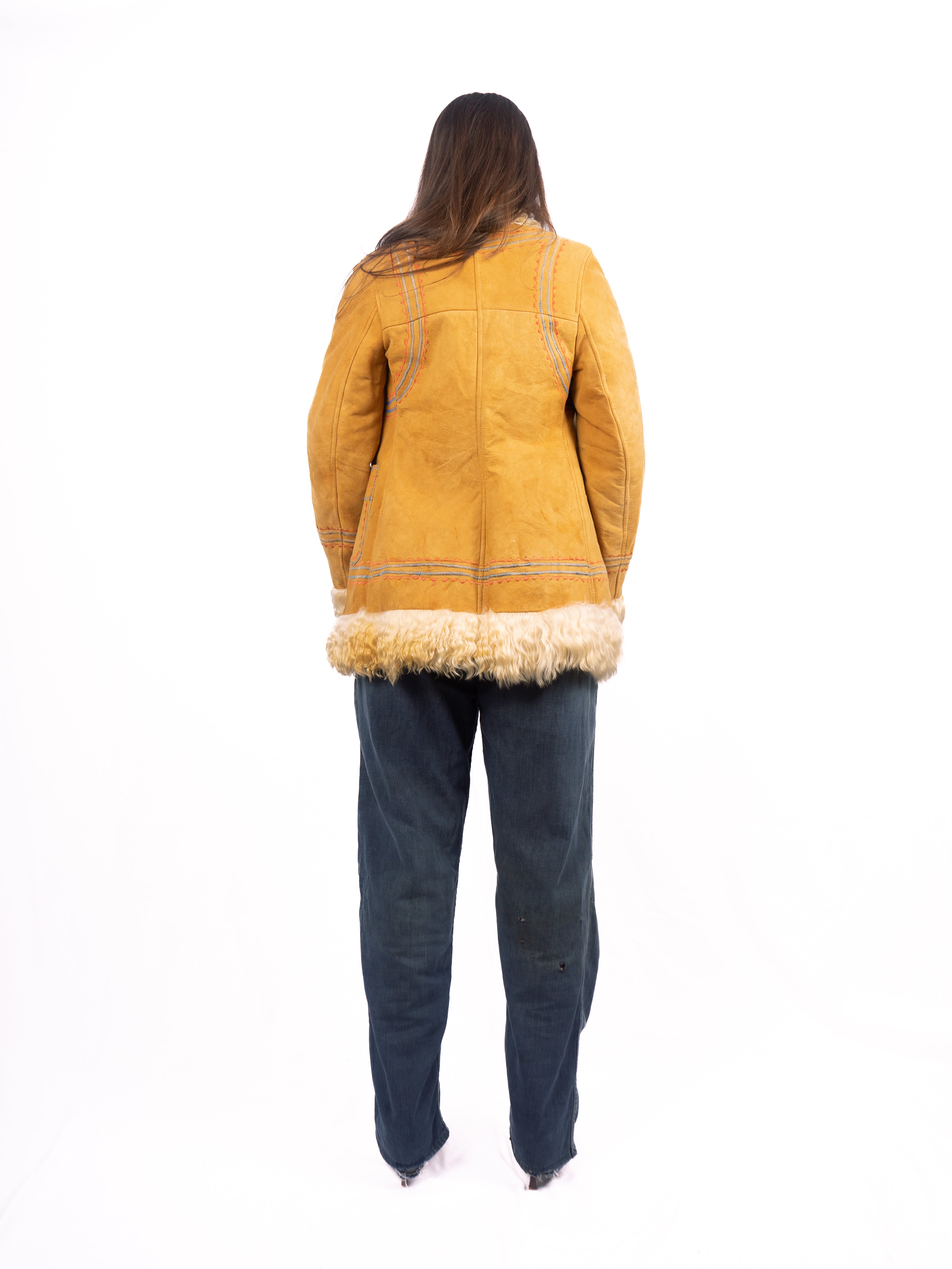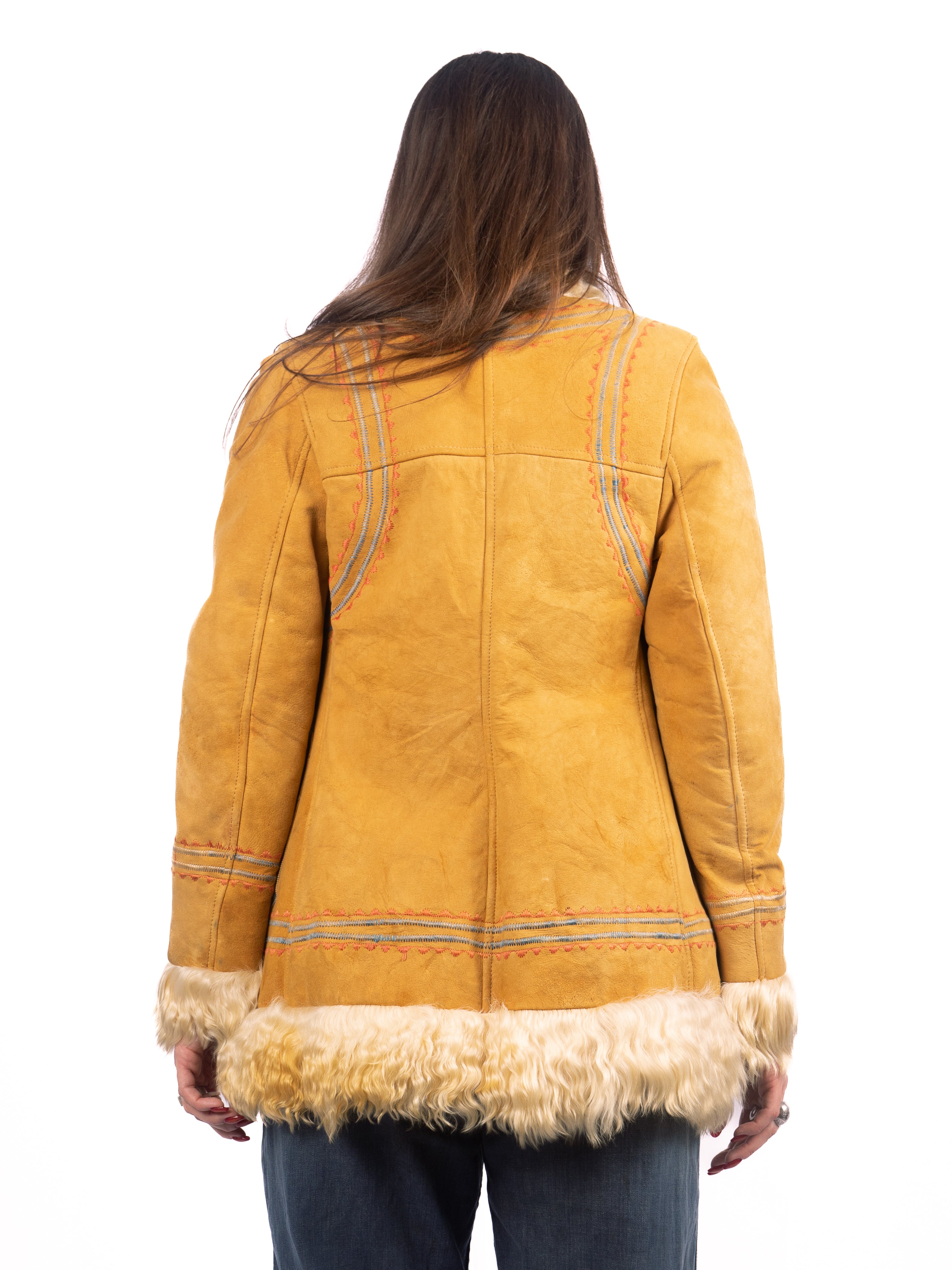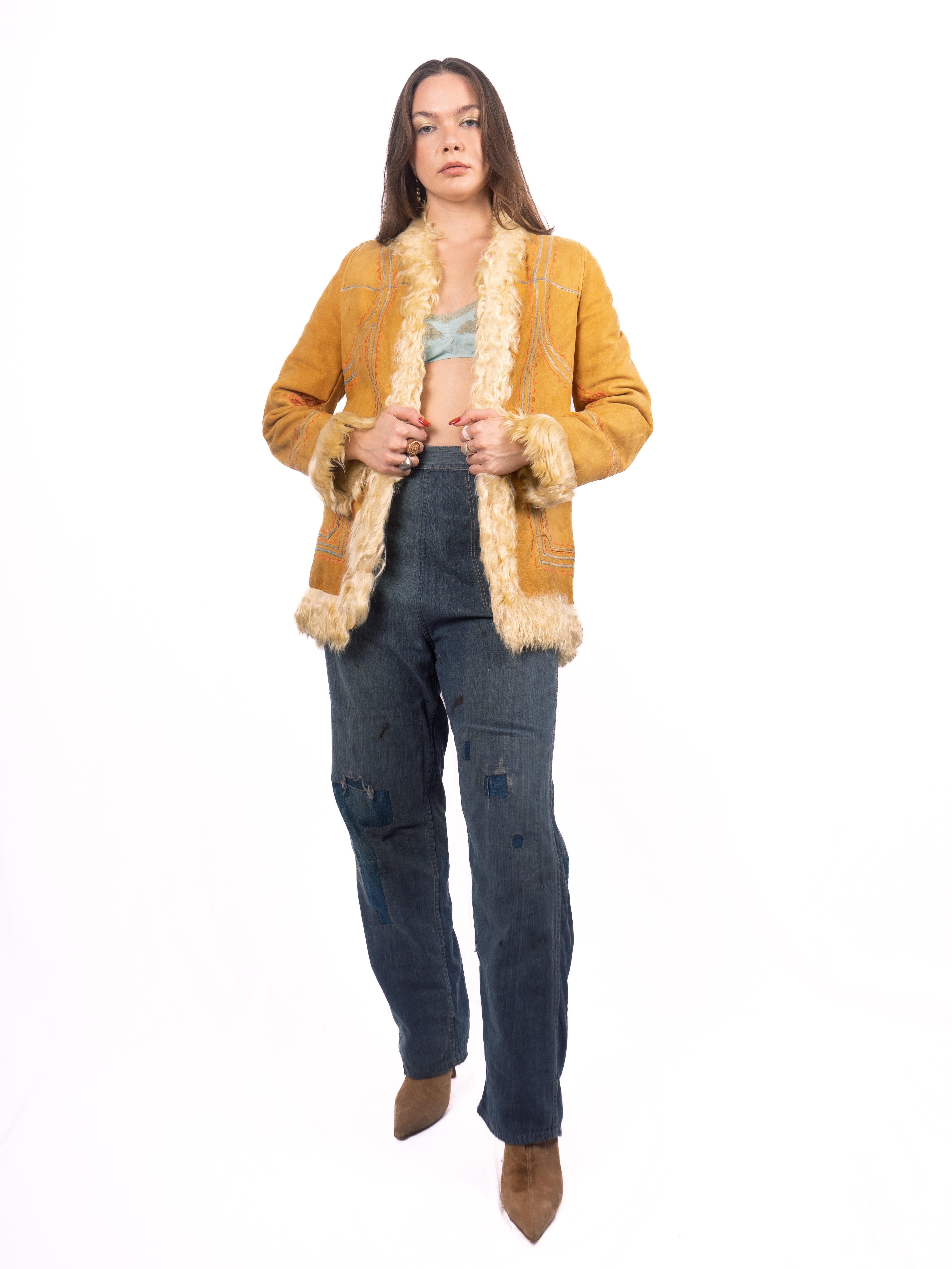 Gorgeous & classic 1960's suede, embroidered penny lane. Sheerling-lined and mongolian lamb-trimmed, featuring large hook-and-eye closure. This is the perfect fall/winter piece. These are coveted, and this one is in great shape. Some wear present throughout, in good vintage condition.