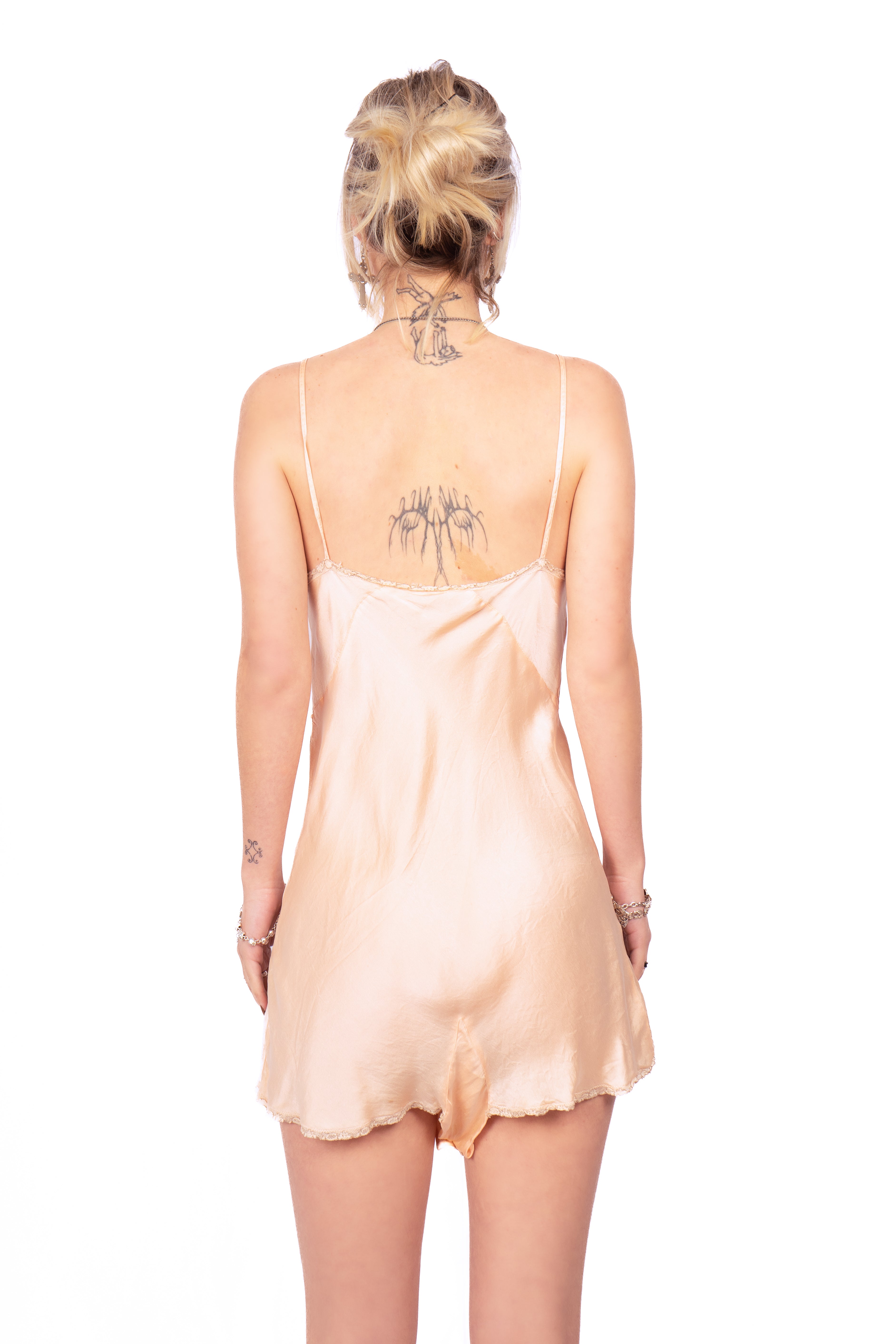 The perfect little 1930's romper, step-in made of soft candlelit blush bias-cut silk charmeuse, featuring ecru Alençon lace applique and trim. Spaghetti straps and mother of pearl button closure at the crotch. Such a stunning piece, perfect on its own or layered. She could be worn like a bodysuit with pants, shorts, or a skirt, just showing the step-in like a top. Bias cut creates a beautiful drape and allows some flex with sizing.