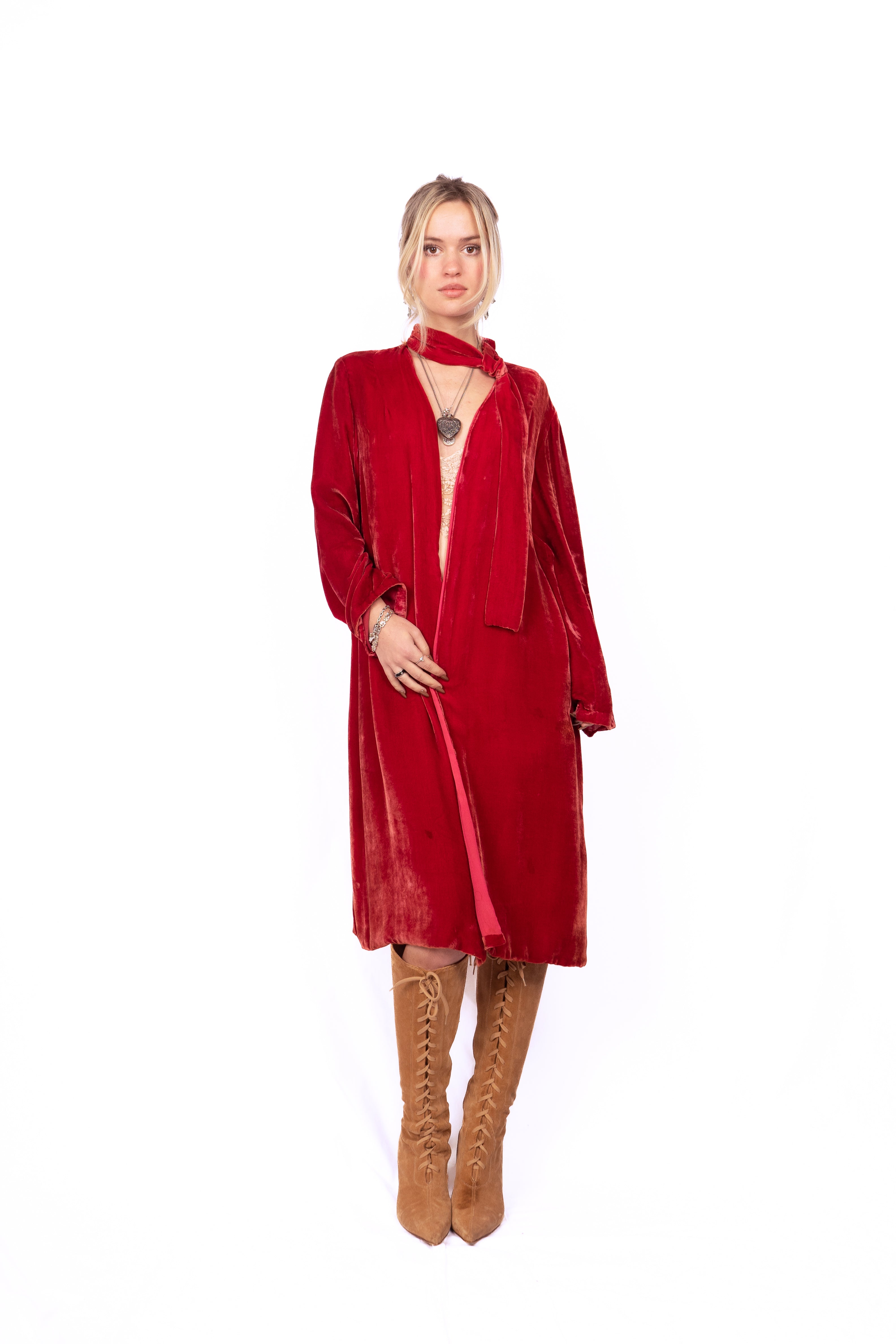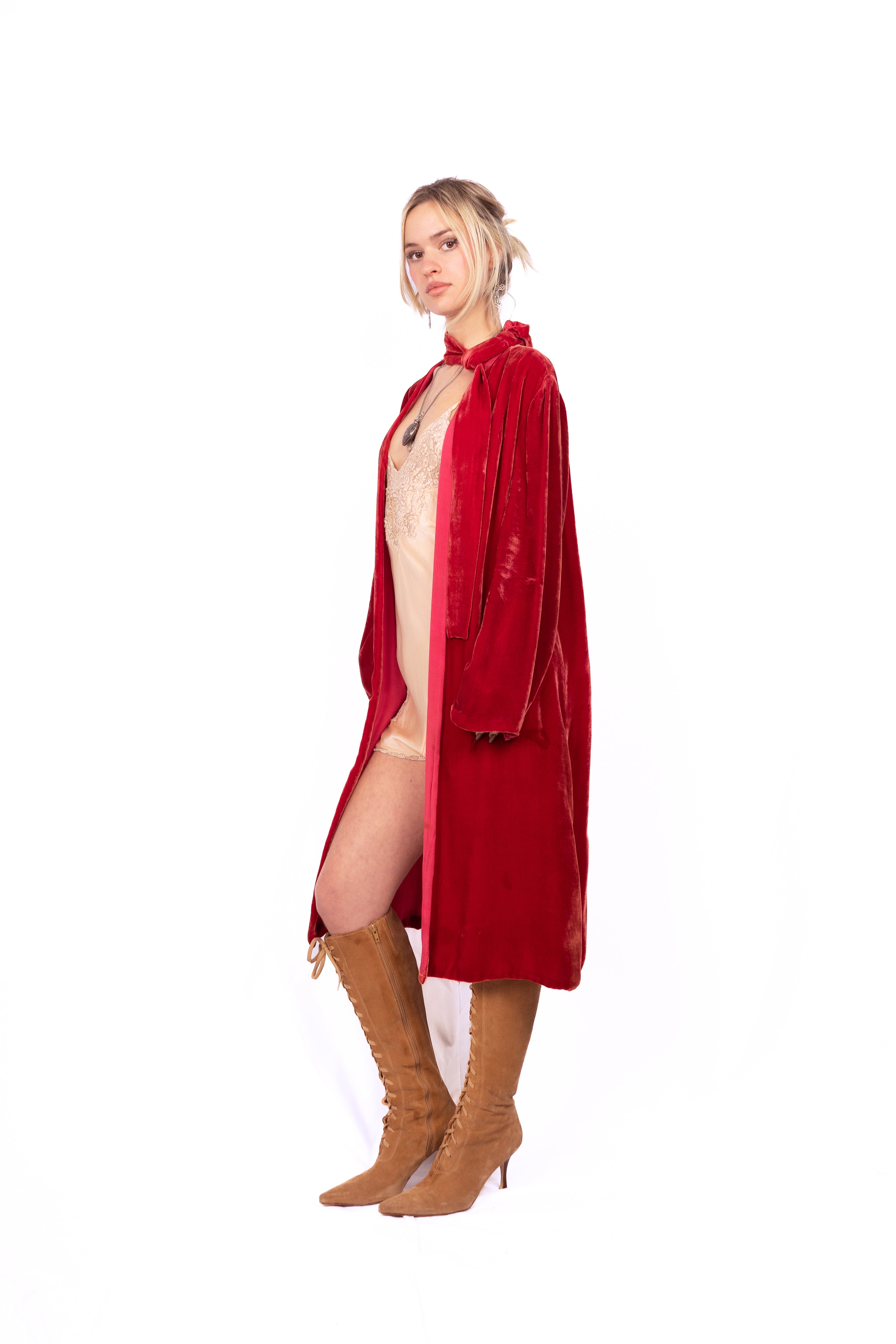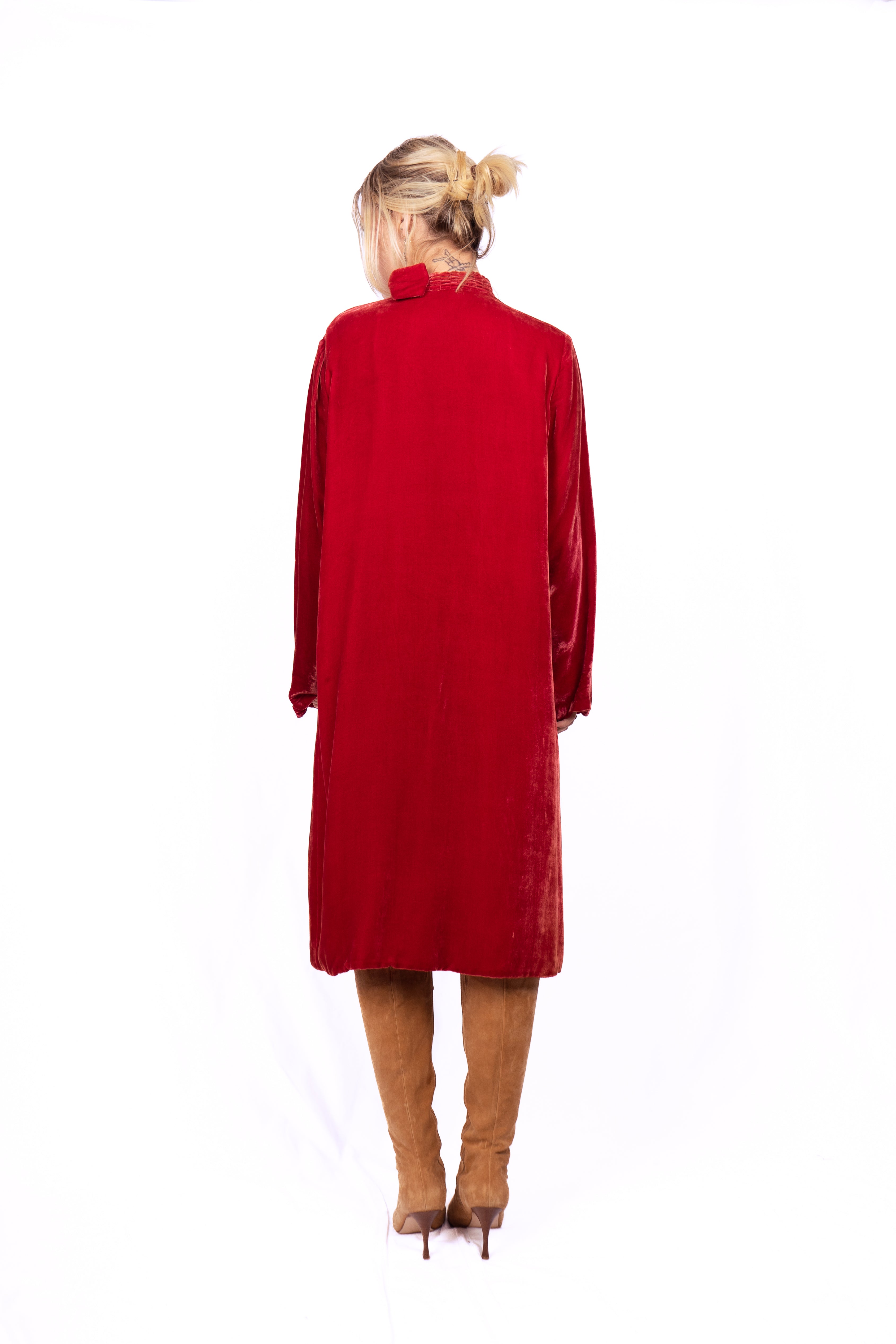Gorgeous ruby red silk velvet coat from the 1920's. This knee-length, long-sleeve beauty has the coolest neckline featuring a loop in the bow on the left shoulder that creates an opening for the neck tie allowing you to close the coat up top, (almost like a pussy bow). The coat is lined in and there are no closures. Simple cut and luxurious to the touch, very drapey, very bohemian.