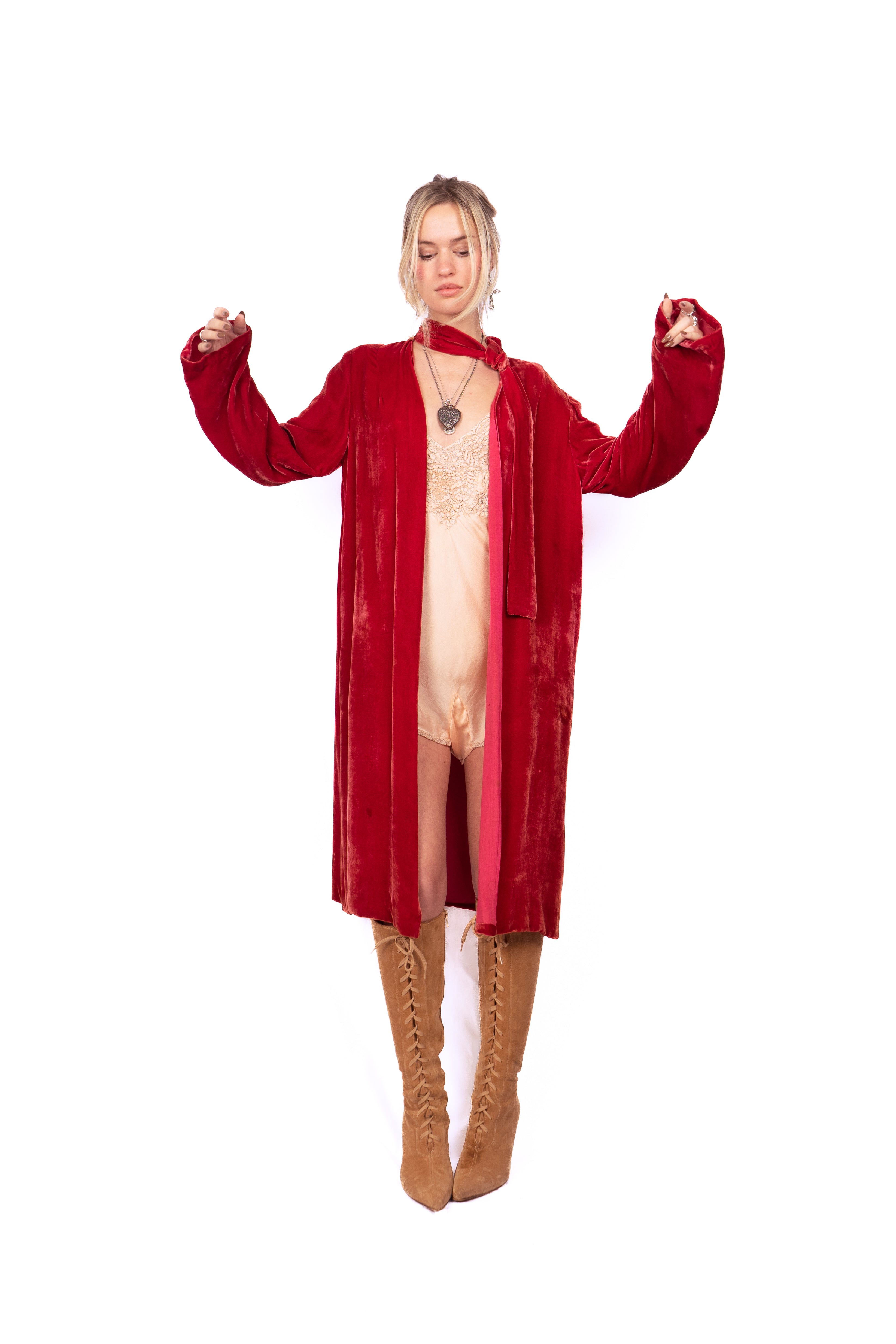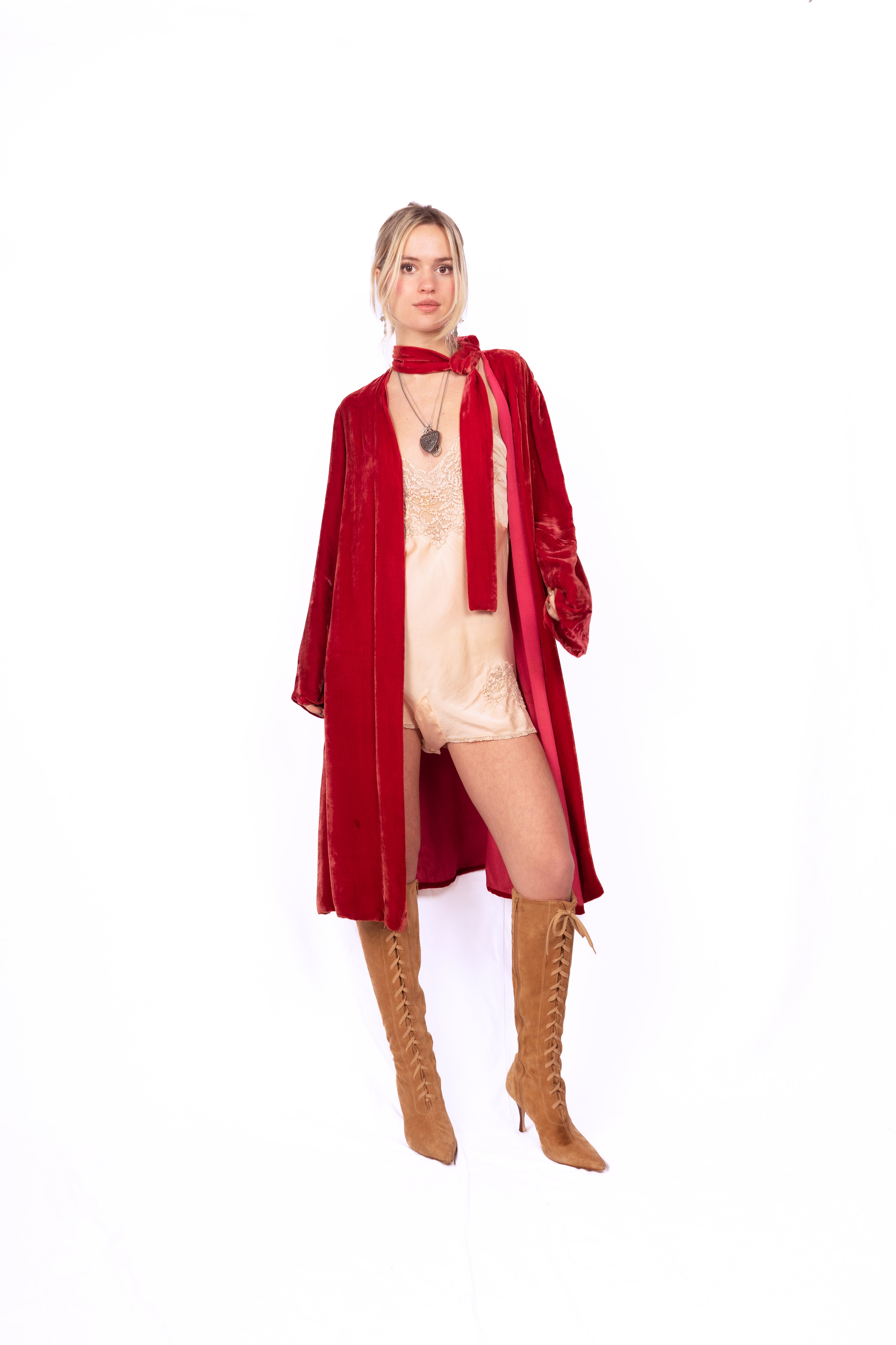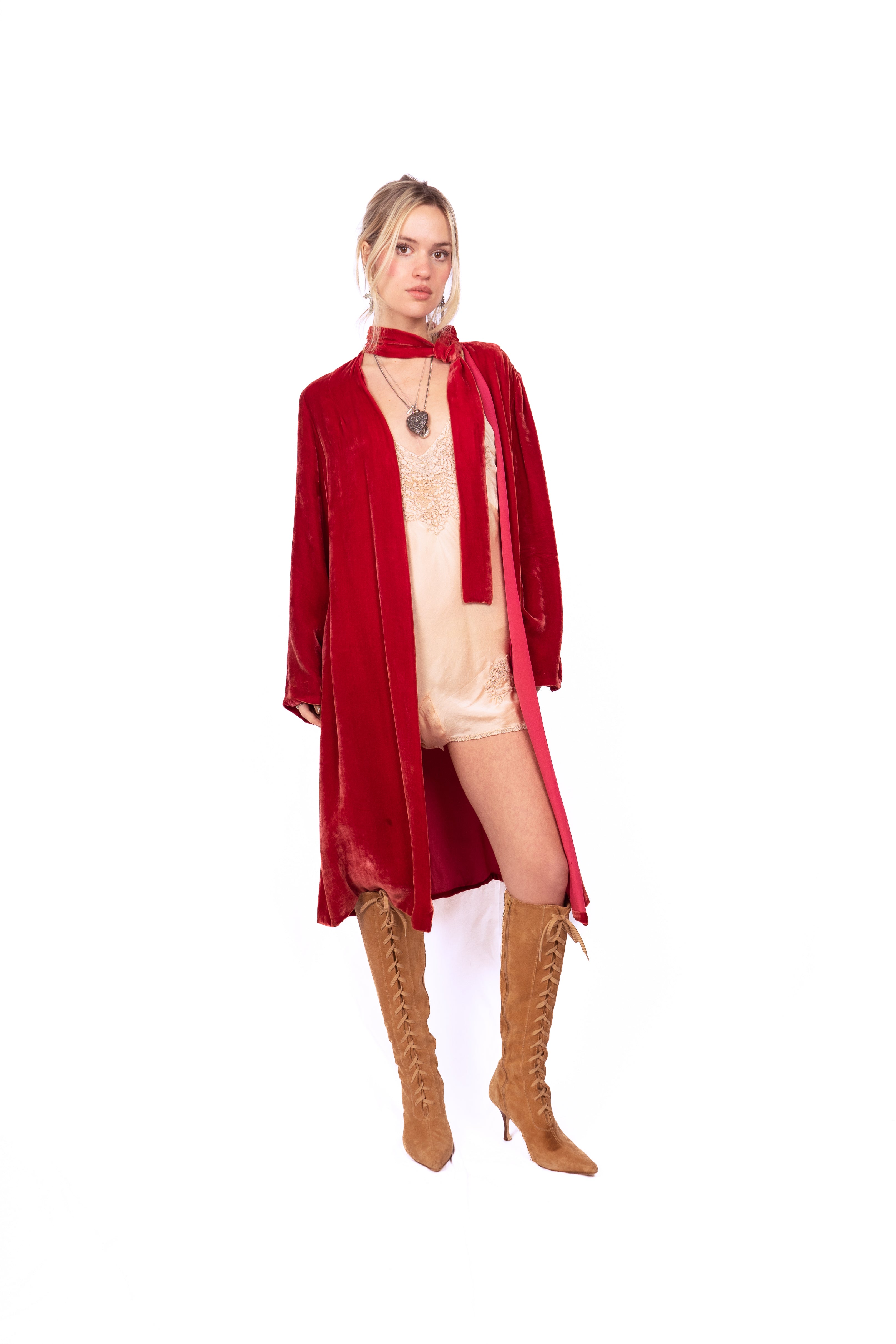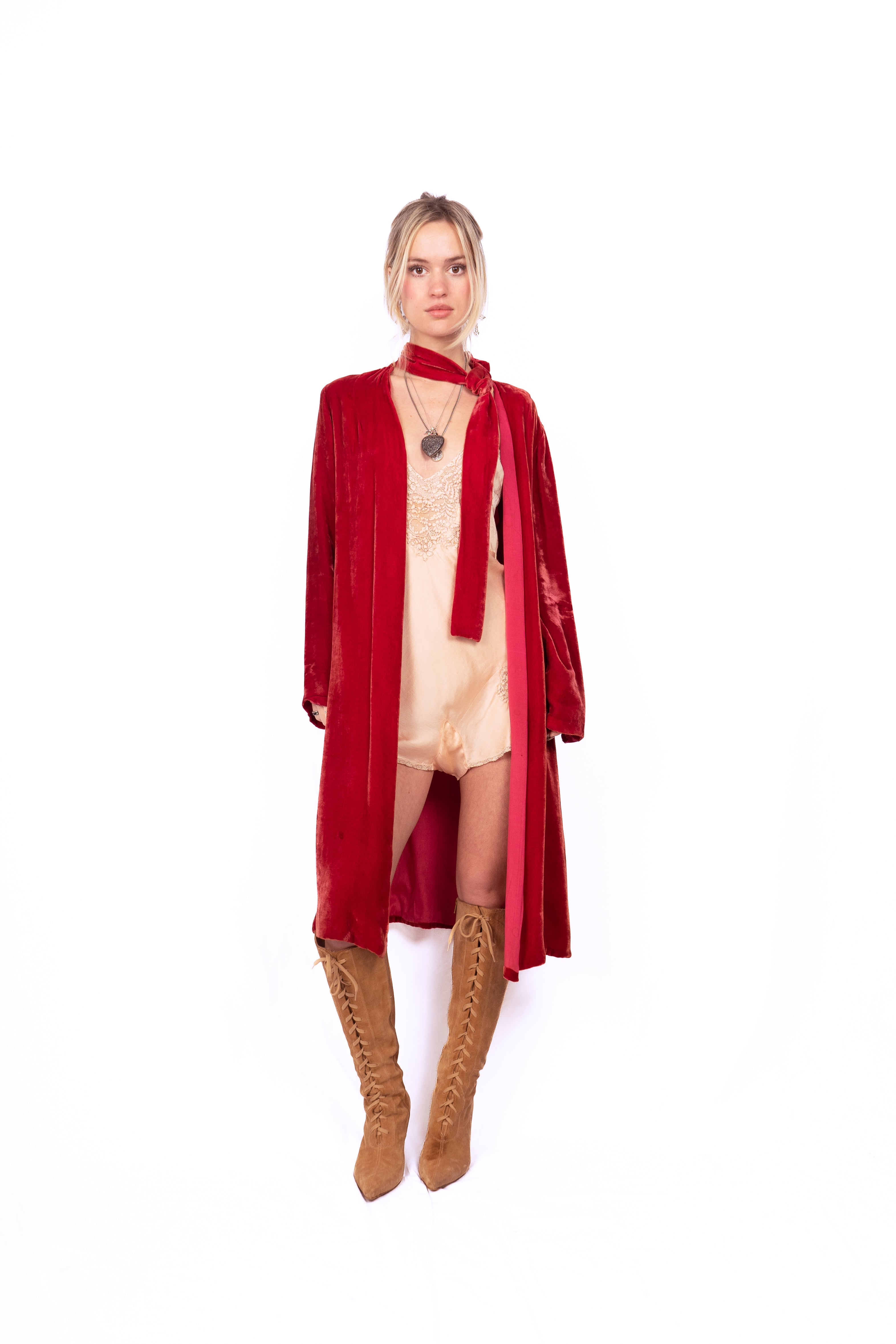 Gorgeous ruby red silk velvet coat from the 1920's. This knee-length, long-sleeve beauty has the coolest neckline featuring a loop in the bow on the left shoulder that creates an opening for the neck tie allowing you to close the coat up top, (almost like a pussy bow). The coat is lined in and there are no closures. Simple cut and luxurious to the touch, very drapey, very bohemian.