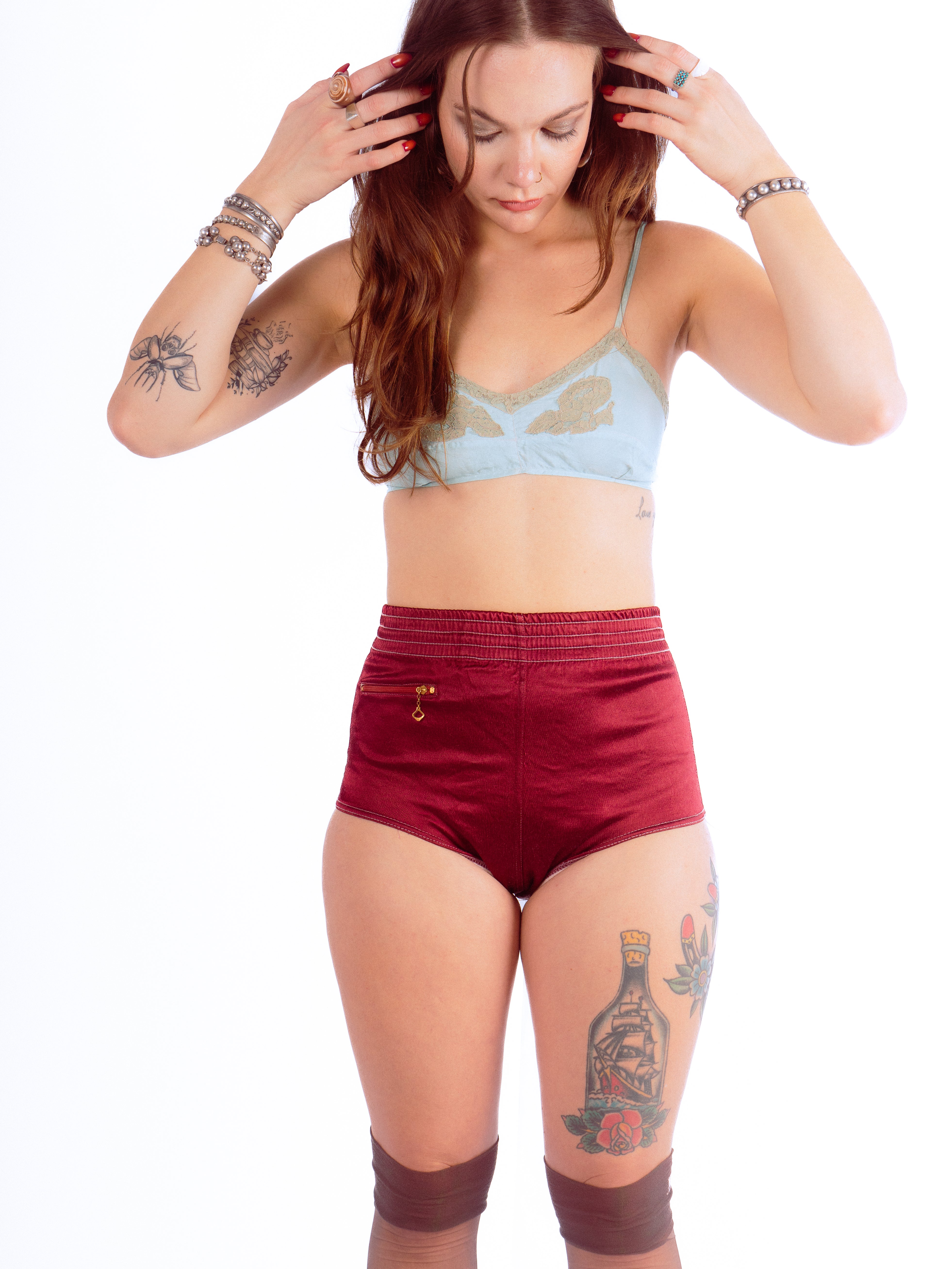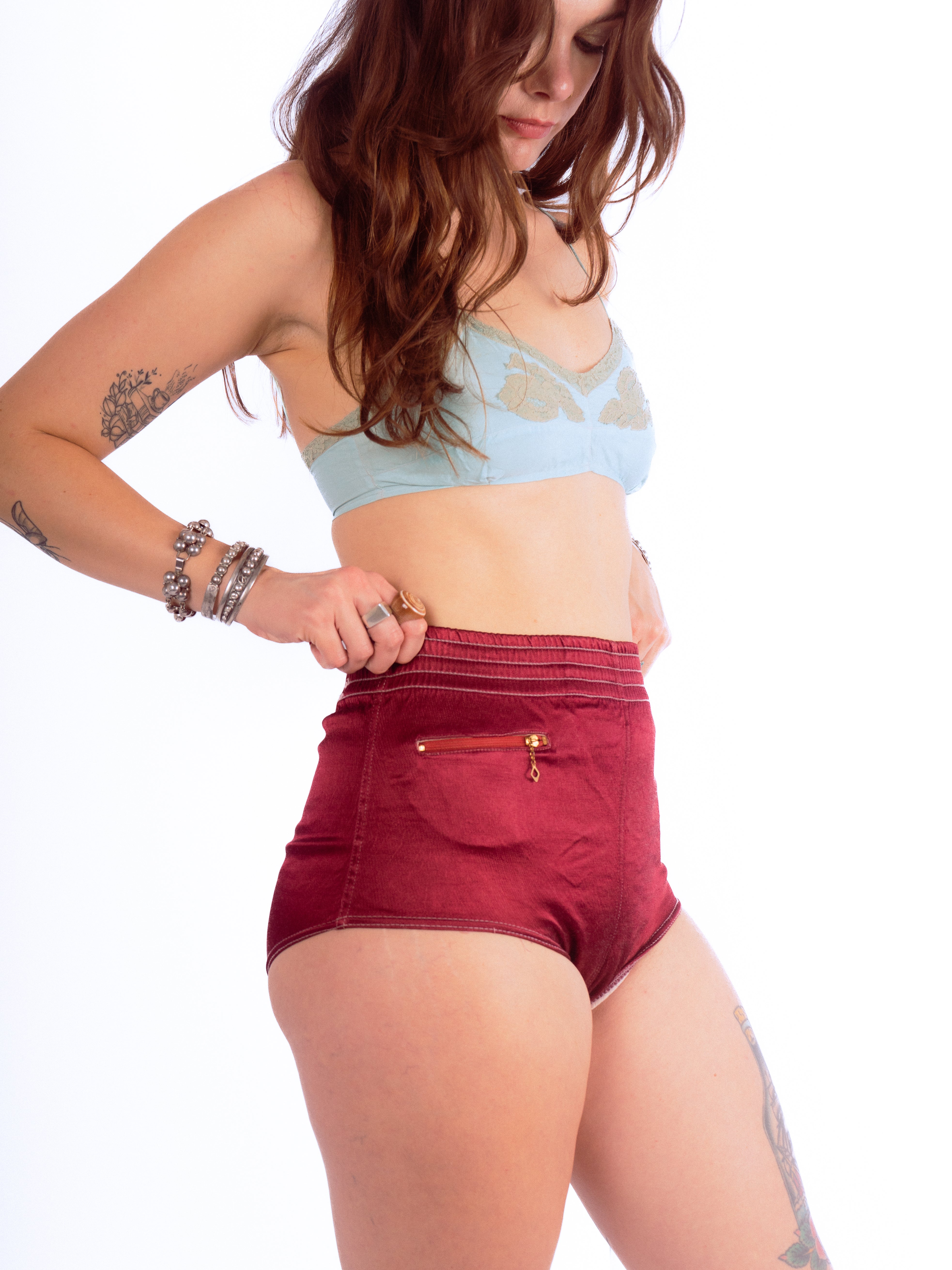 The cutest little black cherry satin athletic shorts with a small pocket and a Waldes USA chain zipper. These have a wide gusset and an elastic waist. Elastic is still functioning well. These feature ribbed cotton lining just on the front center panel. There are some loose threads on the seams but otherwise these are in great vintage condition.