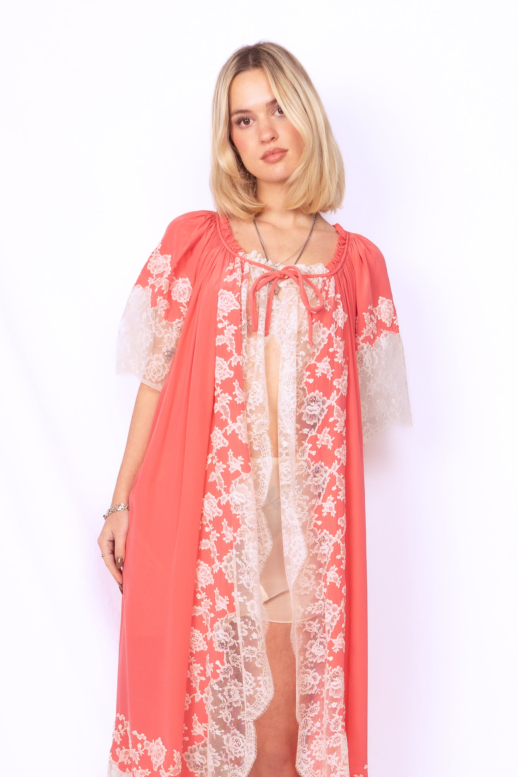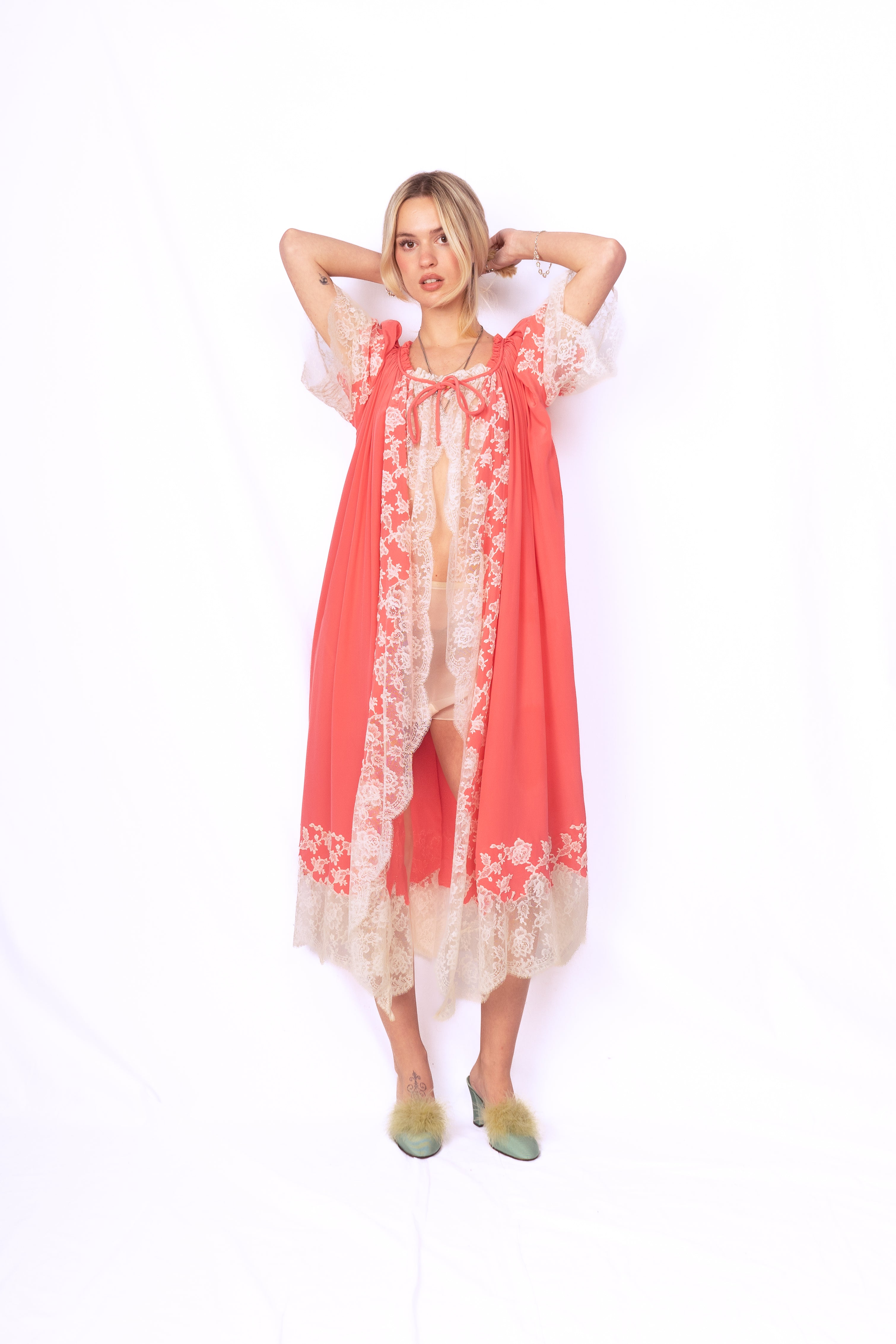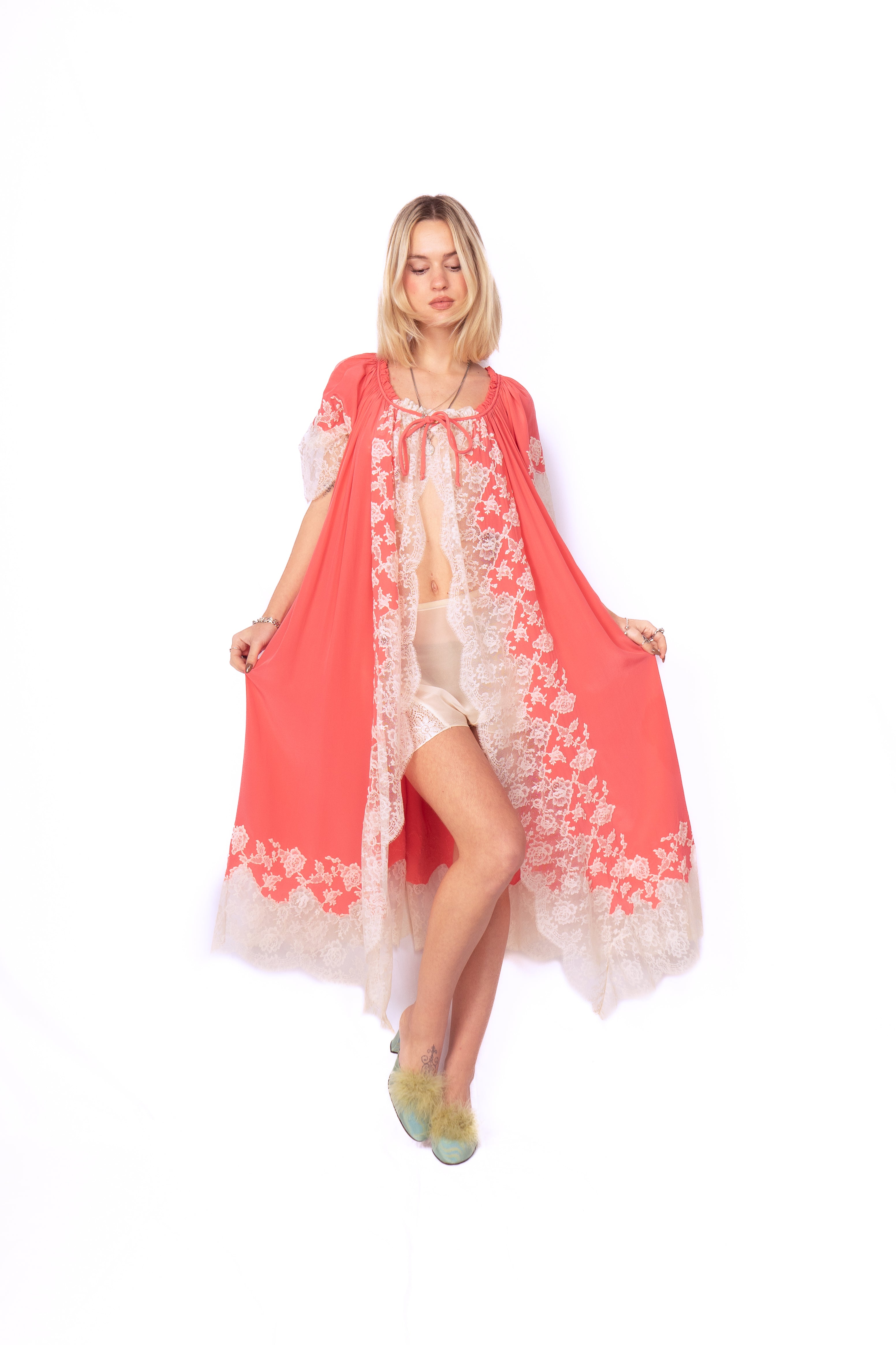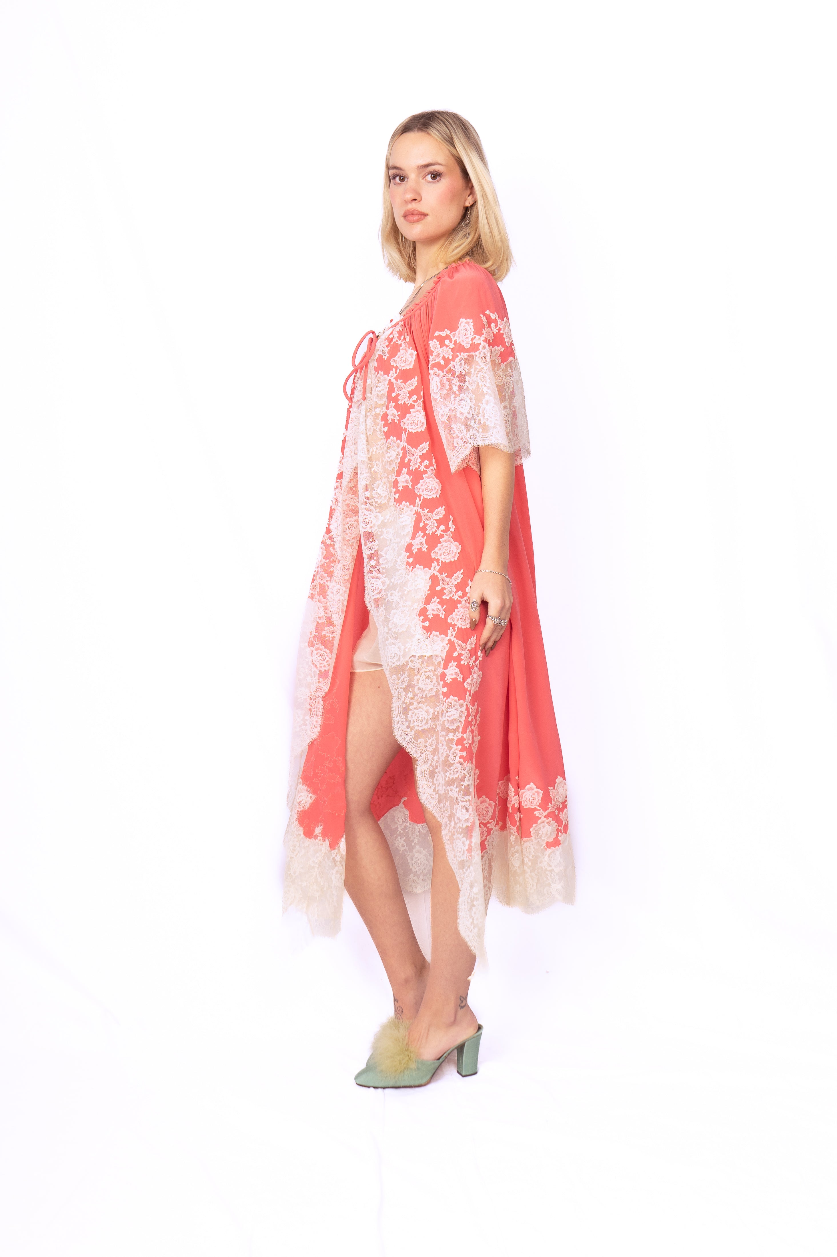 Incredible handmade pleated silk peignoir dressing gown with stark white scalloped lace trim and applique. Sleeves are trimmed in the same lace, and roses from the lace are cut and hand stitched, decorating the entire length of the seams. All made in the most vivid coral shade, featuring a bow closure at the top with a pearlescent button. In excellent condition, there is one small area that look paler than the rest of the fabric but it is nearly imperceptible. One Size.