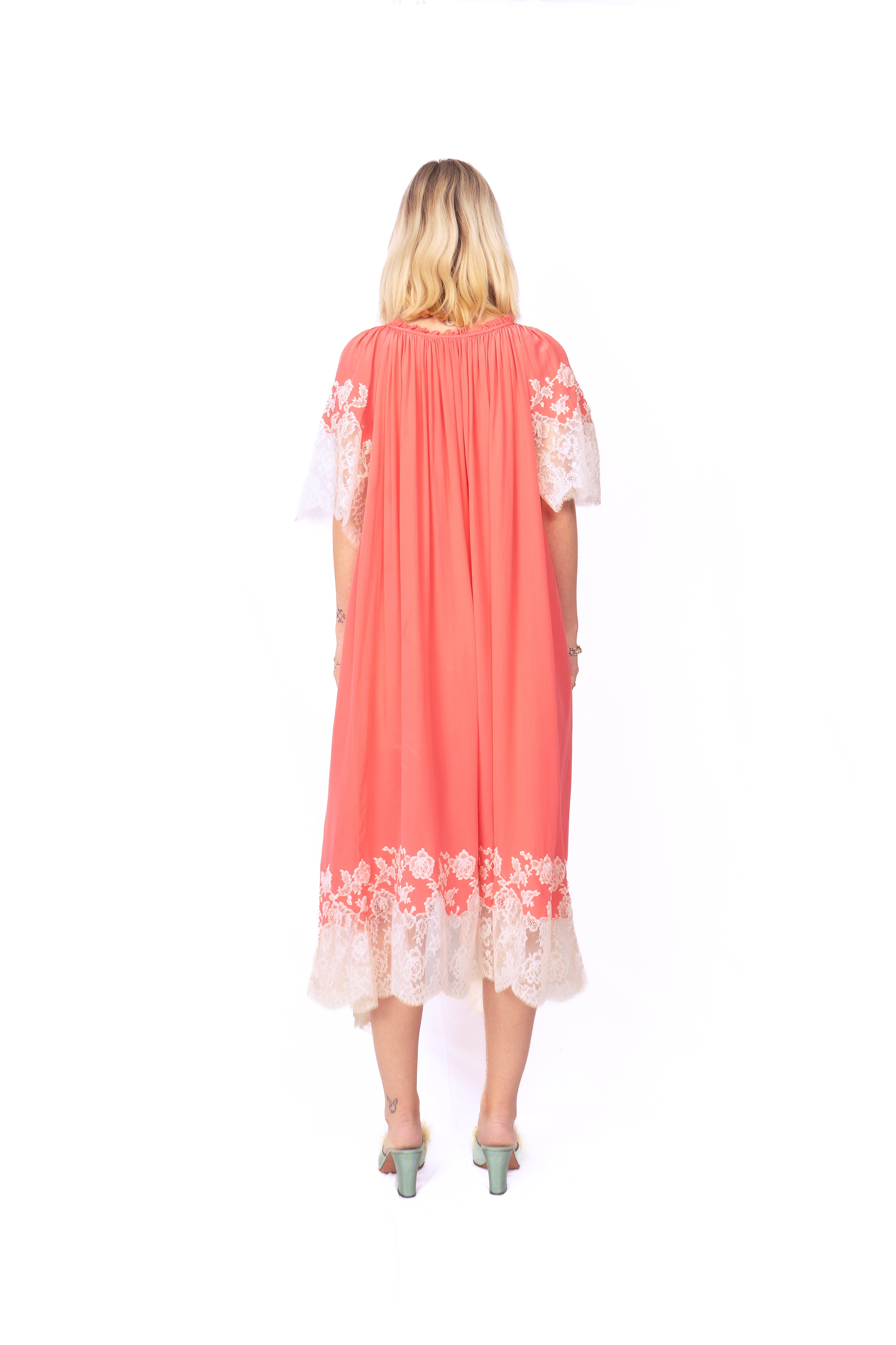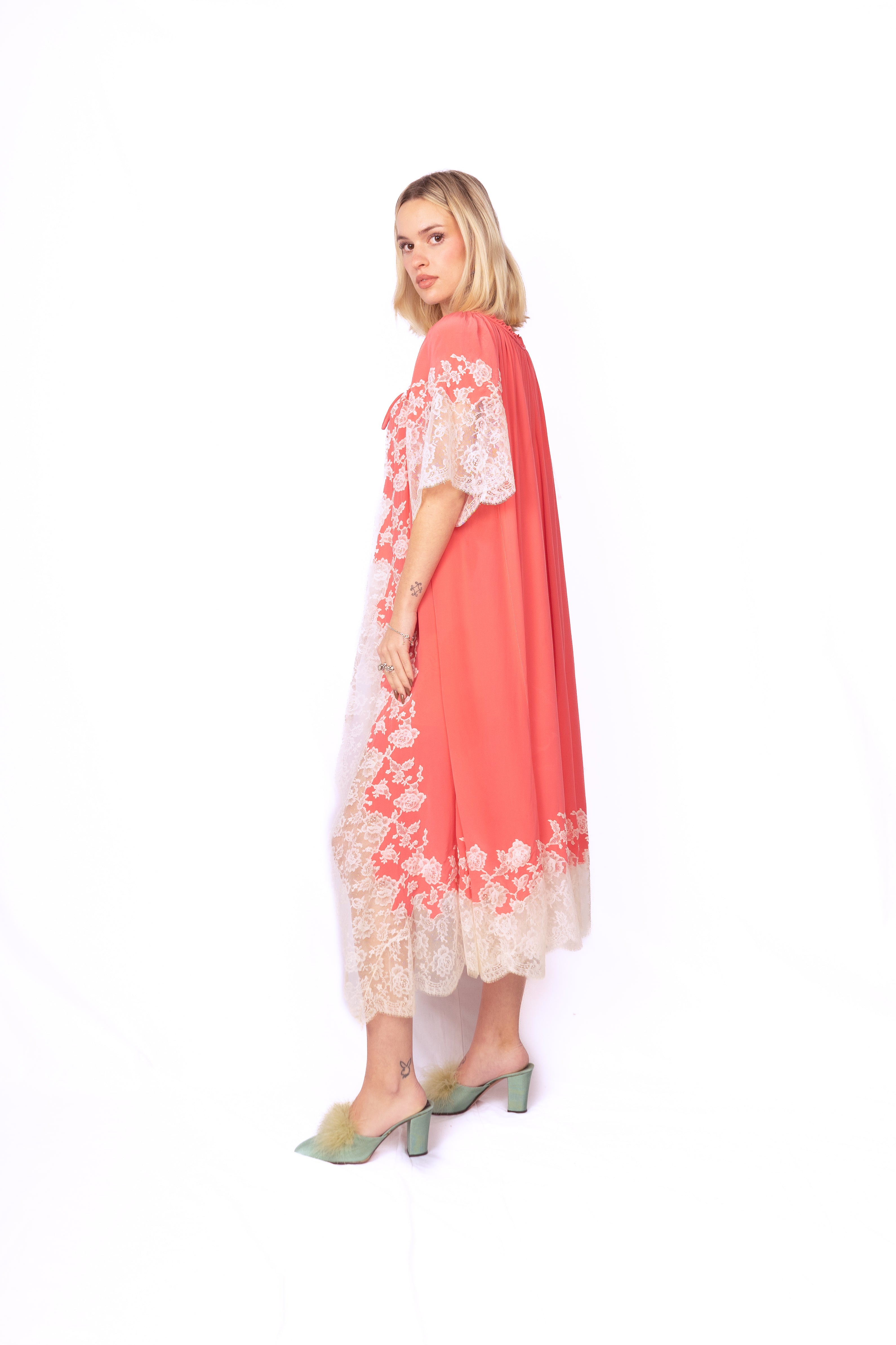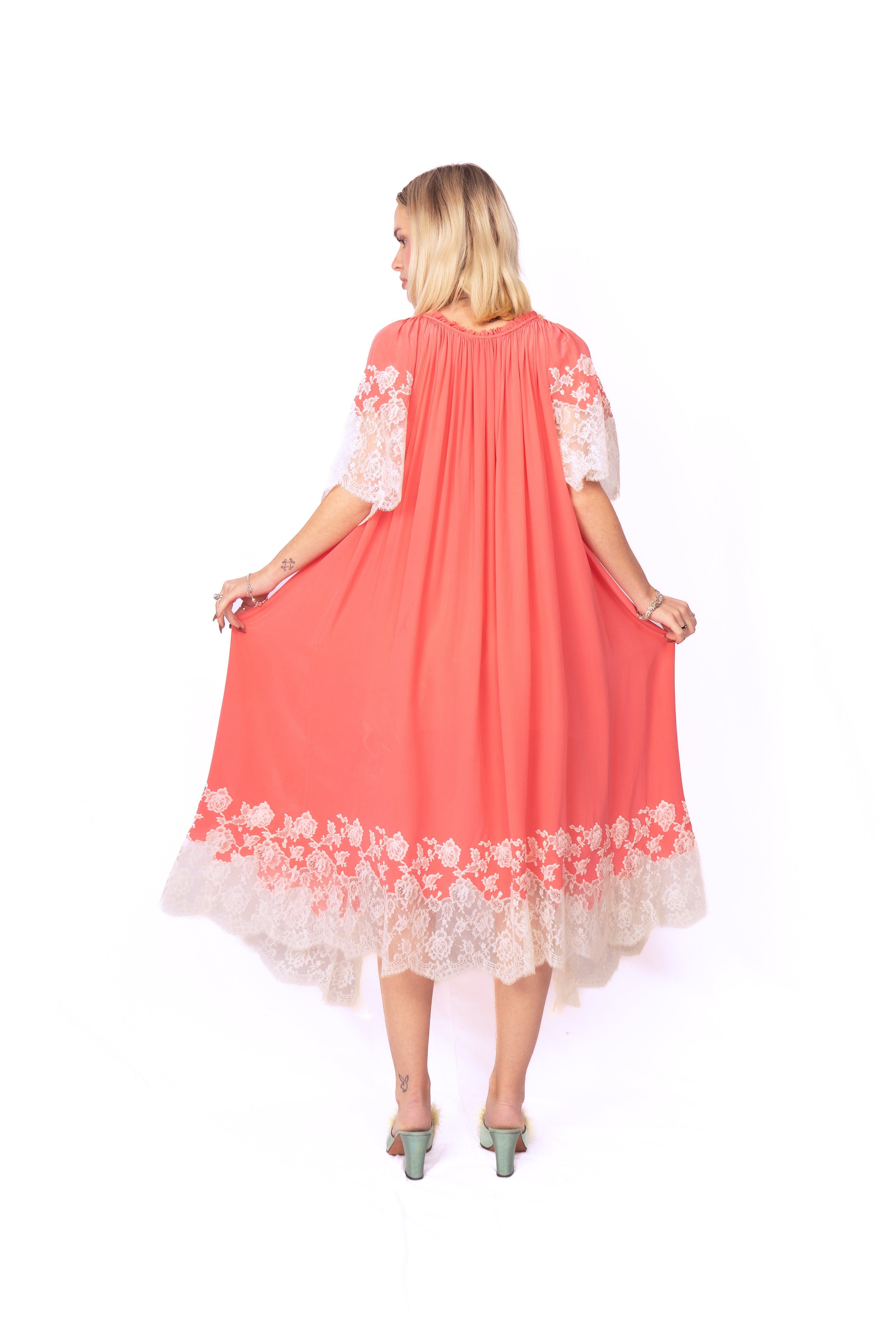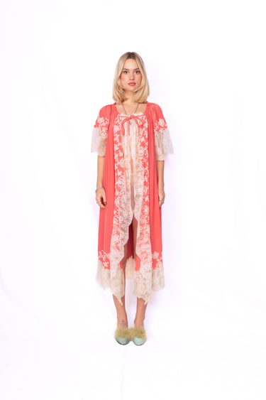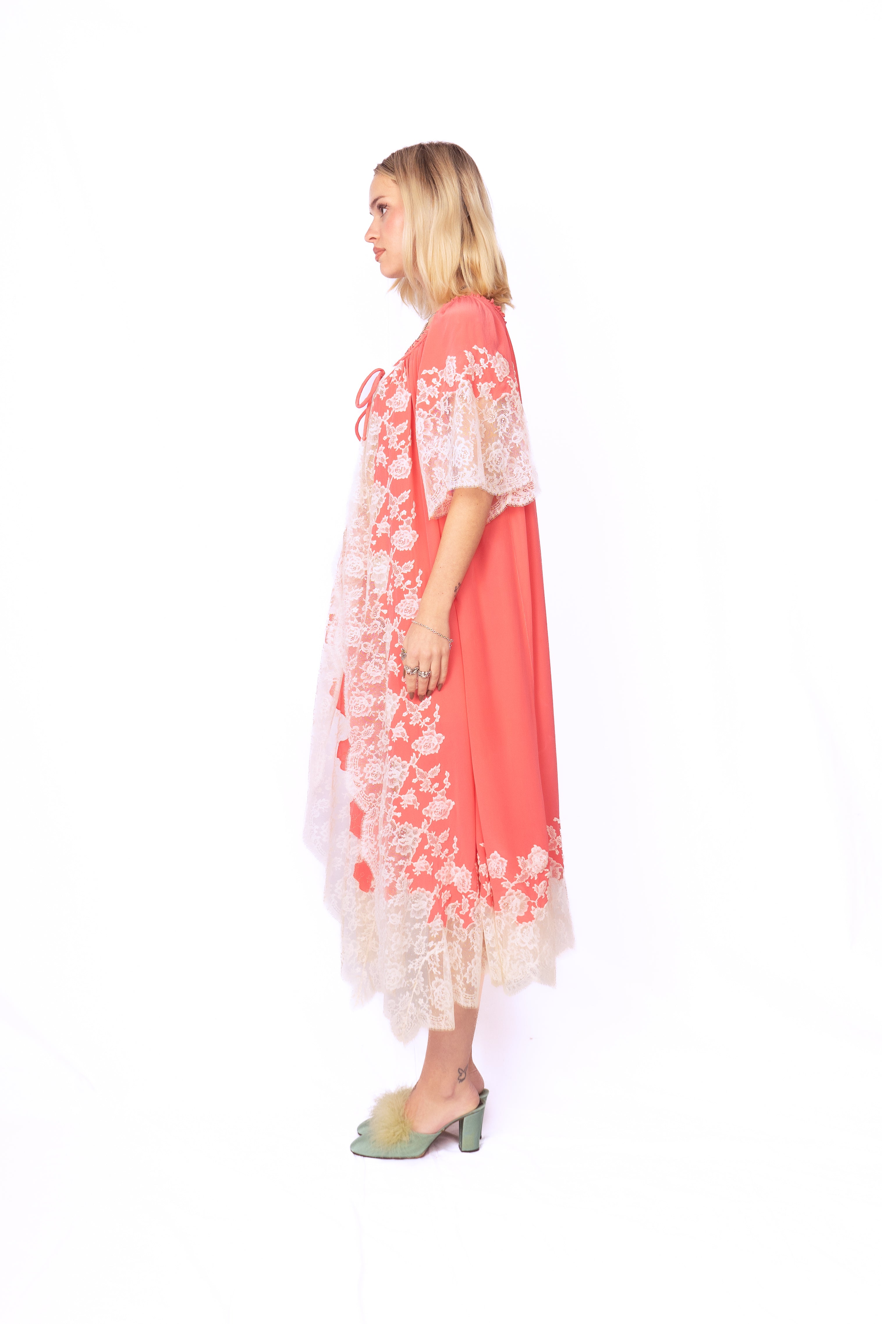 Incredible handmade pleated silk peignoir dressing gown with stark white scalloped lace trim and applique. Sleeves are trimmed in the same lace, and roses from the lace are cut and hand stitched, decorating the entire length of the seams. All made in the most vivid coral shade, featuring a bow closure at the top with a pearlescent button. In excellent condition, there is one small area that look paler than the rest of the fabric but it is nearly imperceptible. One Size.