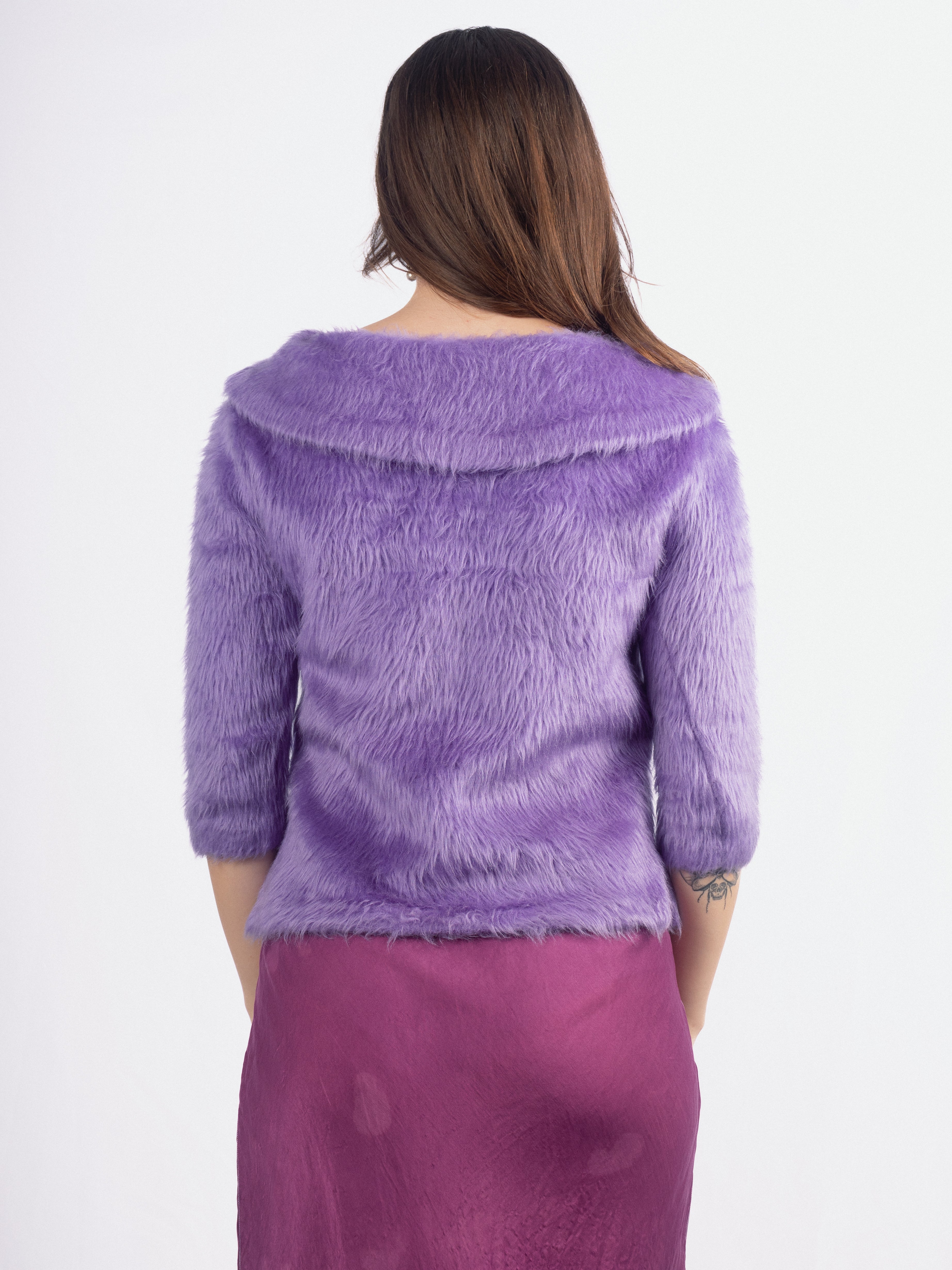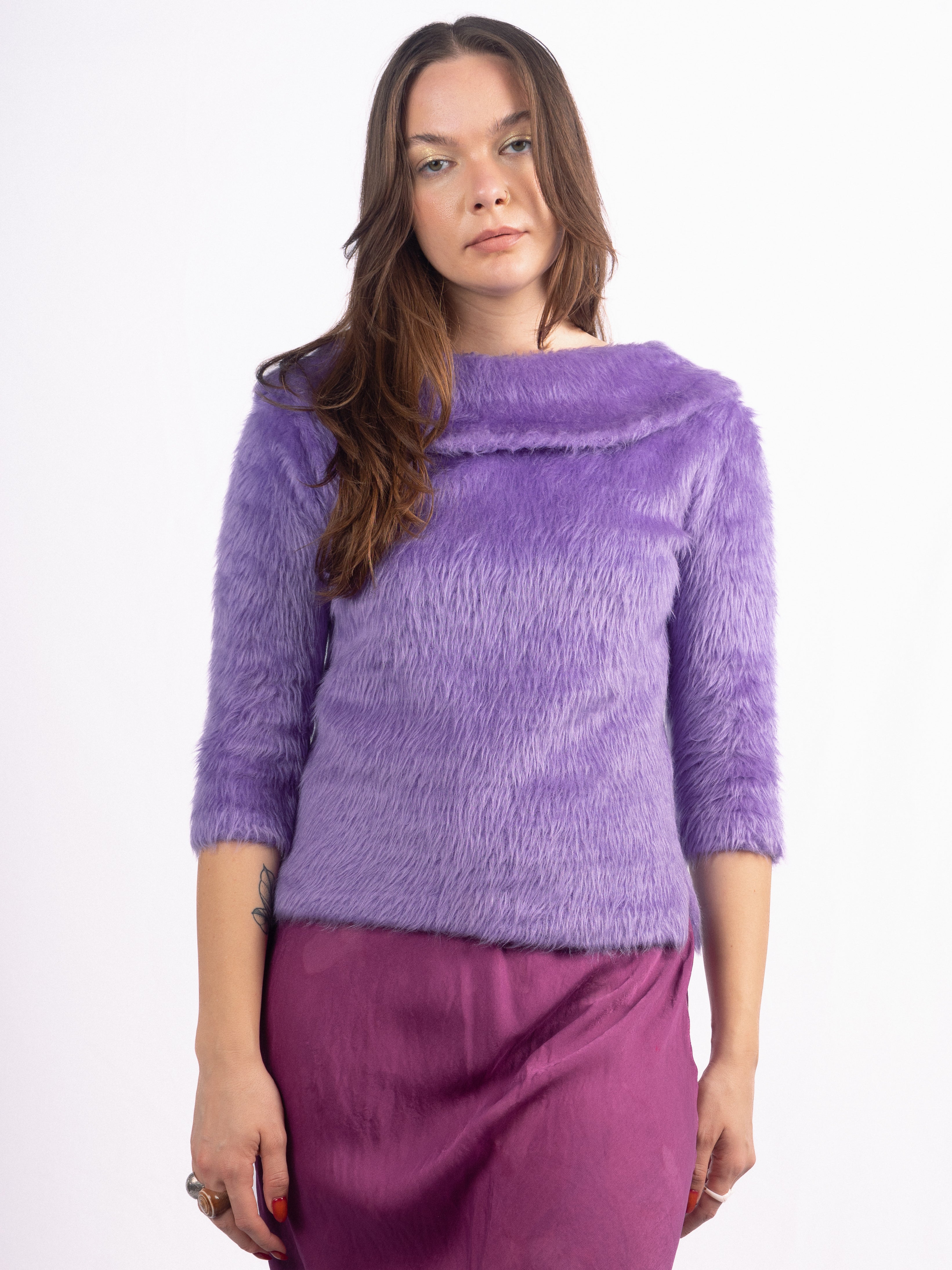 Super funky 90's lavender Jackie-O sweater top with 3/4 sleeves. We love this brushed fiber and the rolled neck collar. Kind of a classic silhouette with an avant-garde material. Mint condition.