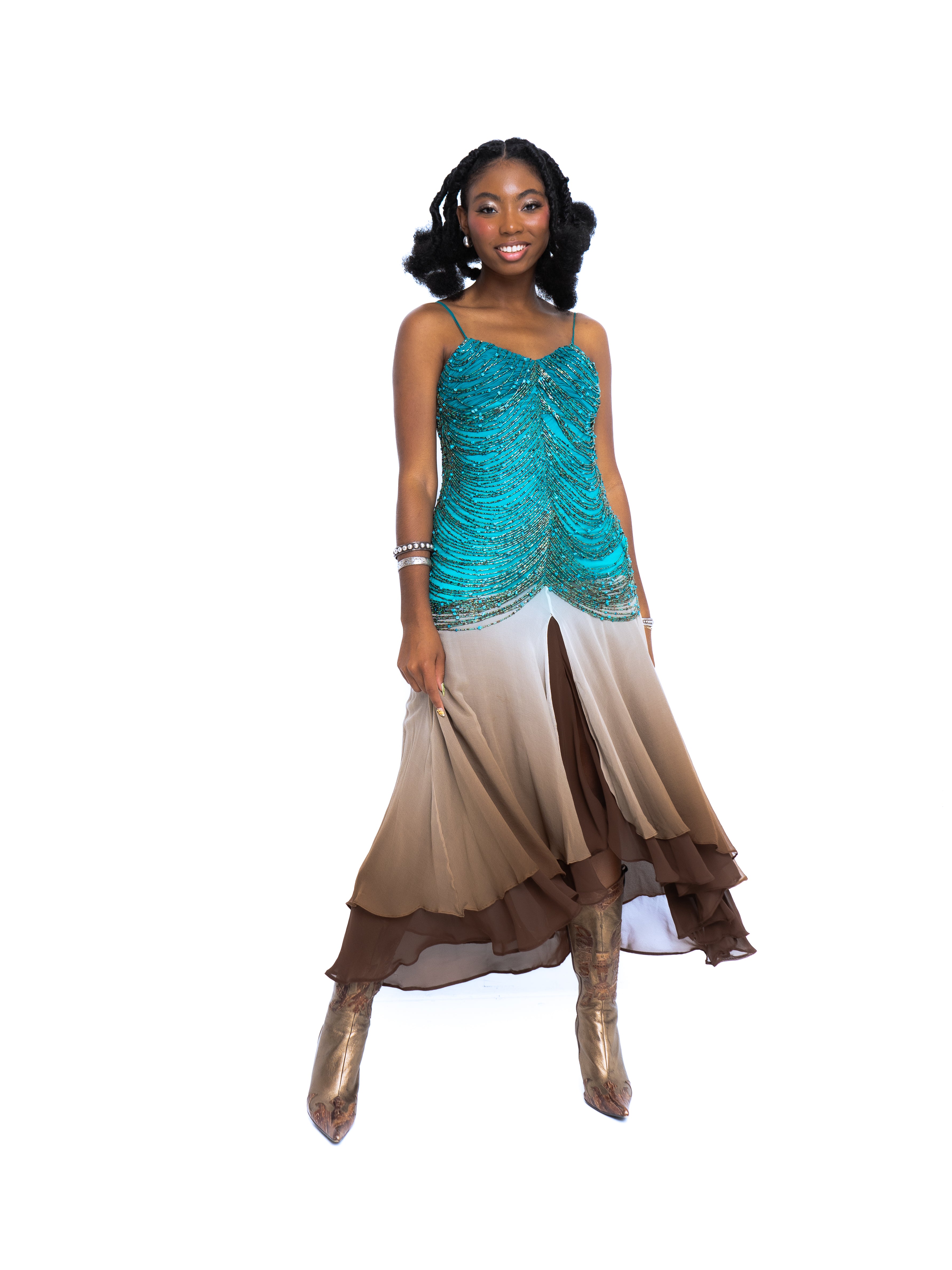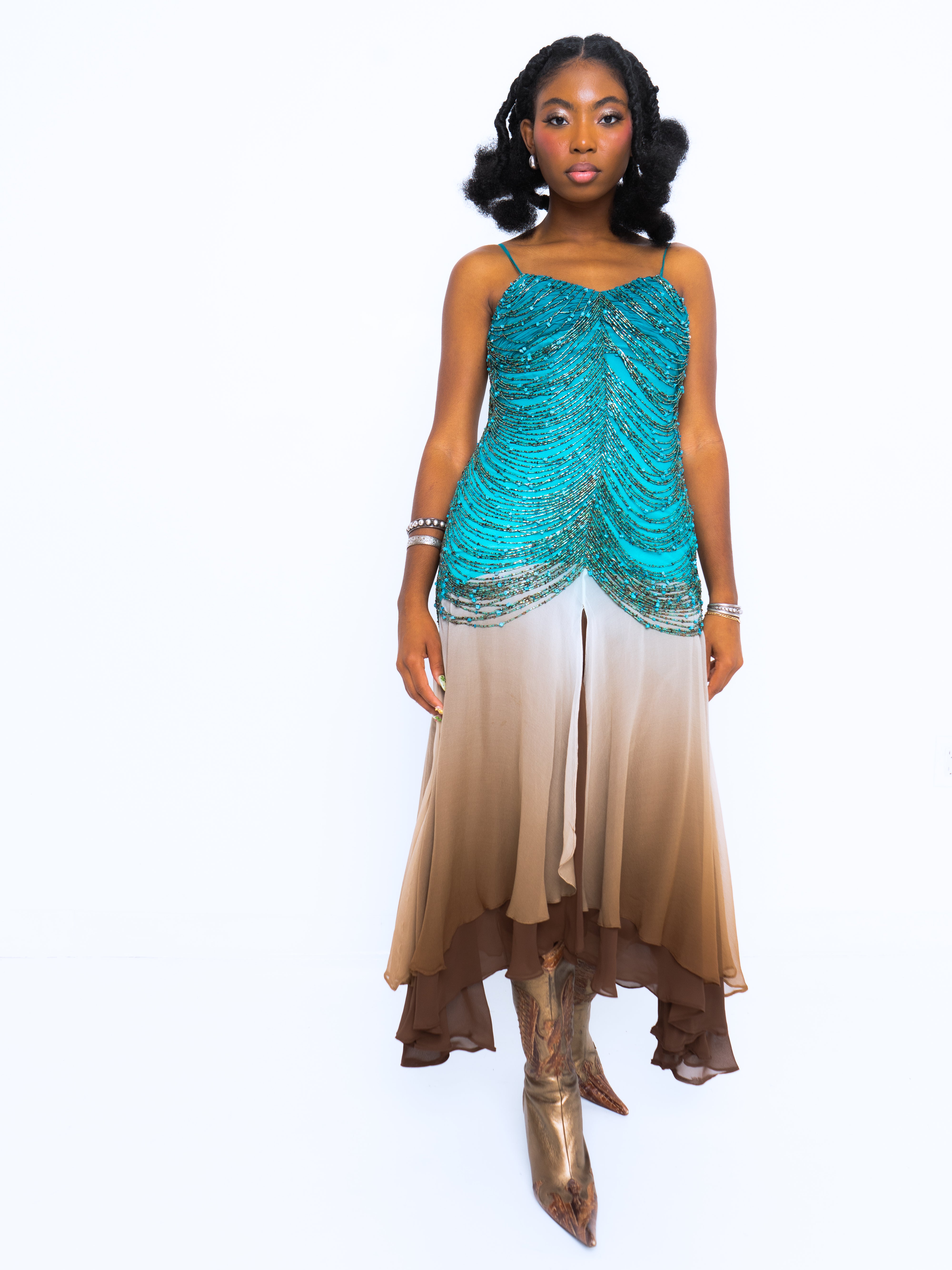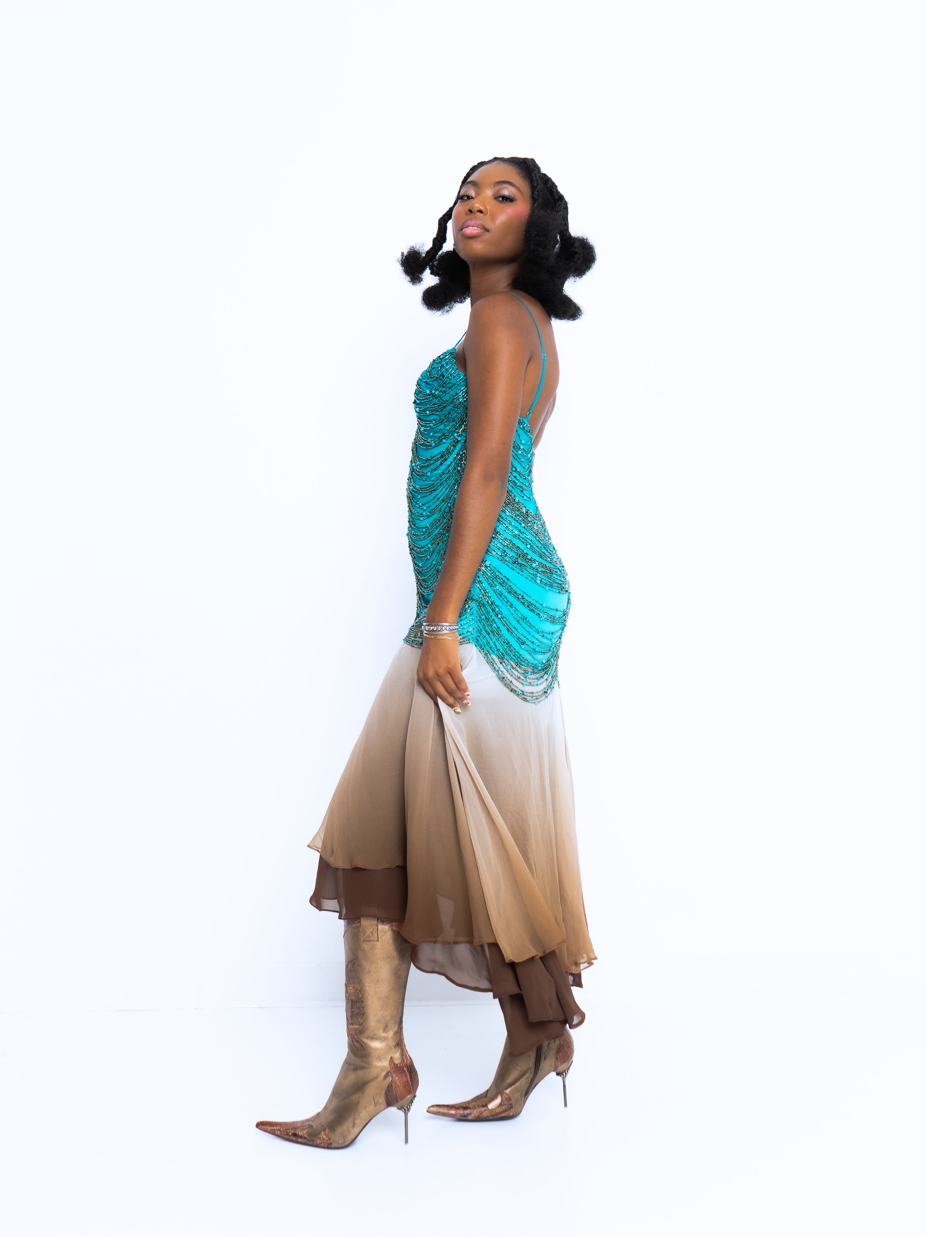 The most insane Sue Wong we have seen. Teal silk chiffon bodice features a rouched, pleated bust with contrasting ombre silk chiffon layered skirt. Spaghetti straps, back zipper, and the star of the show, the dozens and dozens of strands of turquoise, glass, and brown beads. This dress weighs a TON, but she is in great vintage condition.