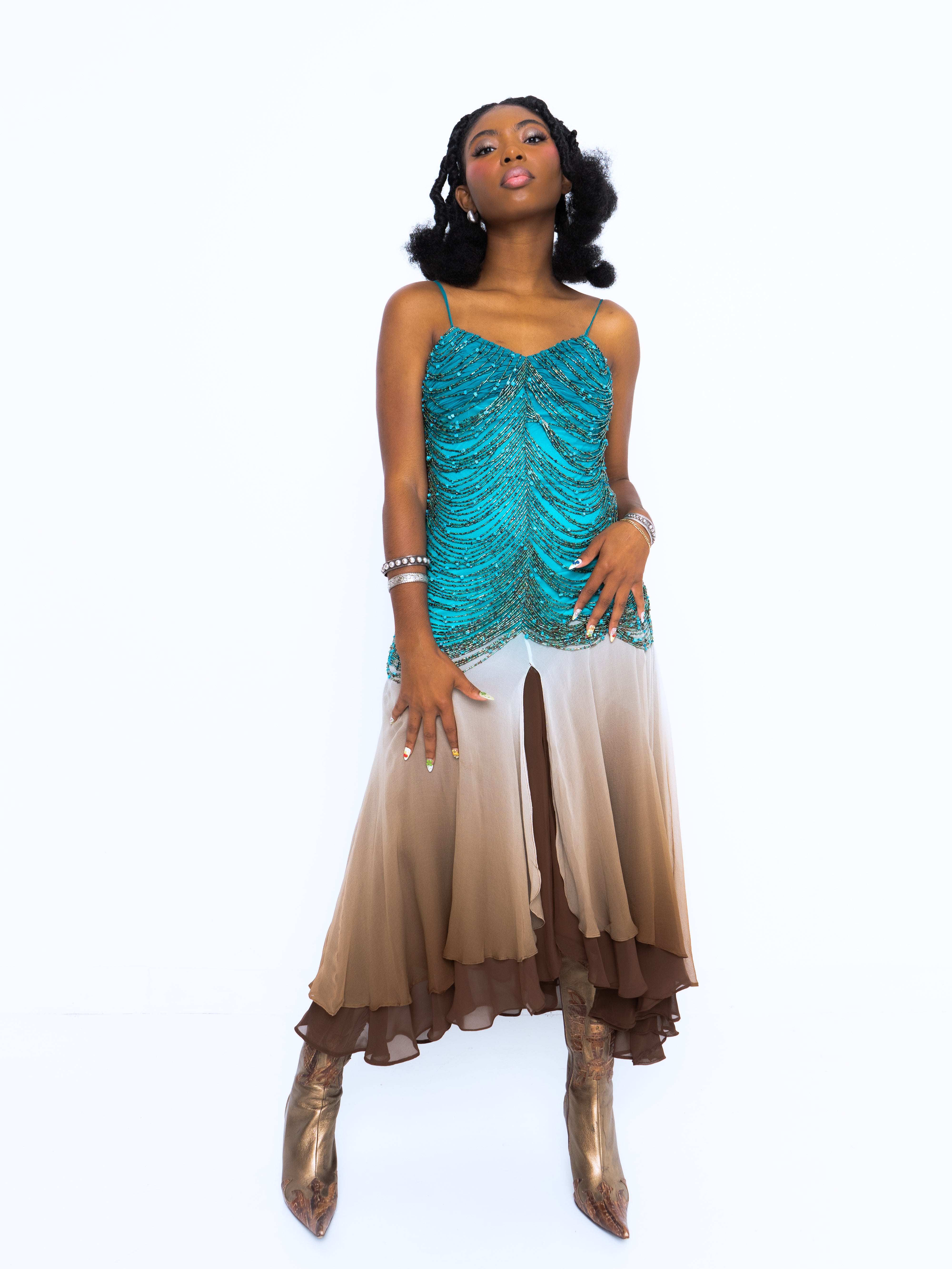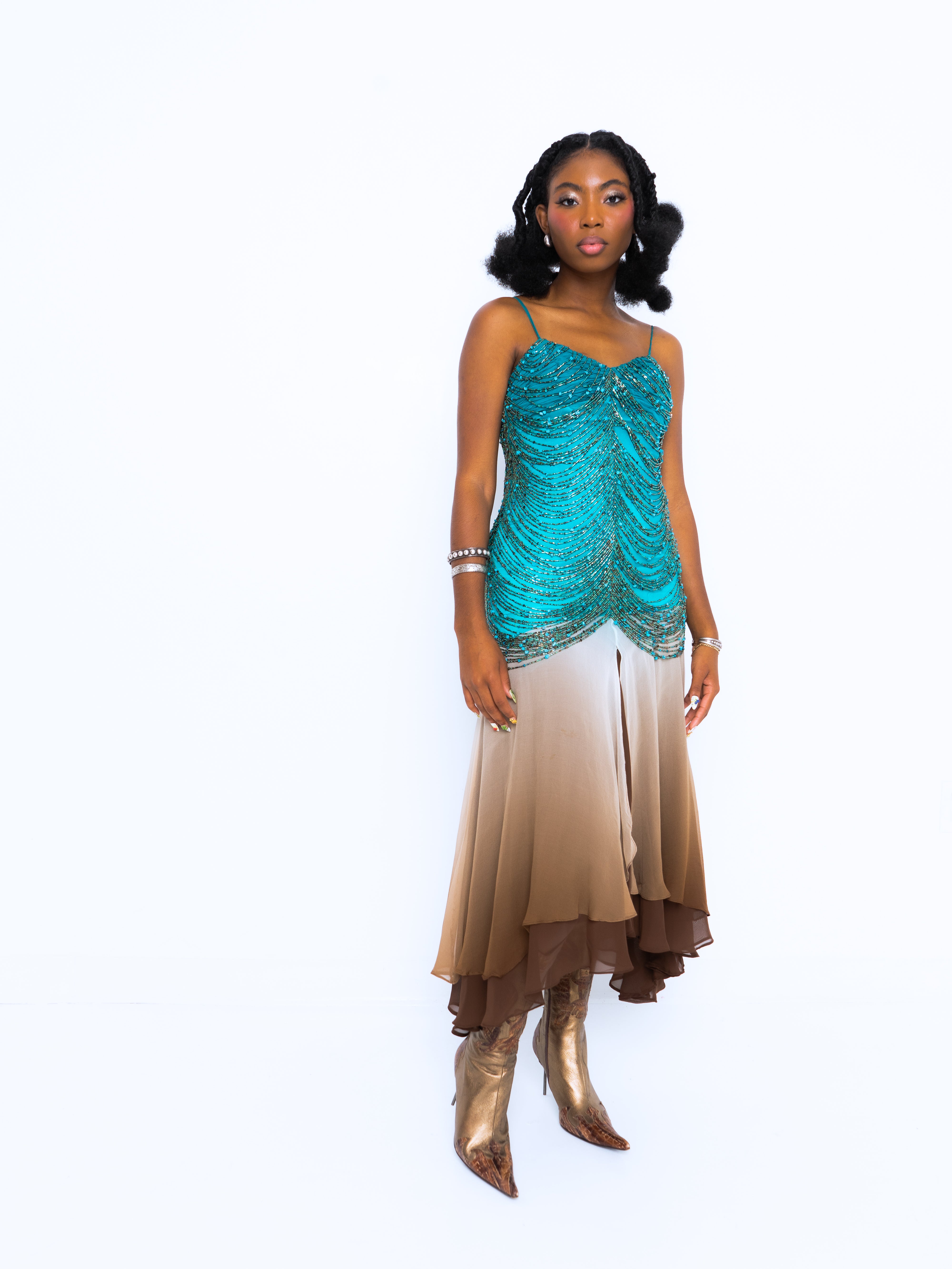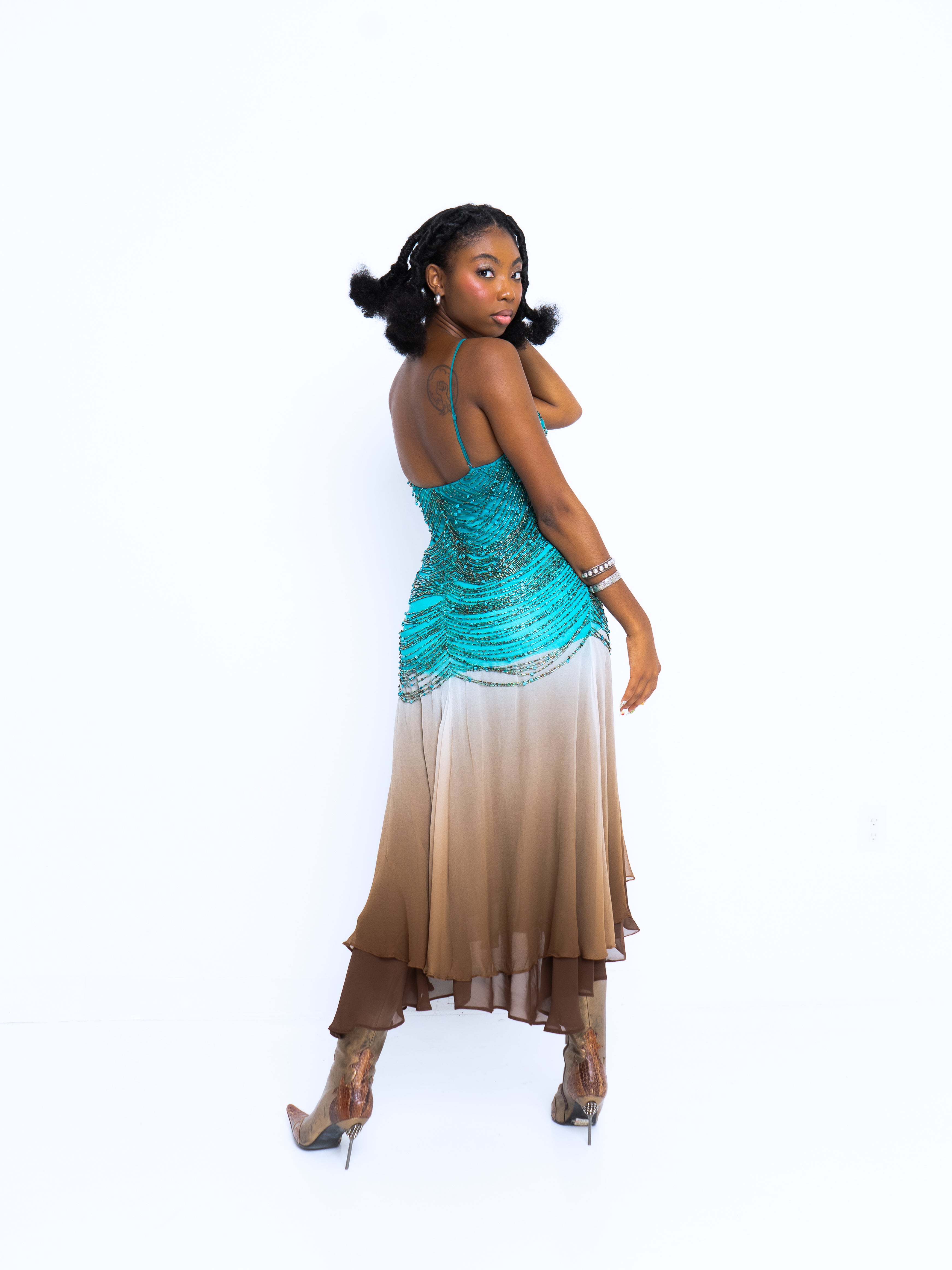The most insane Sue Wong we have seen. Teal silk chiffon bodice features a rouched, pleated bust with contrasting ombre silk chiffon layered skirt. Spaghetti straps, back zipper, and the star of the show, the dozens and dozens of strands of turquoise, glass, and brown beads. This dress weighs a TON, but she is in great vintage condition.